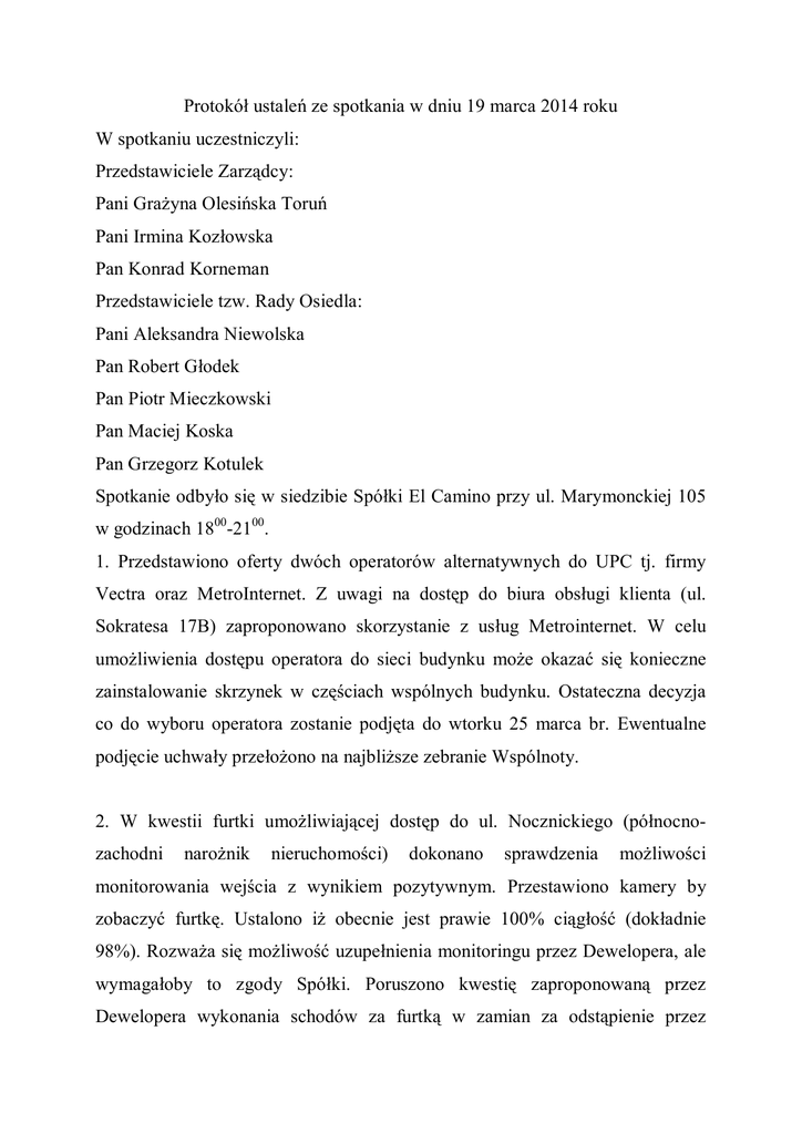 Protokół ustaleń ze spotkania w dniu 19 marca 2014 roku W spotkaniu uczestniczyli: Przedstawiciele Zarządcy: Pani Grażyna Olesińska Toruń Pani Irmina Kozłowska Pan Konrad Korneman Przedstawiciele tzw. Rady Osiedla: Pani Aleksandra Niewolska Pan Robert Głodek Pan Piotr Mieczkowski Pan Maciej Koska Pan Grzegorz Kotulek Spotkanie odbyło się w siedzibie Spółki El Camino przy ul. Marymonckiej 105 w godzinach 1800-2100. 1. Przedstawiono oferty dwóch operatorów alternatywnych do UPC tj. firmy Vectra oraz MetroInternet. Z uwagi na dostęp do biura obsługi klienta (ul. Sokratesa 17B) zaproponowano skorzystanie z usług Metrointernet. W celu umożliwienia dostępu operatora do sieci budynku może okazać się konieczne zainstalowanie skrzynek w częściach wspólnych budynku. Ostateczna decyzja co do wyboru operatora zostanie podjęta do wtorku 25 marca br. Ewentualne podjęcie uchwały przełożono na najbliższe zebranie Wspólnoty. 2. W kwestii furtki umożliwiającej dostęp do ul. Nocznickiego (północnozachodni narożnik nieruchomości) dokonano sprawdzenia możliwości monitorowania wejścia z wynikiem pozytywnym. Przestawiono kamery by zobaczyć furtkę. Ustalono iż obecnie jest prawie 100% ciągłość (dokładnie 98%). Rozważa się możliwość uzupełnienia monitoringu przez Dewelopera, ale wymagałoby to zgody Spółki. Poruszono kwestię zaproponowaną przez Dewelopera wykonania schodów za furtką w zamian za odstąpienie przez Wspólnotę od pobierania opłaty za reklamy. Rozwiązanie takie może okazać się niezgodne z prawem ponieważ Wspólnota nie posiada prawa do wydatkowania środków poza częściami wspólnymi nieruchomości w tym na gruntach, które nie są własnością Wspólnoty. Zaproponowano zamontowanie domofonu na furtce, ale w tym celu konieczne jest podjęcie stosownej uchwały. Zaproponowano rozwiązanie tymczasowe (do zamontowania domofonu) polegające na otworzeniu furtki wyposażonej w samozamykacz. Właściciele na swój koszt uzyskaliby klucze do furtki (sporządzona zostałaby lista chętnych na klucze z wcześniejszą przedpłatą). Takie rozwiązanie umożliwiłoby otworzenie furtki w przyszłym tygodniu. Podjęcie uchwały przełożono na najbliższe zebranie Wspólnoty. Spodziewany koszt domofonu to około 3000 pln. 3. Stworzenie funduszu rezerwowego, na który złożyłyby się pożytki pochodzące z reklam, odszkodowań za uszkodzone elementy. Zorganizowanie funduszy wymagałoby uchwały. Zwrócono uwagę na bardzo słabe zainteresowanie uchwałami właścicieli. Podjęcie uchwały przełożono na najbliższe zebranie Wspólnoty. 4. Zwrócono uwagę na wysokie koszty energii elektrycznej części wspólnych budynku. Z szacunków wynika, że w częściach wspólnych zużyto około 200 tysięcy kWh. Zaproponowano rozważenie zmiany dostawcy energii. Padła propozycja podnoszona wcześniej zmniejszenia natężenia oświetlenia części wspólnych. Kwestia ta może wymagać nakładów finansowych (wymiana oświetlenia). Propozycja – pozyskanie ofert od innych dostawców prądu 5. Poinformowano o zawieszeniu dodatkowych luster w garażu. Zaproponowano zamontowanie dodatkowego lustra bezpośrednio za wjazdem do garażu. Sprawa konieczności dodatkowego lustra zostanie sprawdzona w najbliższy wtorek. 6. Podniesiono kwestię demontażu osłon zabezpieczających w windach. Z uwagi na fakt braku sprzedaży 13 lokali w klatce nr I podjęto decyzję o zachowaniu osłon w tej klatce, a w pozostałych osłony będą sukcesywnie demontowane. Demontaż osłon będzie odbywał się w obecności Developera by od razu sporządzić ewentualny protokół szkód. 7. Poinformowano o prowadzonych przeglądach gwarancyjnych inwestycji/budynku. Protokół przeglądu nadal jest otwarty, na chwilę obecną nie można dokonać przeglądu np. zieleni z uwagi na brak wegetacji. Przegląd sukcesywnie będzie kontynuowany. Ewentualne zauważone usterki należy zgłaszać na bieżąco. Zarządca prześle do Rady Mieszkańców wstępny protokół. Wstępnie z oględzin wynika, iż najbardziej niepokojącym elementem jest garaż i zabezpieczenie go przed wodami gruntowymi. 8. Zaprezentowano pismo z 21 stycznia 2013 roku informujące o usterkach w obrębie drzwi szybu windowego na parterze klatki nr 7 (zarysowania montażowe) oraz uszkodzonego narożnika w garażu (sektor 5). Usterki te powstały przed 15 stycznia 2013 roku (data powstania Wspólnoty) i do chwili obecnej nie zostały usunięte. 9. Z uwagi na pojawiające się od właścicieli lokali pytania dotyczące przeglądów gwarancyjnych w lokalach należy przekazywać informacje, że przeglądów jako takich w lokalach nie będzie. Każdy właściciel w szeroko pojętym swoim interesie zobowiązany jest do zgłaszania usterek gwarancyjnych. Zarządzający budynkiem zobowiązali się do udostępnienia druków takiego zgłoszenia. 10. Podczas sprawdzania odczytów wodomierzy okazało się, że pojawiła się strata (niedobór) wody na poziomie ok. 500 m3. Przyczyną takiego stanu rzecz był pobór wody poza pomiarem do celów realizacji budowy Kolejnego etapu osiedla. Zarządzający budynkiem wyegzekwują od Inwestora zwrot kosztów wody. 11. W kwestii zalania garaży w miesiącu sierpniu przedstawiono informację, że po zalaniu zorganizowano spotkanie pomiędzy Spółką El Camino a Sokratesa Development. Podczas spotkania projektant mówił o błędach. Skierowano pismo do MPWiK, Spółka ta odmówiła przyjęcia odpowiedzialności za szkodę. Szkody do chwili obecnej nie zgłoszono do Ubezpieczyciela budynku. Na chwilę obecną istnieją zawilgocenia w garażu. Po 7 miesięcy od wystąpienia szkody nie ustalono jej przyczyny, nie skorzystano w tym zakresie z pomocy firmy ubezpieczającej budynek. Zarządcy zobowiązali się przejrzeć Ogólne Warunki Ubezpieczeń i zgłosić szkodę do Ubezpieczyciela. 12. Podano propozycję zorganizowania wspólnego spotkania Spółki El Camino, Sokratesa Development oraz