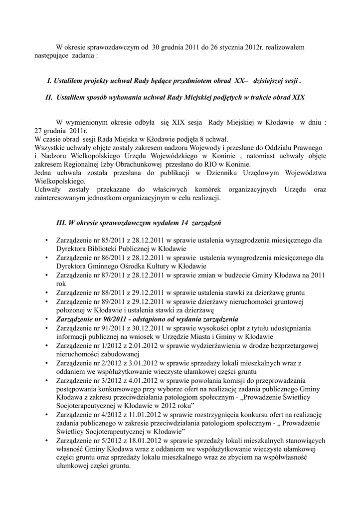 W okresie sprawozdawczym od 30 grudnia 2011 do 26 stycznia 2012r. realizowałem następujące zadania : I. Ustaliłem projekty uchwał Rady będące przedmiotem obrad XX– dzisiejszej sesji . II. Ustaliłem sposób wykonania uchwał Rady Miejskiej podjętych w trakcie obrad XIX W wymienionym okresie odbyła się XIX sesja Rady Miejskiej w Kłodawie w dniu : 27 grudnia 2011r. W czasie obrad sesji Rada Miejska w Kłodawie podjęła 8 uchwał. Wszystkie uchwały objęte zostały zakresem nadzoru Wojewody i przesłane do Oddziału Prawnego i Nadzoru Wielkopolskiego Urzędu Wojewódzkiego w Koninie , natomiast uchwały objęte zakresem Regionalnej Izby Obrachunkowej przesłano do RIO w Koninie. Jedna uchwała została przesłana do publikacji w Dzienniku Urzędowym Województwa Wielkopolskiego. Uchwały zostały przekazane do właściwych komórek organizacyjnych Urzędu oraz zainteresowanym jednostkom organizacyjnym w celu realizacji. III. W okresie sprawozdawczym wydałem 14 zarządzeń • • • • • • • • • • • • Zarządzenie nr 85/2011 z 28.12.2011 w sprawie ustalenia wynagrodzenia miesięcznego dla Dyrektora Biblioteki Publicznej w Kłodawie Zarządzenie nr 86/2011 z 28.12.2011 w sprawie ustalenia wynagrodzenia miesięcznego dla Dyrektora Gminnego Ośrodka Kultury w Kłodawie Zarządzenie nr 87/2011 z 28.12.2011 w sprawie zmian w budżecie Gminy Kłodawa na 2011 rok Zarządzenie nr 88/2011 z 29.12.2011 w sprawie ustalenia stawki za dzierżawę gruntu Zarządzenie nr 89/2011 z 29.12.2011 w sprawie dzierżawy nieruchomości gruntowej położonej w Kłodawie i ustalenia stawki za dzierżawę Zarządzenie nr 90/2011 - odstąpiono od wydania zarządzenia Zarządzenie nr 91/2011 z 30.12.2011 w sprawie wysokości opłat z tytułu udostępniania informacji publicznej na wniosek w Urzędzie Miasta i Gminy w Kłodawie Zarządzenie nr 1/2012 z 2.01.2012 w sprawie wydzierżawienia w drodze bezprzetargowej nieruchomości zabudowanej Zarządzenie nr 2/2012 z 3.01.2012 w sprawie sprzedaży lokali mieszkalnych wraz z oddaniem we współużytkowanie wieczyste ułamkowej części gruntu Zarządzenie nr 3/2012 z 4.01.2012 w sprawie powołania komisji do przeprowadzania postępowania konkursowego przy wyborze ofert na realizację zadania publicznego Gminy Kłodawa z zakresu przeciwdziałania patologiom społecznym - „Prowadzenie Świetlicy Socjoterapeutycznej w Kłodawie w 2012 roku” Zarządzenie nr 4/2012 z 11.01.2012 w sprawie rozstrzygnięcia konkursu ofert na realizację zadania publicznego w zakresie przeciwdziałania patologiom społecznym - „ Prowadzenie Świetlicy Socjoterapeutycznej w Kłodawie” Zarządzenie nr 5/2012 z 18.01.2012 w sprawie sprzedaży lokali mieszkalnych stanowiących własność Gminy Kłodawa wraz z oddaniem we współużytkowanie wieczyste ułamkowej części gruntu oraz sprzedaży lokalu mieszkalnego wraz ze zbyciem na współwłasność ułamkowej części gruntu. • • Zarządzenie nr 6/2012 z 20.01.2012 w sprawie zmian w budżecie Gminy Kłodawa na 2012 rok Zarządzenie nr 7/2012 z 25.01.2012 w sprawie rozłożenia na raty wierzytelności z tytułu najmu lokalu mieszkalnego oraz umorzenia odsetek IV. W zakresie działalności gospodarczej Zgodnie z ustawą o swobodzie działalności gospodarczej, która weszła w życie 1 lipca 2011 roku gminy miały obowiązek przekazać dane o podmiotach gospodarczych (baza ewidencji działalności gospodarczej) do Ministerstwa Gospodarki do 31 grudnia 2011 roku. Dane podmiotów naszej Gminy zostały przekazane w całości do wyznaczonego terminu. Od 1 stycznia 2012 roku funkcjonuje Centralna Ewidencja i Informacja o Działalności Gospodarczej (CEIDG). System teleinformatyczny CEIDG umożliwia przedsiębiorcom rejestrację działalności gospodarczej online (przez Internet) za pośrednictwem Gminy lub samodzielnie, jeżeli przedsiębiorca posiada certyfikowany podpis elektroniczny. V. W zakresie zamówień publicznych i funduszy europejskich Zamówienia publiczne 1. W dniu 11-01-2012 r. zostało wszczęte postępowanie w sprawie udzielenia zamówienia na świadczenie usług przewozu osób na potrzeby gminy Kłodawa w roku 2012. Przetarg obejmuje usługi przewozu dzieci do szkół w I półroczu 2012- do 29.06.2012 r. Zamówienie prowadzono w trybie przetargu nieograniczonego. Termin składania ofert ustalono na dzień 19-01-2012r. Wpłynęły 2 oferty przetargowe. Ze względu na przyjęte kryterium cena bruttoznaczenie 100%, za najkorzystniejszą uznano ofertę, zgodną formalnie i merytorycznie ze SIWZ postępowania oraz złożoną w wymaganym terminie przez Wykonawcę: USŁUGI – PRZEWÓZ OSÓB URSZULA DOPIERAŁA, KORZECZNIK – PODLESIE, 62-620 BABIAK, z ceną ofertową za wykonanie przedmiotu zamówienia w wysokości: 848,32 zł brutto za 1 dzień świadczenia usługi przewozu osób łącznie autobusem i busem z zapewnioną opieką. Umowa z Wykonawca zostanie podpisana 31 stycznia 2012 r. 2. W dniu 19-01-2012 r. zostało wszczęte postępowanie w trybie przetargu nieograniczonego w sprawie udzielenia zamówienia na świadczenie usługi niepriorytetowej (edukacyjnej) realizowanej przez gminę Kłodawa zgodnie z założeniami projektu współfinansowanego przez UE: Europrzedszkolaki z Solnej Doliny. Termin składania ofert ustalono na dzień 27.01.2012 r. 3. W dniu 19-01-2012 r. zostało wszczęte postępowanie w trybie przetargu nieograniczonego w sprawie udzielenia zamówienia na Dostawę Oleju Napędowego Na Potrzeby Gminy Kłodawa w roku 2012 r. Termin składania ofert ustalono na dzień 27.01.2012 r. 4. W dniu 24.01.2012 r. zostało wszczęte postępowanie w sprawie udzielenia zamówienia na wykonanie prac związanych z realizacją operacji pt. Modernizacja i remont świetlicy wiejskiej w Zbójnie” współfinansowanej ze środków Unii Europejskiej – PROW 2007 – 2013. Termin składania ofert ustalono na dzień 31.01.2012 r. VI. W zakresie spraw komunalnych Dodatki mieszkaniowe W miesiącu stycz