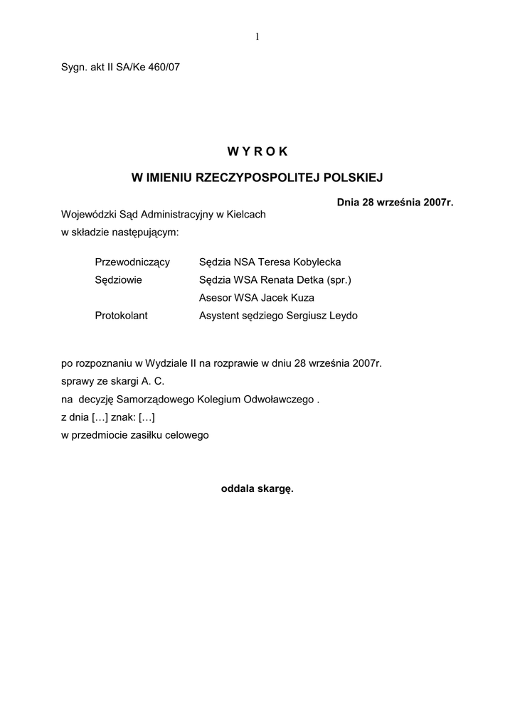 1 Sygn. akt II SA/Ke 460/07 WYROK W IMIENIU RZECZYPOSPOLITEJ POLSKIEJ Dnia 28 września 2007r. Wojewódzki Sąd Administracyjny w Kielcach w składzie następującym: Przewodniczący Sędzia NSA Teresa Kobylecka Sędziowie Sędzia WSA Renata Detka (spr.) Asesor WSA Jacek Kuza Protokolant Asystent sędziego Sergiusz Leydo po rozpoznaniu w Wydziale II na rozprawie w dniu 28 września 2007r. sprawy ze skargi A. C. na decyzję Samorządowego Kolegium Odwoławczego . z dnia […] znak: […] w przedmiocie zasiłku celowego oddala skargę. 2 Sygn. akt II SA/Ke 460/07 Uzasadnienie Decyzją z dnia 27 września 2004 r. Samorządowe Kolegium Odwoławcze po rozpoznaniu odwołania A. C. od decyzji wydanej z upowaŜnienia Prezydenta Miasta, odmawiającej przyznania pomocy społecznej w formie zasiłku celowego w miesiącu sierpniu 2004 r. w kwocie […] z przeznaczeniem na pokrycie kosztów podróŜy i posiłków w czasie pobytu na rozprawach w dniach 20 sierpnia 2004 r. i 30 sierpnia 2004 r. przed Wojewódzkim Sądem Administracyjnym w Krakowie na podstawie art. 138 § 1 pkt 1 ustawy z dnia 14 czerwca 1960 r. Kodeks postępowania administracyjnego, utrzymało w mocy zaskarŜoną decyzję. W uzasadnieniu rozstrzygnięcia organ odwoławczy ustalił, Ŝe A. C. wnioskiem z dnia 5 sierpnia 2005 r. zwrócił się do Miejskiego Ośrodka Pomocy Rodzinie o przyznanie biletu kredytowanego lub zasiłku celowego na przejazdy do Krakowa w dniach 20 sierpnia 2004 r. i 30 sierpnia 2004 r. celu wzięcia udziału w 30 rozprawach przed WSA w Krakowie. Decyzją z dnia 11 […]organ I instancji, odmówił przyznania A. C. pomocy społecznej wskazując, Ŝe stawiennictwo na rozprawach nie jest obowiązkowe. Ponadto organ podkreślił, Ŝe nie przyznaje środków na ten cel z uwagi na ograniczone zasoby finansowe. Organ wskazał, Ŝe A. C. został przyznany zasiłek celowy na dojazd do Krakowa na poprzednie rozprawy i Ŝe takich rozpraw będzie duŜo, gdyŜ od kaŜdej decyzji z zakresu pomocy społecznej zainteresowany składa odwołanie. Odwołanie od powyŜszego rozstrzygnięcia złoŜył A. C. podnosząc, Ŝe bezzasadnie odmówiono mu zasiłku celowego oraz, Ŝe uczestnictwo w rozprawach jest dla niego bardzo waŜne z uwagi na poczucie godności i sprawiedliwości i Ŝe nie jest prawdą, Ŝe jego spraw jest duŜo, bowiem nie odwołuje się od kaŜdej decyzji, a jedynie od rozstrzygnięć dla niego niekorzystnych. SkarŜący wniósł o rozpatrzenie jego odwołania na rozprawie jawnej i o przesłuchanie m.in. Prezydenta i Wiceprezydenta Miasta K. oraz Dyrektora Miejskiego Ośrodka Pomocy Rodzinie. Rozpatrując sprawę w postępowaniu odwoławczym, Samorządowe Kolegium Odwoławcze podniosło, Ŝe wprawdzie A. C. odpowiada warunkom ogólnym, uprawniającym do ubiegania się o świadczenie pienięŜne z pomocy społecznej, gdyŜ jest osobą bezrobotną bez prawa do zasiłku, jednakŜe wszystkie jego skargi dotyczą z reguły spraw z zakresu pomocy celowej i okresowej, a Wojewódzki Sąd Administracyjny w Krakowie rozpatrując poprzednie sprawy wydał wyroki, którymi oddalił jego skargi. W 3 przekonaniu organu II instancji nie jest konieczny udział skarŜącego w rozprawach sądowych, tym bardziej Ŝe stawiennictwo przed Sądem nie jest obowiązkowe. Skargę na powyŜsze rozstrzygnięcie złoŜył do Wojewódzkiego Sądu Administracyjnego w Kielcach A. C. i zarzucając naruszenie art. 2,7,30,32 i 45 Konstytucji oraz art. 10 i 89 k.p.a. Autor skargi wskazał, Ŝe zaskarŜoną decyzją odmówiono mu udziału w rozprawach przed Wojewódzkim Sądem Administracyjnym, na których rozpoznawano 30 spraw z jego skarg pod pretekstem, Ŝe juŜ raz był na rozprawach i jego skargi zostały oddalone, co zdaniem skarŜącego jest „ złośliwym tłumaczeniem”, bowiem kaŜda sprawa jest indywidualna. Pozbawiono go tym samym moŜności obrony „poczucia godności i elementarnej sprawiedliwości jak teŜ reprezentowania interesu prawnego”. Zarzucił ponadto, iŜ o tym, Ŝe postępowanie w jego sprawie prowadzone jest „nieuwaŜnie” świadczy fakt, Ŝe Kolegium powtarza błąd organu I instancji, jakoby ubiegał się on o zasiłek w kwocie […] podczas, gdy ubiega się o kwotę […] do tak istotnych uchybień nie doszłoby, gdyby prowadzono postępowanie odwoławcze z jego udziałem i przeprowadzono rozprawę – czego się „bezskutecznie” domaga „od wielu lat” w oparciu o art. 89 kpa. W odpowiedzi na skargę Samorządowe Kolegium Odwoławcze wniosło o jej oddalenie, podtrzymując argumentację przedstawioną w uzasadnieniu zaskarŜonej decyzji. Rozpoznając skargę złoŜoną od tego rozstrzygnięcia przez A. C. Wojewódzki Sąd Administracyjny w Kielcach wyrokiem z dnia 29 czerwca 2006 r. uchylił zaskarŜoną decyzję i stwierdził, Ŝe nie podlega ona wykonaniu do chwili uprawomocnienia się wyroku. W uzasadnieniu Sąd zarzucił, Ŝe skoro organy I i II instancji uznały, Ŝe przejazd na rozprawę do Krakowa i koszty z tym związane naleŜą do niezbędnych potrzeb bytowych, powinny, odmawiając przyznania zasiłku celowego na tę potrzebę, w taki sposób uzasadnić decyzję odmowną, aby wykluczyć moŜliwość podniesienia w stosunku do niej zarzutu dowolności. Tymczasem z uzasadnienia zaskarŜonej decyzji zdaje się wynikać, iŜ jedynym powodem nie przyznania zasiłku celowego A. C., mimo tego, iŜ spełnia on kryteria osoby, o jakiej mowa w art. 8 ust. 1 pkt 1 ustawy o pomocy społecznej, jest to, iŜ zdaniem organu nie jest konieczny jego udział w rozprawach i to dlatego, Ŝe w innych sprawach Wojewódzki Sąd Administracyjny w Krakowie jego skargi oddalił. Tego rodzaju uzasadnienie nie przyznania zasiłku nie spełnia- w ocenie sądu - wymogów art. 107 § 3 kpa i czyni uzasadnionym zarzut dowolności pod adresem zaskarŜonej decyzji. Na skutek rozpoznania skargi kasacyjnej od powyŜszego wyroku, Naczelny Sąd Administracyjny w Warszawie wyrokiem z dnia 19 lipca 2007 r. uchylił zaskarŜone 4 rozstrzygn