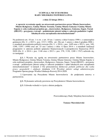 UCHWAŁA NR XVII/150/2016 RADY MIEJSKIEJ INOWROCŁAWIA z dnia 22 lutego 2016 r. w sprawie wyrażenia zgody na utworzenie partnerstwa przez Miasto Inowrocław, Miasto Bydgoszcz, Gminę Miasta Torunia, Gminę Miasta Gniezna i Gminę Miasta Sopotu w celu realizacji projektu pn. „Inowrocław, Bydgoszcz, Gniezno, Sopot, Toruń (IBGST) - przyjazny e-urząd – podniesienie jakości usług w zakresie podatków i opłat lokalnych oraz zarządzania nieruchomościami" Na podstawie art. 18 ust. 1 w zw. z art. 10 ust. 1 ustawy z dnia 8 marca 1990 r. o samorządzie gminnym (Dz. U. z 2015 r. poz. 1515 i 1890), art. 28a ust. 1 ustawy z dnia 6 grudnia 2006 r. o zasadach prowadzenia polityki rozwoju (Dz. U. z 2014 r. poz. 1649 oraz z 2015 r. poz. 349, 1240, 1358 i 1890) oraz art. 33 ust.1 ustawy z dnia 11 lipca 2014 r. o zasadach realizacji programów w zakresie polityki spójności finansowanych w perspektywie finansowej 20142020 (Dz. U. z 2014 r. poz. 1146 oraz z 2015 r. poz. 378, 1130, 1240 i 1767) uchwala się, co następuje: § 1. 1. Wyraża się zgodę na utworzenie partnerstwa przez Miasto Inowrocław, Miasto Bydgoszcz, Gminę Miasta Torunia, Gminę Miasta Gniezna i Gminę Miasta Sopotu w celu realizacji projektu „Inowrocław, Bydgoszcz, Gniezno, Sopot, Toruń (IBGST) - przyjazny e-urząd – podniesienie jakości usług w zakresie podatków i opłat lokalnych oraz zarządzania nieruchomościami” w ramach 2 Osi priorytetowej Efektywne polityki publiczne dla rynku pracy, gospodarki i edukacji, działania 2.18 Wysokiej jakości usługi administracyjne Programu Operacyjnego Wiedza Edukacja Rozwój 2014-2020. 2. Upoważnia się Prezydenta Miasta Inowrocławia partnerstwie. do podpisania umowy o § 2. Wykonanie uchwały powierza się Prezydentowi Miasta Inowrocławia. § 3. Uchwała wchodzi w życie z dniem podjęcia. Przewodniczący Rady Miejskiej Inowrocławia Tomasz Marcinkowski Id: 7256A8AE-86DE-43E4-B5C7-7E13819F5E9A. Podpisany Strona 1 z 3 Uzasadnienie Podjęcie uchwały w sprawie wyrażenia zgody na utworzenie partnerstwa Miasta Inowrocławia - lidera projektu z Miastem Bydgoszcz, Gminą Miasta Torunia, Gminą Miasta Gniezna i Gminą Miasta Sopotu jest niezbędne do ubiegania się o dofinansowanie na realizację projektu pn. „Inowrocław, Bydgoszcz, Gniezno, Sopot, Toruń (IBGST) przyjazny e-urząd – podniesienie jakości usług w zakresie podatków i opłat lokalnych oraz zarządzania nieruchomościami” w ramach ogłoszonego konkursu w ramach 2 Osi priorytetowej Efektywne polityki publiczne dla rynku pracy, gospodarki i edukacji, działania 2.18 Wysokiej jakości usługi administracyjne Programu Operacyjnego Wiedza Edukacja Rozwój2014-2020. Projekt polega na wdrażaniu w administracji publicznej rozwiązań poprawiających efektywność zarządzania usługami dziedzinowymi w następujących obszarach, istotnych dla prowadzenia działalności gospodarczej: 1) podatki i opłaty lokalne, poprzez: - elektronizację procesu obsługi podatkowej w urzędach jednostek samorządu terytorialnego, automatyzację rozliczeń oraz poprawę dostępności do informacji o sposobie załatwienia i przebiegu sprawy; - doskonalenie kompetencji kadr JST w zakresie m.in. obsługi podatkowej, stosowania narzędzi elektronicznych, obsługi klienta, zarządzania satysfakcją, orzecznictwa; - wdrażanie rozwiązań zarządczych w urzędach JST poprawiających jakość obsługi przedsiębiorców w szczególności w zakresie: zarządzania satysfakcją klienta, zarządzania jakością, zarządzania procesowego, dostępem do informacji publicznej; 2) zarządzanie nieruchomościami, w szczególności w zakresie gospodarowania lokalami użytkowymi, poprzez: - wdrażanie rozwiązań w JST poprawiających dostęp do usług administracyjnych oraz informacji o lokalach użytkowych i nieruchomościach gruntowych przeznaczonych pod inwestycje, poprawa obsługi klienta z wykorzystaniem m.in. narzędzi zarządzania satysfakcją; - doskonalenie kompetencji kadr samorządowych m.in. w zakresie zarządzania samorządowym zasobem nieruchomości, zasobem nieruchomości Skarbu Państwa, obsługi klienta, zarządzania satysfakcją, orzecznictwa; - wsparcie administracji samorządowej w zakresie opracowania planów wykorzystania zasobu nieruchomości, zagospodarowania pustostanów, skutecznej realizacji umów najmu i dzierżawy, elektronizacji procesu świadczenia usług i ewidencji nieruchomości oraz usprawnienia procesu współpracy i kontroli zarządców zasobów nieruchomości. W przedmiotowym projekcie, obok Miasta Inowrocławia uczestniczyć będą następujące samorządy: - Gmina Miasta Sopotu, - Miasto Bydgoszcz, Id: 7256A8AE-86DE-43E4-B5C7-7E13819F5E9A. Podpisany Strona 2 z 3 - Gmina Miasta Torunia, - Gmina Miasta Gniezna. Projekt ubiegać się będzie o dofinansowanie w ramach Programu Operacyjnego Wiedza Edukacja Rozwój (Działanie 2.18 Wysokiej jakości usługi administracyjne). Zarówno globalny budżet projektu, jak i szczegółowe budżety dotyczące działań planowanych do realizacji przez poszczególne samorządy partnerskie, nie są jeszcze sprecyzowane. Na podstawie regulaminu ogłoszonego przez Ministerstwo Spraw Wewnętrznych i Administracji konkursu nr POWR.02.18.00-IP.01-00-005/15 wiadomym jest jednak, iż wnioskowane dofinansowanie ze środków UE kształtować się będzie na poziomie 84,28%. Realizację projektu uzależnia się od uzyskania dofinansowania. Zgodnie z art. 28a ust. 1 ustawy z dnia 6 grudnia 2006 r. o zasadach prowadzenia polityki rozwoju w celu wspólnej realizacji projektów, o których mowa w art. 28 ust. 1, w zakresie określonym przez instytucję zarządzającą, mogą być tworzone partnerstwa, przez podmioty wnoszące do projektu zasoby ludzkie, organizacyjne, techniczne lub finansowe, realizujące wspólnie projekt, na warunkach określonych w porozumieniu lub umowie partnerskiej lub na podstawie odrębnych przepisów. Tworzenie partnerstwa przewiduje również art. 33 ust. 1 us
