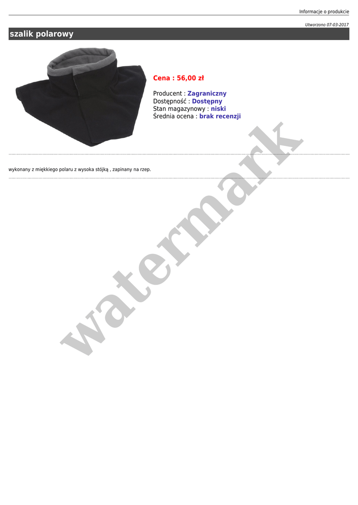 Informacje o produkcie Utworzono 07-03-2017 szalik polarowy Cena : 56,00 zł er m ar k Producent : Zagraniczny Dostępność : Dostępny Stan magazynowy : niski Średnia ocena : brak recenzji w at wykonany z miękkiego polaru z wysoka stójką , zapinany na rzep.