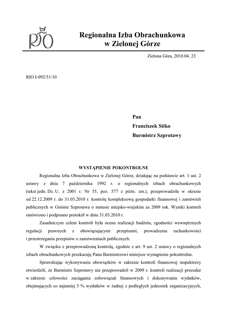 Regionalna Izba Obrachunkowa w Zielonej Górze Zielona Góra, 2010.04. 23 RIO I-092/51/10 Pan Franciszek Sitko Burmistrz Szprotawy WYSTĄPIENIE POKONTROLNE Regionalna Izba Obrachunkowa w Zielonej Górze, działając na podstawie art. 1 ust. 2 ustawy z dnia 7 października 1992 r. o regionalnych izbach obrachunkowych (tekst jedn. Dz. U. z 2001 r. Nr 55, poz. 577 z późn. zm.), przeprowadziła w okresie od 22.12.2009 r. do 31.03.2010 r. kontrolę kompleksową gospodarki finansowej i zamówień publicznych w Gminie Szprotawa o statusie miejsko-wiejskim za 2009 rok. Wyniki kontroli omówiono i podpisano protokół w dniu 31.03.2010 r. Zasadniczym celem kontroli była ocena realizacji budŜetu, zgodności wewnętrznych regulacji prawnych z obowiązującymi przepisami, prowadzenia rachunkowości i przestrzegania przepisów o zamówieniach publicznych. W związku z przeprowadzoną kontrolą, zgodnie z art. 9 ust. 2 ustawy o regionalnych izbach obrachunkowych przekazuję Panu Burmistrzowi niniejsze wystąpienie pokontrolne. Sprawdzając wykonywanie obowiązków w zakresie kontroli finansowej inspektorzy stwierdzili, Ŝe Burmistrz Szprotawy nie przeprowadził w 2009 r. kontroli realizacji procedur w zakresie celowości zaciągania zobowiązań finansowych i dokonywania wydatków, obejmujących co najmniej 5 % wydatków w Ŝadnej z podległych jednostek organizacyjnych, niezgodnie z art. 187 ust. 2 i 3 obowiązującej do dnia 31.12.2009 r. Ustawy z dnia 30 czerwca 2005 r. o finansach publicznych (Dz. U. Nr 249, poz. 2104 z późn. zm.). PowyŜsza nieprawidłowość stwierdzona została równieŜ w toku poprzedniej kontroli kompleksowej. Przyczyny niedopełnienia obowiązku wynikającego z art. 187 ust. 2 i 3 obowiązującej do dnia 31.12.2009 r. ustawy o finansach publicznych oraz nie wykonania wniosku pokontrolnego w tym zakresie, Burmistrz Szprotawy wyjaśnił wakatem na stanowisku kontroli wewnętrznej. Od 1 stycznia 2010 r. obowiązuje art. 69 ust. 1 pkt 2 ustawy z dnia 27 sierpnia 2009 r. o finansach publicznych (Dz. U. Nr 157 poz. 1240 z późn. zm.), nakładający na Burmistrza obowiązek zapewnienia funkcjonowania adekwatnej, skutecznej i efektywnej kontroli zarządczej. Obowiązująca w Urzędzie dokumentacja opisująca przyjęte zasady rachunkowości, zawiera elementy określone w art. 10 ust. 1 ustawy z dnia 29 września 1994 r. o rachunkowości (tekst jedn. Dz. U. z 2009 r. Nr 152, poz. 1223 z późn. zm.) i jest aktualizowana, stosownie do art. 10 ust. 2 ustawy. Prowadzone są wszystkie wymagane księgi rachunkowe, o których mowa w art. 13 ust. 1 ustawy o rachunkowości. Ewidencja operacji gospodarczych następuje na kontach przewidzianych w zakładowym planie kont. W badanych próbach, dowody księgowe będące podstawą zapisów w księgach rachunkowych, były prawidłowo ujmowane w ewidencji księgowej i spełniały wymogi określone w art. 21 ust. 1 ustawy o rachunkowości. Księgi rachunkowe dot. badanej próby dowodów księgowych prowadzone są rzetelnie, bezbłędnie, sprawdzalnie i bieŜąco, w myśl art. 24 ustawy o rachunkowości. Sprawozdania budŜetowe zostały sporządzone w sposób czytelny, trwały, w terminach określonych w wówczas obowiązującym rozporządzeniu Ministra Finansów z dnia 27 czerwca 2006 r. w sprawie sprawozdawczości budŜetowej (Dz. U. Nr 115, poz. 781 z późn. zm.). Dane wykazane w rocznych sprawozdaniach budŜetowych w poddanych kontroli próbach, były zgodne z danymi wynikającymi z ewidencji księgowej i dowodów księgowych. Od dnia 8 lutego 2010 r. obowiązuje rozporządzenie Ministra Finansów z dnia 3 lutego 2010 r. w sprawie sprawozdawczości budŜetowej (Dz. U. Nr 20 poz. 103). Bankową obsługę budŜetu Gminy Szprotawa i podległych jednostek organizacyjnych wykonuje Bank Zachodni WBK S.A., w oparciu o umowę zawartą na czas oznaczony, do dnia 28.02.2011 r. Prognozowany koszt obsługi bankowej w okresie obowiązywania umowy, nie przekracza wyraŜonej w złotych równowartości kwoty, o której mowa w art. 4 pkt 8 ustawy z dnia 29 stycznia 2004 r. Prawo zamówień publicznych (tekst jedn. Dz. U. z 2007 r. Nr 223, poz. 1655 z późn. zm.). 2 Raporty kasowe sporządzane były za właściwe okresy, ich salda początkowe były zgodne z poprzednimi, przy zachowaniu kolejności numeracji. Operacje kasowe ujmowane były w raportach w dniu ich realizacji, stosownie do art. 24 ust. 5 pkt 3 ustawy o rachunkowości, jednakŜe z raportów wyłączone zostały przychodowe dowody kasowe, bez wskazania miejsca ich przechowywania, niezgodnie z art. 24 ust. 4 pkt 1 i 4 ustawy o rachunkowości. Tym samym ksiąg rachunkowych nie moŜna uznać za sprawdzalne. Skarbnik Gminy potwierdziła nieprawidłowość stwierdzając, Ŝe przychodowe dowody kasowe przekazywane były na stanowiska zajmujące się księgowaniem. Skarbnik nadmieniła, Ŝe w powyŜszym zakresie zostanie dostosowana polityka rachunkowości. Stan gotówki w kasie w dniu kontroli zgodny był ze sporządzonym raportem kasowym, a ewidencja druków ścisłego zarachowania prowadzona była prawidłowo w odpowiednich księgach. W zakresie rozrachunków kontroli poddano prawidłowość funkcjonowania konta 234, na którym ewidencjonowano zaliczki oraz konta 201. W przyjętej próbie stwierdzono 2 przypadki rozliczenia zaliczek po terminie określonym we wniosku oraz 1 przypadek nierozliczenia zaliczki, co było niezgodne z zasadami określonymi w § 14 pkt 4 obowiązującej instrukcji obiegu, kontroli i archiwizowania dokumentów finansowo – księgowych. Przyczyny braku nadzoru nad przestrzeganiem zasad rozliczania zaliczek, Skarbnik Gminy wyjaśniła nieobecnością pracownika odpowiedzialnego za ten zakres. Skarbnik nadmieniła, Ŝe w celu wyeliminowania nieprawidłowości, w instrukcji zostanie zawarty zapis, iŜ w przypadku nierozliczenia w terminach określonych we wniosku, zaliczki będą potrącane z najbliŜszego wynagrodzenia. W ewidencji konta 201 nieprawidłowości nie stwierdzono.