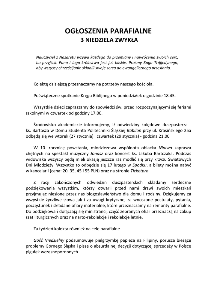 OGŁOSZENIA PARAFIALNE 3 NIEDZIELA ZWYKŁA Nauczyciel z Nazaretu wzywa każdego do przemiany i nawrócenia swoich serc, bo przyjście Pana i Jego królestwa jest już bliskie. Prośmy Boga Trójjedynego, aby wszyscy chrześcijanie skłonili swoje serca do ewangelicznego przesłania. Kolektę dzisiejszą przeznaczamy na potrzeby naszego kościoła. Poświąteczne spotkanie Kręgu Biblijnego w poniedziałek o godzinie 18.45. Wszystkie dzieci zapraszamy do spowiedzi św. przed rozpoczynającymi się feriami szkolnymi w czwartek od godziny 17.00. Środowisko akademickie informujemy, iż odwiedziny kolędowe duszpasterza -‐ ks. Bartosza w Domu Studenta Politechniki Śląskiej Babilon przy ul. Krasińskiego 25a odbędą się we wtorek (27 stycznia) i czwartek (29 stycznia) -‐ godzina 21.00 W 10. rocznicę powstania, młodzieżowa wspólnota oblacka Niniwa zaprasza chętnych na spektakl muzyczny Jonasz oraz koncert ks. Jakuba Bartczaka. Podczas widowiska wszyscy będą mieli okazję jeszcze raz modlić się przy krzyżu Światowych Dni Młodzieży. Wszystko to odbędzie się 17 lutego w Spodku, a bilety można nabyć w kancelarii (cena: 20, 35, 45 i 55 PLN) oraz na stronie Ticketpro. Z racji zakończonych odwiedzin duszpasterskich składamy serdeczne podziękowania wszystkim, którzy otwarli przed nami drzwi swoich mieszkań przyjmując niesione przez nas błogosławieństwo dla domu i rodziny. Dziękujemy za wszystkie życzliwe słowa jak i za uwagi krytyczne, za wnoszone postulaty, pytania, poczęstunek i składane ofiary materialne, które przeznaczamy na remonty parafialne. Do podziękowań dołączają się ministranci, część zebranych ofiar przeznaczą na zakup szat liturgicznych oraz na narto-‐rekolekcje i rekolekcje letnie. Za tydzień kolekta również na cele parafialne. Gość Niedzielny podsumowuje pielgrzymkę papieża na Filipiny, porusza bieżące problemy Górnego Śląska i pisze o absurdalnej decyzji dotyczącej sprzedaży w Polsce pigułek wczesnoporonnych.