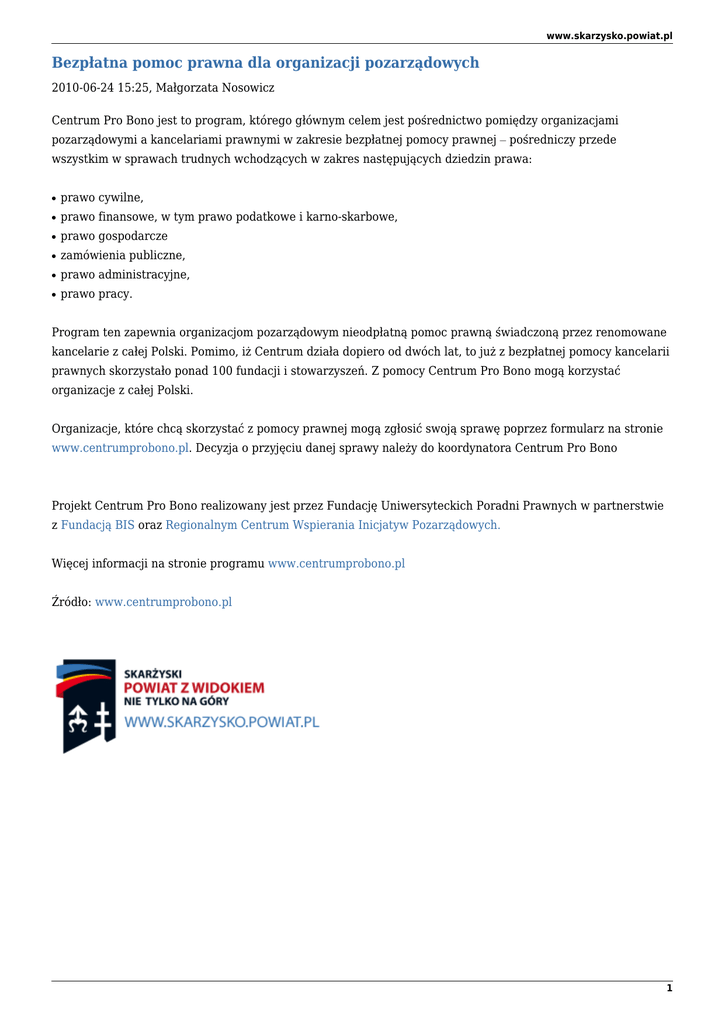 www.skarzysko.powiat.pl Bezpłatna pomoc prawna dla organizacji pozarządowych 2010-06-24 15:25, Małgorzata Nosowicz Centrum Pro Bono jest to program, którego głównym celem jest pośrednictwo pomiędzy organizacjami pozarządowymi a kancelariami prawnymi w zakresie bezpłatnej pomocy prawnej – pośredniczy przede wszystkim w sprawach trudnych wchodzących w zakres następujących dziedzin prawa: ● prawo cywilne, ● prawo finansowe, w tym prawo podatkowe i karno-skarbowe, ● prawo gospodarcze ● zamówienia publiczne, ● prawo administracyjne, ● prawo pracy. Program ten zapewnia organizacjom pozarządowym nieodpłatną pomoc prawną świadczoną przez renomowane kancelarie z całej Polski. Pomimo, iż Centrum działa dopiero od dwóch lat, to już z bezpłatnej pomocy kancelarii prawnych skorzystało ponad 100 fundacji i stowarzyszeń. Z pomocy Centrum Pro Bono mogą korzystać organizacje z całej Polski. Organizacje, które chcą skorzystać z pomocy prawnej mogą zgłosić swoją sprawę poprzez formularz na stronie www.centrumprobono.pl. Decyzja o przyjęciu danej sprawy należy do koordynatora Centrum Pro Bono Projekt Centrum Pro Bono realizowany jest przez Fundację Uniwersyteckich Poradni Prawnych w partnerstwie z Fundacją BIS oraz Regionalnym Centrum Wspierania Inicjatyw Pozarządowych. Więcej informacji na stronie programu www.centrumprobono.pl Źródło: www.centrumprobono.pl 1