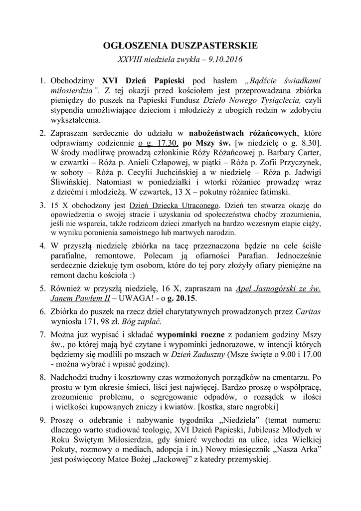 OGŁOSZENIA DUSZPASTERSKIE XXVIII niedziela zwykła – 9.10.2016 1. Obchodzimy XVI Dzień Papieski pod hasłem „Bądźcie świadkami miłosierdzia”. Z tej okazji przed kościołem jest przeprowadzana zbiórka pieniędzy do puszek na Papieski Fundusz Dzieło Nowego Tysiąclecia, czyli stypendia umożliwiające dzieciom i młodzieży z ubogich rodzin w zdobyciu wykształcenia. 2. Zapraszam serdecznie do udziału w nabożeństwach różańcowych, które odprawiamy codziennie o g. 17.30, po Mszy św. [w niedzielę o g. 8.30]. W środy modlitwę prowadzą członkinie Róży Różańcowej p. Barbary Carter, w czwartki – Róża p. Anieli Człapowej, w piątki – Róża p. Zofii Przyczynek, w soboty – Róża p. Cecylii Juchcińskiej a w niedzielę – Róża p. Jadwigi Śliwińskiej. Natomiast w poniedziałki i wtorki różaniec prowadzę wraz z dziećmi i młodzieżą. W czwartek, 13 X – pokutny różaniec fatimski. 3. 15 X obchodzony jest Dzień Dziecka Utraconego. Dzień ten stwarza okazję do opowiedzenia o swojej stracie i uzyskania od społeczeństwa choćby zrozumienia, jeśli nie wsparcia, także rodzicom dzieci zmarłych na bardzo wczesnym etapie ciąży, w wyniku poronienia samoistnego lub martwych narodzin. 4. W przyszłą niedzielę zbiórka na tacę przeznaczona będzie na cele ściśle parafialne, remontowe. Polecam ją ofiarności Parafian. Jednocześnie serdecznie dziekuję tym osobom, które do tej pory złożyły ofiary pieniężne na remont dachu kościoła :) 5. Również w przyszłą niedzielę, 16 X, zapraszam na Apel Jasnogórski ze św. Janem Pawłem II – UWAGA! - o g. 20.15. 6. Zbiórka do puszek na rzecz dzieł charytatywnych prowadzonych przez Caritas wyniosła 171, 98 zł. Bóg zapłać. 7. Można już wypisać i składać wypominki roczne z podaniem godziny Mszy św., po której mają być czytane i wypominki jednorazowe, w intencji których będziemy się modlili po mszach w Dzień Zaduszny (Msze święte o 9.00 i 17.00 - można wybrać i wpisać godzinę). 8. Nadchodzi trudny i kosztowny czas wzmożonych porządków na cmentarzu. Po prostu w tym okresie śmieci, liści jest najwięcej. Bardzo proszę o współpracę, zrozumienie problemu, o segregowanie odpadów, o rozsądek w ilości i wielkości kupowanych zniczy i kwiatów. [kostka, stare nagrobki] 9. Proszę o odebranie i nabywanie tygodnika „Niedziela” (temat numeru: dlaczego warto studiować teologię, XVI Dzień Papieski, Jubileusz Młodych w Roku Świętym Miłosierdzia, gdy śmierć wychodzi na ulice, idea Wielkiej Pokuty, rozmowy o mediach, adopcja i in.) Nowy miesięcznik „Nasza Arka” jest poświęcony Matce Bożej „Jackowej” z katedry przemyskiej.