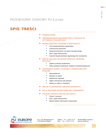 i spis treści PRZEWODNIK OGNIOWY PU Europe spis treści ›› ›› ›› ›› ›› ›› ›› ›› OŚWIADCZENIE ZRÓWNOWAŻONE BUDOWNICTWO Z IZOLACJĄ ze sztywnego poliuretanu BEZPIECZEŃSTWO OGNIOWE w BUDYNKach • • • • • Cele bezpieczeństwa ogniowego Scenariusze pożarowe Rozprzestrzenianie się ognia wewnętrznego Dym i jego toksyczność Kwestie bezpieczeństwa ogniowego do rozważenia WPŁYW IZOLACJI NA BEZPIECZEŃSTWO OGNIOWE BUDYNKu • • Ogólna praktyka budowlana Nowa praktyka budowlana: budynki wysokoenergetyczne EUROPEJSKIE NORMY OGNIOWE A PRAWODAWSTWO KRAJOWE • • • • • Wprowadzenie Reakcja na ogień Odporność ogniowa Ogień zewnętrzny dla dachów Rekcja na ogień w fasadach WPŁYW STANDARDÓW UBEZPIECZENIOWYCH ROLA INŻYNIERII bezpieczeŃstwa ogniowego PALNOŚĆ PRODUKTÓW IZOLACYJNYCH • • • Tlenie i żarzenie Dym i jego toksyczność Wyniki badań końcowych zastosowań Av. E. Van Nieuwenhuyse 6 1160 Bruksela (Belgia) Telefon: + 32 / 2 676 72 71 Faks: + 32 / 2 676 74 79 [email protected] www.pu-europe.eu ii oświadczenie PRZEWODNIK OGNIOWY PU Europe oświadczenie Choć wszystkie informacje i zalecenia zawarte w niniejszej publikacji odzwierciedlają stan naszej najlepszej wiedzy i są zgodne z naszymi przekonaniami na dzień ich publikacji, nie można interpretować ich jako treści gwarantowanych, oświadczonych czy w inny sposób wiążących. Av. E. Van Nieuwenhuyse 6 1160 Bruksela (Belgia) Telefon: + 32 / 2 676 72 71 Faks: + 32 / 2 676 74 79 [email protected] www.pu-europe.eu