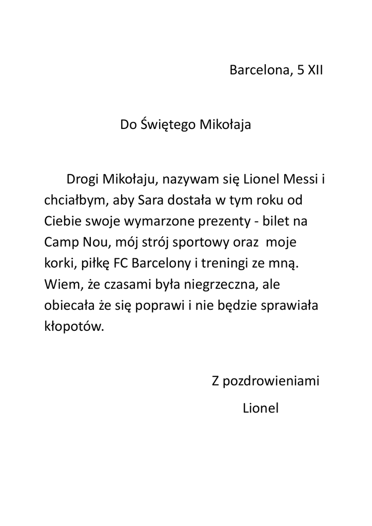 Barcelona, 5 XII Do Świętego Mikołaja Drogi Mikołaju, nazywam się Lionel Messi i chciałbym, aby Sara dostała w tym roku od Ciebie swoje wymarzone prezenty - bilet na Camp Nou, mój strój sportowy oraz moje korki, piłkę FC Barcelony i treningi ze mną. Wiem, że czasami była niegrzeczna, ale obiecała że się poprawi i nie będzie sprawiała kłopotów. Z pozdrowieniami Lionel
