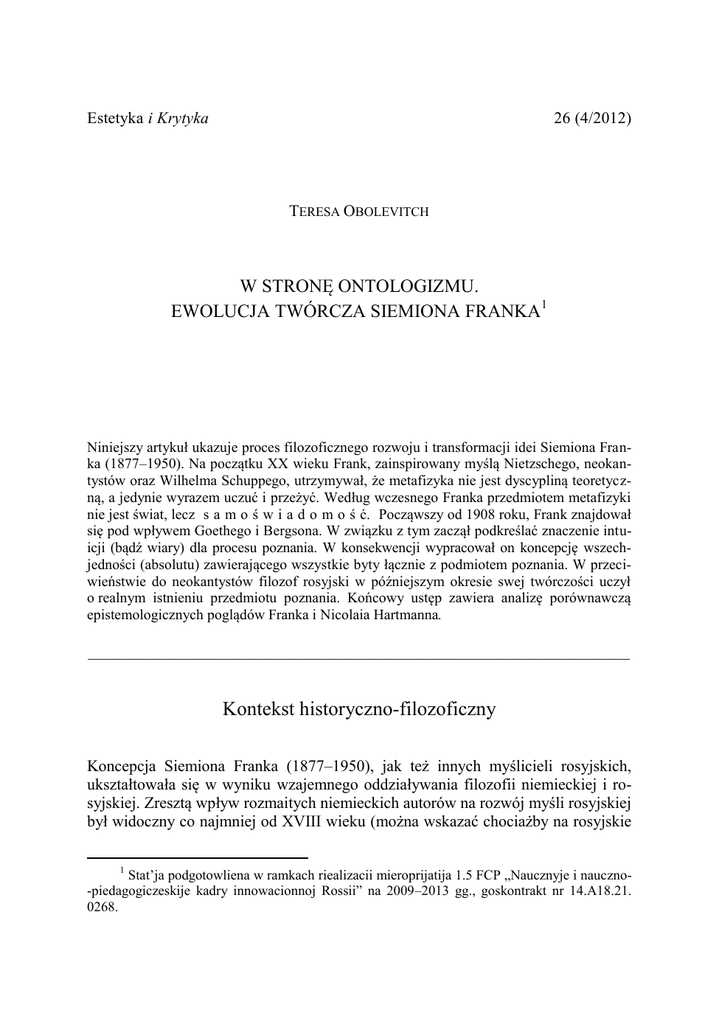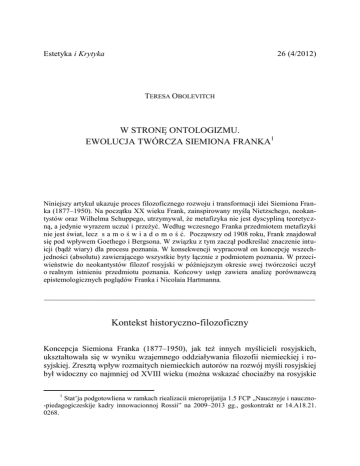 Estetyka i Krytyka 26 (4/2012) TERESA OBOLEVITCH W STRONĘ ONTOLOGIZMU. EWOLUCJA TWÓRCZA SIEMIONA FRANKA1 Niniejszy artykuł ukazuje proces filozoficznego rozwoju i transformacji idei Siemiona Franka (1877–1950). Na początku XX wieku Frank, zainspirowany myślą Nietzschego, neokantystów oraz Wilhelma Schuppego, utrzymywał, że metafizyka nie jest dyscypliną teoretyczną, a jedynie wyrazem uczuć i przeżyć. Według wczesnego Franka przedmiotem metafizyki nie jest świat, lecz s a m o ś w i a d o m o ś ć. Począwszy od 1908 roku, Frank znajdował się pod wpływem Goethego i Bergsona. W związku z tym zaczął podkreślać znaczenie intuicji (bądź wiary) dla procesu poznania. W konsekwencji wypracował on koncepcję wszechjedności (absolutu) zawierającego wszystkie byty łącznie z podmiotem poznania. W przeciwieństwie do neokantystów filozof rosyjski w późniejszym okresie swej twórczości uczył o realnym istnieniu przedmiotu poznania. Końcowy ustęp zawiera analizę porównawczą epistemologicznych poglądów Franka i Nicolaia Hartmanna. __________________________________________________________________ Kontekst historyczno-filozoficzny Koncepcja Siemiona Franka (1877–1950), jak też innych myślicieli rosyjskich, ukształtowała się w wyniku wzajemnego oddziaływania filozofii niemieckiej i rosyjskiej. Zresztą wpływ rozmaitych niemieckich autorów na rozwój myśli rosyjskiej był widoczny co najmniej od XVIII wieku (można wskazać chociażby na rosyjskie 1 Stat’ja podgotowliena w ramkach riealizacii mieroprijatija 1.5 FCP „Naucznyje i nauczno-piedagogiczeskije kadry innowacionnoj Rossii” na 2009–2013 gg., goskontrakt nr 14.A18.21. 0268. 260 Teresa Obolevitch ____________________________________________________________________________________________________________________________________________________________________________________________________________________________________________ recepcje Mikołaja z Kuzy, G. W. Leibniza, Ch. Wolffa, J. Boehmego, I. Kanta czy przedstawicieli idealizmu subiektywnego). Także na przełomie XIX i XX stulecia Rosjanie kształcili się na niemieckich uczelniach, zwłaszcza w Marburgu – ówczesnej mekce świata filozoficznego; w 1908 roku spora grupa myślicieli rosyjskich wzięła udział w międzynarodowym kongresie filozoficznym w Heidelbergu (jednym z owoców tego przedsięwzięcia było założenie czasopisma „Logos”, posiadającego oprócz wersji niemieckiej edycję rosyjską ukazującą się w Moskwie (1910– 1914) i w Pradze (1925–1928), z którą związany był między innymi bohater niniejszego studium, S. Frank2). Sam Frank w latach 1899–1901 studiował filozofię na Uniwersytecie Berlińskim, a w roku akademickim 1917/1918 prowadził seminarium na temat idealizmu niemieckiego od Kanta do Schopenhauera3. Po wygnaniu z Rosji w 1922 roku właśnie Niemcy wybrał on na kraj emigracji4. Wykładał na Uniwersytecie Berlińskim, należał do Towarzystwa Kantowskiego, gdzie między innymi wygłosił odczyt pt. Die russische Geistesart in ihrer Beziehung zur deutschen5 oraz Die russische Weltanschauung6, ukazując związek filozofii niemieckiej i rosyjskiej. W niniejszym studium przeanalizujemy niektóre punkty, w których dochodzi do spotkania oraz dyskusji Franka z niemieckimi myślicielami, mianowicie te dotyczące poglądów na temat roli i miejsca ontologii. Stanowisko wczesnego Franka wobec metafizyki Siemion Frank należy do tych myślicieli rosyjskich, o których ogólnie mówi się, iż przeszli drogę „od marksizmu do idealizmu”. Nie miejsce tu na szczegółowe omawianie całego procesu kształtowania się i przemian poglądów rosyjskiego filozofa. Dla naszego tematu istotne są jedynie te momenty jego biografii twórczej, które ukazują związek (początkowo recepcję, pokrewieństwo bądź podobieństwo, a następnie polemikę) z kręgiem post- i neokantystów. Z życiorysu Franka wiemy, że w pierwszej dekadzie XX wieku kilkakrotnie przebywał on w Niemczech, gdzie przyswoił sobie podstawowe idee neokantyzmu (w 1903 roku przetłumaczył Preludia W. Windelbanda; planował również przełożyć Einleitung in die Moralwissenschaft G. Simmela). Wówczas był również zauroczony Nietzschem, wyznając w 1902 roku w prowadzonym przez siebie dzienniku: „Jakże głębokie są we mnie 2 Zob. A. I. Abramow O russkom kantianstwie i nieokantianstwie w żurnalie „Łogos” [w:] Kant i fiłosofija w Rossii Z. A. Kamienskij, A. W. Poliakow (red.) Moskwa 1994 s. 232–234. 3 S. L. Frank Niemieckij idiealizm: ot Kanta do Szopiengauera [w:] tegoż Saratowskij tiekst A. A. Gaponienkow, J. P. Nikitina (red.) Saratow 2006 s. 112–164. 4 W latach 30., gdy do władzy doszli naziści, filozof musiał opuścić Niemcy i przenieść się do Francji, a po II wojnie światowej – do Anglii. 5 Zob. S. Frank Die russische Geistesart in ihrer Beziehung zur deutschen [w:] Issliedowanija po istorii russkoj mysli. Jeżegodnik za 2000 god M. A. Kolierow (red.) Moskwa 2000 s. 131–164. 6 Zob. S. L. Frank Russkoje mirowozzrienije G. Franko (tł.) [w:] tegoż Duchownyje osnowy obszczestwa Moskwa 1992 s. 472–500. W stronę ontologizmu. Ewolucja twórcza Siemiona Franka 261 ____________________________________________________________________________________________________________________________________________________________________________________________________________________________________________ antyreligijne uczucie i świadomość”7. W tym samym roku Frank nader wymownie wyraził swój stosunek do metafizyki, pisząc: Droga, na której Kartezjusz od podstawowego faktu świadomości – bytu myślącej istoty, od cogito ergo sum – przechodzi do Boga, a od tego ostatniego do świata, bynajmniej nie jest przestarzałym trikiem teologii, lecz p o d s t a w o w y m b ł ę d e m w s z e lk i e j m e t a f i z y k i. Świat doświadczenia, świat realności i empirii jest światem p r z e d m i o
