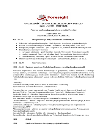 "PRZYSZŁOŚĆ TECHNIK SATELITARNYCH W POLSCE" DZIŚ - JUTRO – POJUTRZE Pierwsza konferencja przeglądowa projektu Foresight 18 STYCZNIA 2007 PAŁAC STASZICA, PAN, WARSZAWA 9.30 – 11.45 Blok prezentacji: Przyszłość technik satelitarnych Założenia i cele projektu Foresight – Jakub Ryzenko, koordynator projektu Foresight Rozwój sektora kosmicznego w Europie i na świecie – Jakub Ryzenko, CBK PAN Europejska polityka kosmiczna – prof. Zbigniew Kłos, Centrum Badań Kosmicznych PAN Stan obecny i perspektywy rozwoju: o nawigacji satelitarnej – prof. Stanisław Oszczak, Uniwersytet Warmińsko-Mazurski o zdalnej obserwacji Ziemi – dr Mirosław Rataj, Centrum Badań Kosmicznych PAN o telekomunikacji satelitarnej – prof. Józef Modelski, Politechnika Warszawska Możliwości rozwoju technologii kosmicznych – Bartosz Buszke, Polspace Sp. z o. o. 11.45 – 12.00 12.00 – 14.00 Przerwa kawowa Dyskusja panelowa: Techniki satelitarne a rozwój polskiej gospodarki Poruszane zagadnienia: rola sektora kosmicznego w gospodarce; techniki satelitarne a strategia rozwoju państwa, nowoczesne technologie i innowacyjność gospodarki; techniki satelitarne a rozwój społeczeństwa informacyjnego; polski sektor kosmiczny – stanowisko biznesu, raport z konferencji "GIS dla ludzi: nawigacja satelitarna"; agenda badawcza Polskiej Platformy Technologii Kosmicznych i inne Uczestnicy Moderator: Jakub Ryzenko, Polskie Biuro ds. Przestrzeni Kosmicznej Sprawozdawca: Sławomir Kosieliński, Computerworld Bogusław Wontor – poseł, przewodniczący Zespołu Poselskiego ds. Przestrzeni Kosmicznej Krzysztof Gulda – Dyrektor Departamentu Rozwoju Gospodarki, Ministerstwo Gospodarki Agnieszka Ratajczak – Dyrektor Departamentu Spraw Europejskich, Ministerstwo Nauki i Szkolnictwa Wyższego (do potwierdzenia) Prof. Marzenna Weresa – Dyrektor Instytutu Gospodarki Światowej, SGH Dr Michał Goliński - Zakład Gospodarki Informacyjnej i Społeczeństwa Informacyjnego, Katedra Informatyki Gospodarczej, SGH Dr Mariusz Andrzejczak – ekspert projektu Foresightu technologicznego dla województwa mazowieckiego, PIAP Aleksander Żołnierski – główny specjalista w Zespole Programowania i Analiz, Polska Agencja Rozwoju Przedsiębiorczości Krzysztof Król – wiceprezes Polskiej Izby Informatyki i Telekomunikacji Bartosz Buszke – koordynator Polskiej Platformy Technologii Kosmicznych, Polspace sp. z o.o. 14.00 Obiad 15.00 Spotkanie Komitetu Sterującego projektu Foresight