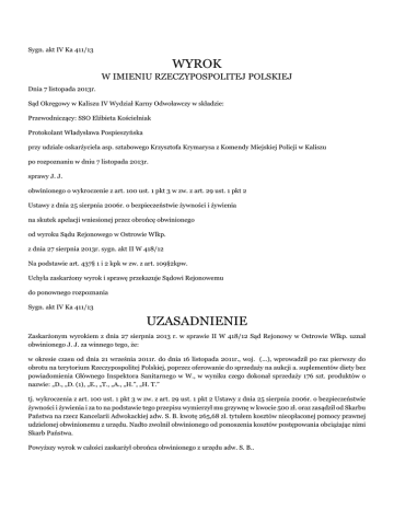 Sygn. akt IV Ka 411/13 WYROK W IMIENIU RZECZYPOSPOLITEJ POLSKIEJ Dnia 7 listopada 2013r. Sąd Okręgowy w Kaliszu IV Wydział Karny Odwoławczy w składzie: Przewodniczący: SSO Elżbieta Kościelniak Protokolant Władysława Pospieszyńska przy udziale oskarżyciela asp. sztabowego Krzysztofa Krymarysa z Komendy Miejskiej Policji w Kaliszu po rozpoznaniu w dniu 7 listopada 2013r. sprawy J. J. obwinionego o wykroczenie z art. 100 ust. 1 pkt 3 w zw. z art. 29 ust. 1 pkt 2 Ustawy z dnia 25 sierpnia 2006r. o bezpieczeństwie żywności i żywienia na skutek apelacji wniesionej przez obrońcę obwinionego od wyroku Sądu Rejonowego w Ostrowie Wlkp. z dnia 27 sierpnia 2013r. sygn. akt II W 418/12 Na podstawie art. 437§ 1 i 2 kpk w zw. z art. 109§2kpw. Uchyla zaskarżony wyrok i sprawę przekazuje Sądowi Rejonowemu do ponownego rozpoznania Sygn. akt IV Ka 411/13 UZASADNIENIE Zaskarżonym wyrokiem z dnia 27 sierpnia 2013 r. w sprawie II W 418/12 Sąd Rejonowy w Ostrowie Wlkp. uznał obwinionego J. J. za winnego tego, że: w okresie czasu od dnia 21 września 2011r. do dnia 16 listopada 2011r., woj. (...), wprowadził po raz pierwszy do obrotu na terytorium Rzeczypospolitej Polskiej, poprzez oferowanie do sprzedaży na aukcji a. suplementów diety bez powiadomienia Głównego Inspektora Sanitarnego w W., w wyniku czego dokonał sprzedaży 176 szt. produktów o nazwie: „D., „D. (1), „E., „T., „A., „H.”, „H. T.” tj. wykroczenia z art. 100 ust. 1 pkt 3 w zw. z art. 29 ust. 1 pkt 2 Ustawy z dnia 25 sierpnia 2006r. o bezpieczeństwie żywności i żywienia i za to na podstawie tego przepisu wymierzył mu grzywnę w kwocie 500 zł. oraz zasądził od Skarbu Państwa na rzecz Kancelarii Adwokackiej adw. S. B. kwotę 265,68 zł. tytułem kosztów nieopłaconej pomocy prawnej udzielonej obwinionemu z urzędu. Nadto zwolnił obwinionego od ponoszenia kosztów postępowania obciążając nimi Skarb Państwa. Powyższy wyrok w całości zaskarżył obrońca obwinionego z urzędu adw. S. B.. Wyrokowi apelujący zarzucił: 1. Obrazę przepisów postępowania, która miała wpływ na treść zaskarżonego orzeczenia, a w szczególności - art. 8 kpw w zw. z art. 5 § 2 kpk w zw. z art. 7 kpk poprzez rażące naruszenie zasady swobodnej oceny dowodów, - art. 8 kpw w zw. z art. 20 §3 kpw w zw. z art. 5 § 1 kpk w zw. z art. 74 § 1 kpk poprzez naruszenie zasady domniemania niewinności, 2. Błąd w ustaleniach faktycznych przyjętych za podstawę orzeczenia, który miał wpływ na jego treść, będący następstwem przyjęcia za udowodnione faktów bez dostatecznej ku temu podstawy oraz przyjęcia nietrafnych kryteriów oceny zebranego materiału dowodowego w szczególności poprzez niewskazanie przez Sąd, na jakich dokumentach oparł swoje wyrokowanie, niewyjaśnienie też, jak ustalił, że przedmiotowe substancje stanowią suplementy diety i istnieje wobec nich obowiązek powiadomienia Głównego Inspektora Sanitarnego o ich wprowadzeniu po raz pierwszy do sprzedazy na terytorium RP, a także niewskazanie przez Sąd, jak ustalił, że substancje te zostały wprowadzone pierwszy raz do obrotu na terytorium RP, błędne oparcie się na wyjaśnieniach obwinionego cierpiącego na zaburzenia psychiczne i nie powtórzonych na rozprawie, co w konsekwencji doprowadziło do bezpodstawnego przyjęcia, że obwiniony w okresie od dnia 21.09.2011r. do dnia 16.11.2011r. w O.wprowadził po raz pierwszy do obrotu na terytorium RP poprzez oferowanie sprzedaży na aukcji a. suplementów diety bez powiadomienia Głównego Inspektora Sanitarnego w W., w wyniku czego dokonał sprzedaży produktów o nazwie D., D. (1), E., T., A., H., H. T., jak również bezpodstawne przyjęcie, że można obwinionemu przypisać jakąkolwiek winę w zakresie popełnienia przedmiotowych czynów, a tym bardziej winę umyślną i to pomimo tego, że przedmiotowa opinia biegłego sądowego z dziedziny psychiatrii wskazuje na występowanie u obwinionego zaburzeń psychicznych i nie precyzuje okresów, w których obwiniony był niepoczytalny, 3. Obrazę przepisów prawa materialnego poprzez naruszenie art. 104 § 1 pkt 7 kpw w zw. z art. 5 § 1 pkt 4 kpw poprzez błędne orzeczenie przez Sąd, co do czynów wobec których zachodziła okoliczność wyłączająca postępowanie w postaci przedawnienia ich karalności za okres po dniu 21.09.2011r. do dnia prawomocnego zakończenia postępowania w przedmiotowej sprawie, W konkluzji apelujący wniósł o uchylenie zaskarżonego wyroku i umorzenie postępowania w stosunku do czynów objętych przedawnieniem karalności. Natomiast co do pozostałych czynów wniósł o zmianę zaskarżonego orzeczenia poprzez uniewinnienie obwinionego od zarzucanych mu czynów ewentualnie o uchylenie przedmiotowego wyroku w całości i przekazanie sprawy Sądowi I instancji do ponownego rozpoznania. Nadto z ostrożności procesowej, w razie uznania winy obwinionego powyższemu wyrokowi apelujący zarzucił rażącą niewspółmierność orzeczonej wobec obwinionego kary grzywny w kwocie 500 zł., podczas gdy stopień winy obwinionego, stopień społecznej szkodliwości popełnionego wykroczenia, a także cele jakie kara ta winna spełnić w zakresie prewencji szczególnej i ogólnej, uzasadniają orzeczenie łagodniejszej kary grzywny. Sąd Okręgowy zważył co następuje: Apelacja obrońcy obwinionego J. J. zasługuje częściowo na uwzględnienie. Przede wszystkim wskazać trzeba, że uzasadnienie zaskarżonego wyroku, które winno odzwierciedlać tok rozumowania Sądu orzekającego i stanowić wyczerpującą odpowiedź na pytanie dlaczego taki właśnie, a nie inny wyrok został wydany, tychże wymogów nie spełnia. Obwinionemu zarzucono popełnienie wykroczenia z art. 100 ust. 1 pkt 3 ustawy z dnia 25 sierpnia 2006r. o bezpieczeństwie żywności i żywienia polegającego na tym, iż obwiniony wprowadził po raz pierwszy do obrotu suplementy diety bez powiadomienia Głównego Inspektora Sanitarne