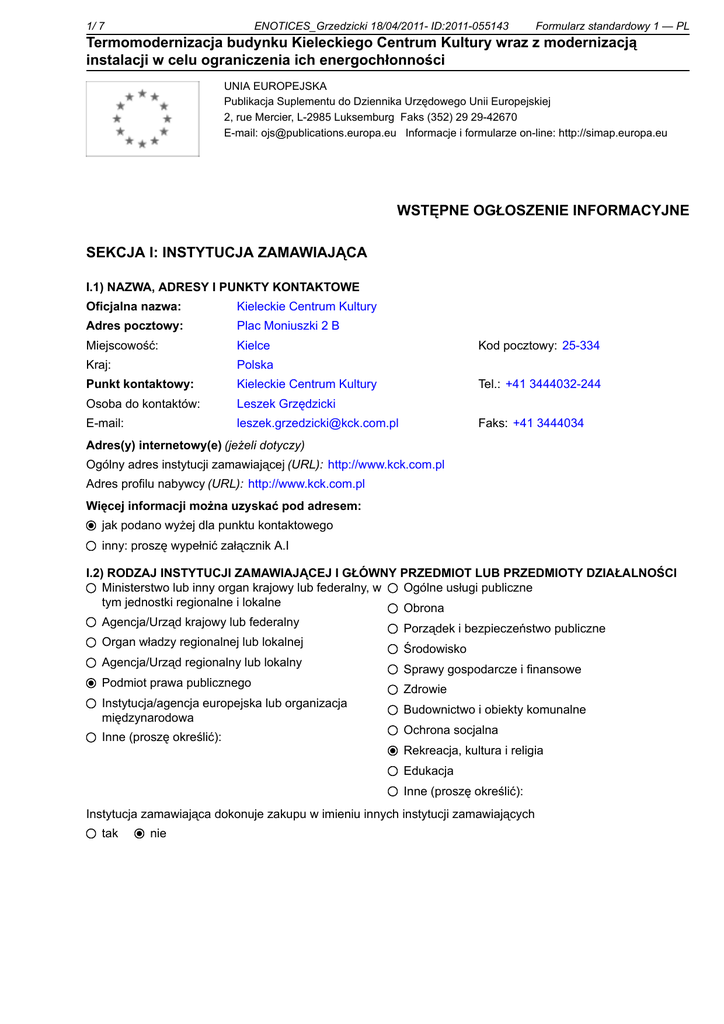 1/ 7 ENOTICES_Grzedzicki 18/04/2011- ID:2011-055143 Formularz standardowy 1 — PL Termomodernizacja budynku Kieleckiego Centrum Kultury wraz z modernizacją instalacji w celu ograniczenia ich energochłonności UNIA EUROPEJSKA Publikacja Suplementu do Dziennika Urzędowego Unii Europejskiej 2, rue Mercier, L-2985 Luksemburg Faks (352) 29 29-42670 E-mail: [email protected] Informacje i formularze on-line: http://simap.europa.eu WSTĘPNE OGŁOSZENIE INFORMACYJNE SEKCJA I: INSTYTUCJA ZAMAWIAJĄCA I.1) NAZWA, ADRESY I PUNKTY KONTAKTOWE Oficjalna nazwa: Kieleckie Centrum Kultury Adres pocztowy: Plac Moniuszki 2 B Miejscowość: Kielce Kraj: Polska Punkt kontaktowy: Kieleckie Centrum Kultury Osoba do kontaktów: Leszek Grzędzicki E-mail: [email protected] Kod pocztowy: 25-334 Tel.: +41 3444032-244 Faks: +41 3444034 Adres(y) internetowy(e) (jeżeli dotyczy) Ogólny adres instytucji zamawiającej (URL): http://www.kck.com.pl Adres profilu nabywcy (URL): http://www.kck.com.pl Więcej informacji można uzyskać pod adresem: jak podano wyżej dla punktu kontaktowego inny: proszę wypełnić załącznik A.I I.2) RODZAJ INSTYTUCJI ZAMAWIAJĄCEJ I GŁÓWNY PRZEDMIOT LUB PRZEDMIOTY DZIAŁALNOŚCI Ministerstwo lub inny organ krajowy lub federalny, w Ogólne usługi publiczne tym jednostki regionalne i lokalne Obrona Agencja/Urząd krajowy lub federalny Organ władzy regionalnej lub lokalnej Agencja/Urząd regionalny lub lokalny Podmiot prawa publicznego Instytucja/agencja europejska lub organizacja międzynarodowa Inne (proszę określić): Porządek i bezpieczeństwo publiczne Środowisko Sprawy gospodarcze i finansowe Zdrowie Budownictwo i obiekty komunalne Ochrona socjalna Rekreacja, kultura i religia Edukacja Inne (proszę określić): Instytucja zamawiająca dokonuje zakupu w imieniu innych instytucji zamawiających tak nie 2/ 7 ENOTICES_Grzedzicki 18/04/2011- ID:2011-055143 Formularz standardowy 1 — PL Termomodernizacja budynku Kieleckiego Centrum Kultury wraz z modernizacją instalacji w celu ograniczenia ich energochłonności SEKCJA II.A: PRZEDMIOT ZAMÓWIENIA (ROBOTY BUDOWLANE) II.1) NAZWA NADANA ZAMÓWIENIU PRZEZ INSTYTUCJĘ ZAMAWIAJĄCĄ Termomodernizacja budynku Kieleckiego Centrum Kultury wraz z modernizacją instalacji w celu ograniczenia ich energochłonności II.2) RODZAJ ZAMÓWIENIA ORAZ LOKALIZACJA ROBÓT BUDOWLANYCH Kod NUTS: PL331 Główne miejsce lub lokalizacja robót budowlanych: Kielce Plac Moniuszki 2 B II.3) NINIEJSZE OGŁOSZENIE DOTYCZY UMOWY RAMOWEJ tak nie II.4) KRÓTKI OPIS RODZAJU I ZAKRESU ROBÓT BUDOWLANYCH I.docieplenie ścian zewnętrznych budynku,wymiana stolarki okiennej , wymiana ślusarki drzwiowej i okiennej, II.przebudowa systemu centralnego ogrzewania i ciepłej wody użytkowej Jeżeli jest znana, szacunkowa wartość bez VAT (jeżeli dotyczy; podać wyłącznie dane liczbowe): _____ Waluta:: LUB Zakres: między 5 100 000,00 Waluta:: PLN a 5 175 000,00 Podział na części (w celu podania informacji o częściach zamówienia należy wykorzystać załącznik B w liczbie odpowiadającej liczbie części) tak nie II.5) WSPÓLNY SŁOWNIK ZAMÓWIEŃ (CPV) Główny przedmiot Dodatkowe przedmioty Słownik główny 45000000 45331100 45321000 Słownik uzupełniający (jeżeli dotyczy) II.6) PLANOWANA DATA ROZPOCZĘCIA PROCEDURY UDZIELANIA ZAMÓWIENIA ORAZ CZAS TRWANIA ZAMÓWIENIA Planowana data (jeżeli jest znana): rozpoczęcia procedury 22/06/2011 (dd/mm/rrrr) udzielania zamówienia Okres w miesiącach: _____ lub dniach: _____(od udzielenia zamówienia) LUB Planowana data (jeżeli jest znana): rozpoczęcia robót budowlanych 24/07/2011 (dd/mm/rrrr) zakończenia robót budowlanych 31/10/2012 (dd/mm/rrrr) II.7) ZAMÓWIENIE JEST OBJĘTE POROZUMIENIEM W SPRAWIE ZAMÓWIEŃ RZĄDOWYCH (GPA) tak nie II.8) INFORMACJE DODATKOWE (jeżeli dotyczy) _____ 3/ 7 ENOTICES_Grzedzicki 18/04/2011- ID:2011-055143 Formularz standardowy 1 — PL Termomodernizacja budynku Kieleckiego Centrum Kultury wraz z modernizacją instalacji w celu ograniczenia ich energochłonności SEKCJA II.B: PRZEDMIOT ZAMÓWIENIA (DOSTAWY LUB USŁUGI) (1) II.1) NAZWA NADANA ZAMÓWIENIU PRZEZ INSTYTUCJĘ ZAMAWIAJĄCĄ _____ II.2) RODZAJ ZAMÓWIENIA ORAZ MIEJSCE REALIZACJI DOSTAWY LUB ŚWIADCZENIA USŁUG (Wybrać wyłącznie jedną kategorię – dostaw lub usług – która najbardziej odpowiada konkretnemu przedmiotowi zamówienia lub zakupu) Dostawy Usługi Kod NUTS: _____ Główne miejsce lub lokalizacja robót budowlanych: _____ II.3) KRÓTKI OPIS RODZAJU ORAZ ILOŚCI LUB WARTOŚCI DOSTAW LUB USŁUG (dla każdej kategorii usług) _____ Jeżeli jest znana, szacunkowa wartość bez VAT (jeżeli dotyczy; podać wyłącznie dane liczbowe): _____ Waluta:: LUB Zakres: między _____ Waluta:: a _____ Podział na części (w celu podania informacji o częściach zamówienia należy wykorzystać załącznik B w liczbie odpowiadającej liczbie części) tak nie II.4) WSPÓLNY SŁOWNIK ZAMÓWIEŃ (CPV) II.5) PLANOWANA DATA ROZPOCZĘCIA PROCEDURY UDZIELANIA ZAMÓWIENIA (jeżeli jest znana): ______ (dd/mm/rrrr) II.6) ZAMÓWIENIE JEST OBJĘTE POROZUMIENIEM W SPRAWIE ZAMÓWIEŃ RZĄDOWYCH (GPA) tak nie II.7) INFORMACJE DODATKOWE (jeżeli dotyczy) _____ 4/ 7 ENOTICES_Grzedzicki 18/04/2011- ID:2011-055143 Formularz standardowy 1 — PL Termomodernizacja budynku Kieleckiego Centrum Kultury wraz z modernizacją instalacji w celu ograniczenia ich energochłonności SEKCJA III: INFORMACJE O CHARAKTERZE PRAWNYM, EKONOMICZNYM, FINANSOWYM I TECHNICZNYM III.1) WARUNKI DOTYCZĄCE ZAMÓWIENIA III.1.1) Główne warunki finansowania i płatności i/ lub odesłanie do odpowiednich przepisów je regulujących (jeżeli są znane; podać informacje wyłącznie dla zamówień na roboty budowlane): Środki unijne w ramach RPOWŚ działanie 4.2 i Gmina Kielce III.2) WARUNKI UDZIAŁU III.2.1) Zamówienie zastrzeżone (jeżeli dotyczy) tak nie Zamówienie jest zastrzeżone dla zakładów pracy chronionej Realizacja zamówienia jest zastrzeżona