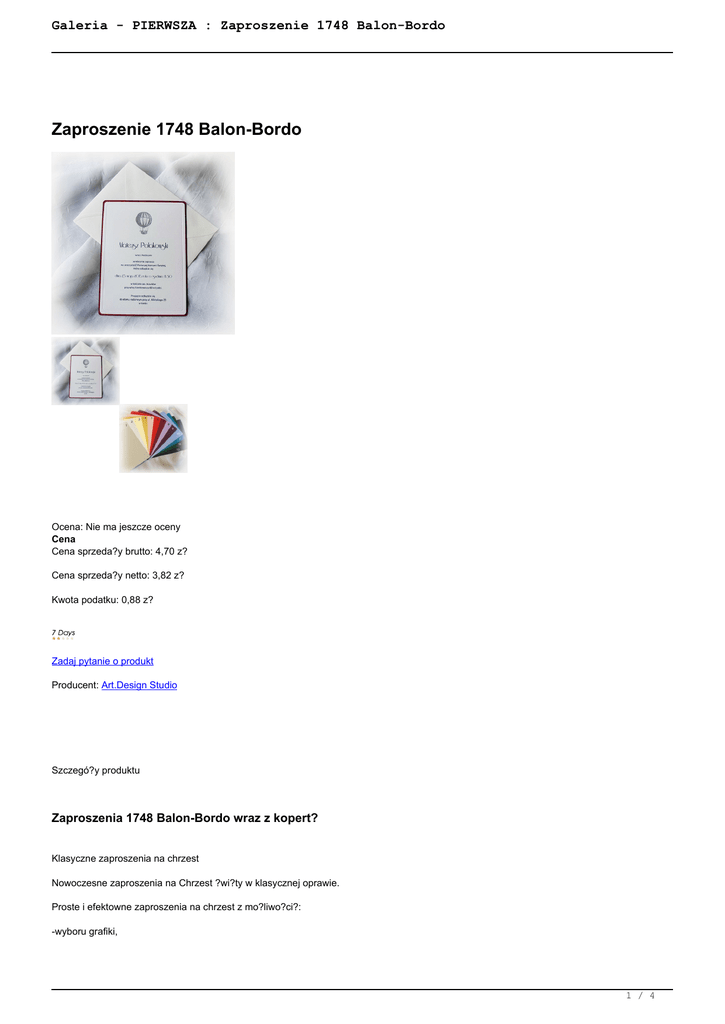 Galeria - PIERWSZA : Zaproszenie 1748 Balon-Bordo Zaproszenie 1748 Balon-Bordo Ocena: Nie ma jeszcze oceny Cena Cena sprzeda?y brutto: 4,70 z? Cena sprzeda?y netto: 3,82 z? Kwota podatku: 0,88 z? Zadaj pytanie o produkt Producent: Art.Design Studio Szczegó?y produktu Zaproszenia 1748 Balon-Bordo wraz z kopert? Klasyczne zaproszenia na chrzest Nowoczesne zaproszenia na Chrzest ?wi?ty w klasycznej oprawie. Proste i efektowne zaproszenia na chrzest z mo?liwo?ci?: -wyboru grafiki, 1 / 4 Galeria - PIERWSZA : Zaproszenie 1748 Balon-Bordo -wymiany koloru ok?adki/podk?adki Nowoczesne zaproszenia z eleganckimi kopertami r?cznie robionymi. Opis Produktu rozmiary: poddruk 135x185 mm ok?adka (podk?adka) 140x190 mm koperta 150x200 mm poddruk: bardzo wysokiej jako?ci papier g?adki, matowy w kolorze kremowym, zdobiony przez nas t?oczeniem w formie delikatnej cienkiej ramki, papier o grubo?ci 250 gram. podk?adka (ok?adka): bardzo wysokiej jako?ci papier g?adki opalizuj?cy w kolorze bordowym, 300g Mo?liwo?? wyboru koloru (13 dost?pnych kolorów) koperta: bardzo wysokiej jako?ci apier delikatnie t?oczony, koperta r?cznie klejona z przet?oczon? ramk? w kolorze kremowym. 120 gram. Zaproszenie 1748_balon_bordo jest dopasowane graficznie do menu M1748, winietki W1748, pude?eczka PD01 Rabaty Ilo?ciowe Zaproszenia ?lubne (z nadrukiem): od 51 do 100 sztuk - 5% od 101 do 150 sztuk - 8% od 151 do 200 sztuk - 10% od 201 sztuk - do uzgodnienia Rabaty ilo?ciowe obejmuj? zamówienia z?o?one na jeden wzór i dotycz? z?o?onych zamówie? na zaproszenia ?lubne z nadrukiem, rabat odliczany jest od cen zaprosze? z nadrukiem. W przypadku zamówienia zaprosze? bez nadruku, rabat nie jest uwzgl?dniany. Rabaty obejmuj? wy??cznie artyku?y z grupy "Zaproszenia ?lubne". Nie dotycz? galerii: OKAZJE Rabaty nie obejmuj? dodatkowych opcji jak: Personalizacja, Wycinanie Laserowe, T?oczenie, Z?ocenie, Dodatkowy Nadruk, Nadruk i Personalizacja na kopertach. * Rabaty nie ??cz? si? z innymi promocjami i okazjami. Dodatkowe Opcje 2 / 4 Galeria - PIERWSZA : Zaproszenie 1748 Balon-Bordo Nadruk dowolnej tre?ci w zaproszeniu: + 0,70 z?/szt. nadruk wykonywany jest na wierzchu prostok?tnego ozdobnego poddruku. Personalizacja nazwisk: + 0,70 z?/szt. mo?liwo?? wpisania nazwisk go?ci w tre?? zaproszenia, np: mamy zaszczyt zaprosi? "Sz.P. Jana Kowalskiego z osob? towarzysz?c?" itp. * Inne Opcje Dodatkowe Jak Zamawia? Z?ó? zamówienie mailem: [email protected], podaj?c wszelkie informacje potrzebne do zrealizowania zamówienia, takie jak: 1. Model Zaproszenia, 2. Ilo?? (ewentualny podzia?, np. wszystkich: 82 szt, w tym 40 szt. zaprosze? na ?lub i wesele, 20 szt. na sam ?lub i 20 szt. jako zawiadomienia, i 2 szt. dla rodziców) 3. Tre?? Zaprosze? (w pliku tekstowym: Word, Excel, Notatnik, w tre?ci wiadomo?ci mailowej), ewentualny podzia? na poszczególne tre?ci (?lub, ?lub i wesele, zawiadomienie, dla Rodziców itp.), 4. Je?li b?dziemy wykonywa? Personalizacj? (osobny plik z imionami i nazwiskami, wypnktowany. W tre?? zaproszenia: w dope?niaczu, je?li na koperty: w mianowniku) 5. Krój Czcionki z naszych propozycji, lub podaj nazw? czcionki. 6. Wybierz Kolor Nadruku, 7. Ewentualny Ozdobnik drukowany na stronach gdzie drukowana b?dzie tre??. 8. Form? zap?aty: Przelew (przedp?ata), Pobranie, P?atno?? gotówk? przy odbiorze osobistym u nas w biurze 9. Form? Wysy?ki: Poczta Polska, Kurier, Odbiór Osobisty Maksymalnie nast?pnego dnia wy?lemy do Ciebie tzw. Sk?ad do Akceptu w PDF, po akceptacji, przyst?pimy do druku i przygotujemy zamówienie do wysy?ki lub odbioru. Je?li masz dodatkowe wytyczne do swojego zamówienia, opisz je w mailu, pomo?e nam to przygotowa? sk?ad i unikn?? zb?dnych poprawek. Wybierz Nadruk Nadruk mo?e by? zupe?nie dowolny. Nadrukujemy ka?d? tre?? nades?an? przez Pa?stwa. Mo?na tak?e wybra? teksty z naszych propozycji. Pozosta?e Informacje 3 / 4 Galeria - PIERWSZA : Zaproszenie 1748 Balon-Bordo Zamówienia realizujemy w czasie 5-7 dni od dnia z?o?enia zamówienia, Maksymalnie nast?pnego dnia wysy?amy Sk?ady do Akceptu (projekt) w PDF, dopiero po akceptacji przyst?pujemy do drukowania zamówienia, Gotowe zamówienie wysy?amy Kurierem UPS, Poczt? Polsk?, lub umawiamy si? na odbiór osobisty w naszym Biurze, Mo?esz zap?aci? przelewem, gotówk? przy odbiorze przesy?ki, lub gotówk? przy odbiorze osobistym w naszym biurze, Minimalna ilo?? to 10 szt w zamówieniu. Je?li masz dodatkowe pytania, prosimy o kontakt e-mail, lub telefonicznie: 22 403 95 48, 503 158 696 Gwarantujemy Najwy?sz? Jako?? Produktów oraz Us?ug. Zapraszamy do zakupów. Art.Design Studio 4 / 4 Powered by TCPDF (www.tcpdf.org)