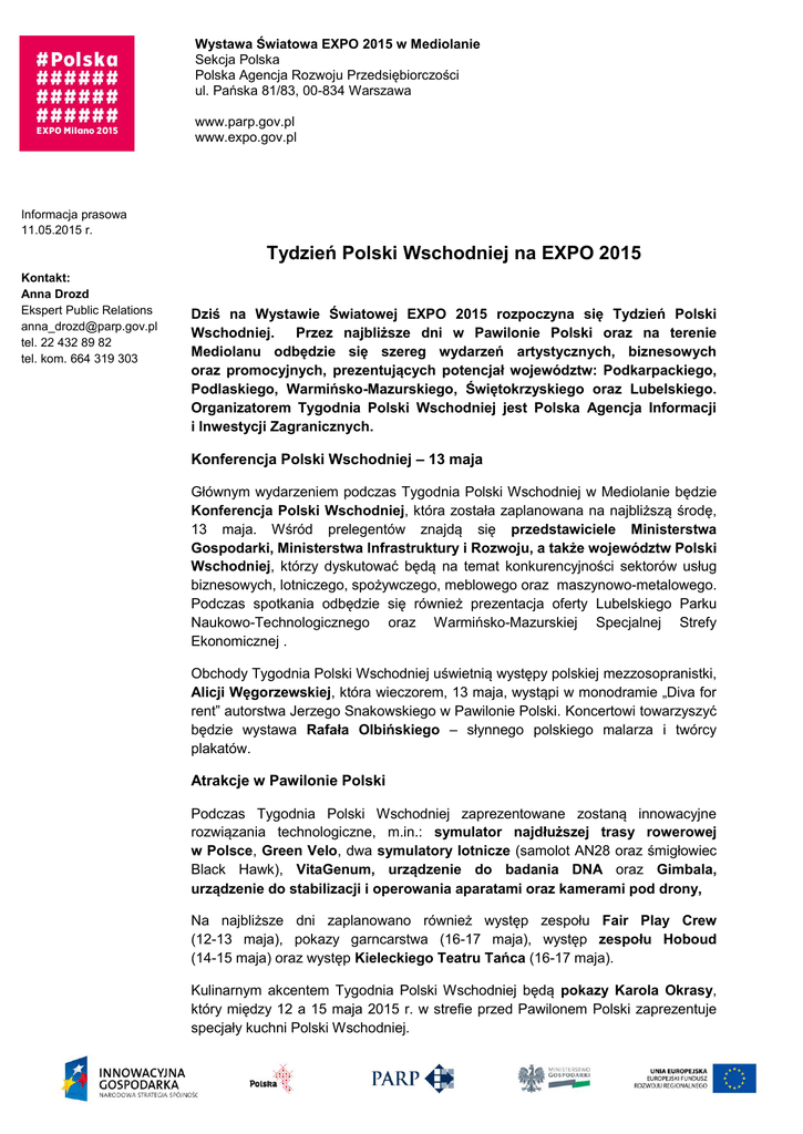Wystawa Światowa EXPO 2015 w Mediolanie Sekcja Polska Polska Agencja Rozwoju Przedsiębiorczości ul. Pańska 81/83, 00-834 Warszawa www.parp.gov.pl www.expo.gov.pl Informacja prasowa 11.05.2015 r. Tydzień Polski Wschodniej na EXPO 2015 Kontakt: Anna Drozd Ekspert Public Relations [email protected] tel. 22 432 89 82 tel. kom. 664 319 303 Dziś na Wystawie Światowej EXPO 2015 rozpoczyna się Tydzień Polski Wschodniej. Przez najbliższe dni w Pawilonie Polski oraz na terenie Mediolanu odbędzie się szereg wydarzeń artystycznych, biznesowych oraz promocyjnych, prezentujących potencjał województw: Podkarpackiego, Podlaskiego, Warmińsko-Mazurskiego, Świętokrzyskiego oraz Lubelskiego. Organizatorem Tygodnia Polski Wschodniej jest Polska Agencja Informacji i Inwestycji Zagranicznych. Konferencja Polski Wschodniej – 13 maja Głównym wydarzeniem podczas Tygodnia Polski Wschodniej w Mediolanie będzie Konferencja Polski Wschodniej, która została zaplanowana na najbliższą środę, 13 maja. Wśród prelegentów znajdą się przedstawiciele Ministerstwa Gospodarki, Ministerstwa Infrastruktury i Rozwoju, a także województw Polski Wschodniej, którzy dyskutować będą na temat konkurencyjności sektorów usług biznesowych, lotniczego, spożywczego, meblowego oraz maszynowo-metalowego. Podczas spotkania odbędzie się również prezentacja oferty Lubelskiego Parku Naukowo-Technologicznego oraz Warmińsko-Mazurskiej Specjalnej Strefy Ekonomicznej . Obchody Tygodnia Polski Wschodniej uświetnią występy polskiej mezzosopranistki, Alicji Węgorzewskiej, która wieczorem, 13 maja, wystąpi w monodramie „Diva for rent” autorstwa Jerzego Snakowskiego w Pawilonie Polski. Koncertowi towarzyszyć będzie wystawa Rafała Olbińskiego – słynnego polskiego malarza i twórcy plakatów. Atrakcje w Pawilonie Polski Podczas Tygodnia Polski Wschodniej zaprezentowane zostaną innowacyjne rozwiązania technologiczne, m.in.: symulator najdłuższej trasy rowerowej w Polsce, Green Velo, dwa symulatory lotnicze (samolot AN28 oraz śmigłowiec Black Hawk), VitaGenum, urządzenie do badania DNA oraz Gimbala, urządzenie do stabilizacji i operowania aparatami oraz kamerami pod drony, Na najbliższe dni zaplanowano również występ zespołu Fair Play Crew (12-13 maja), pokazy garncarstwa (16-17 maja), występ zespołu Hoboud (14-15 maja) oraz występ Kieleckiego Teatru Tańca (16-17 maja). Kulinarnym akcentem Tygodnia Polski Wschodniej będą pokazy Karola Okrasy, który między 12 a 15 maja 2015 r. w strefie przed Pawilonem Polski zaprezentuje specjały kuchni Polski Wschodniej. 1 *** EXPO 2015 Informacja prasowa 11.05.2015 r. Kontakt: Anna Drozd Ekspert Public Relations [email protected] tel. 22 432 89 82 tel. kom. 664 319 303 Organizowane od 1851 roku wystawy EXPO uznawane są za najbardziej prestiżowe wydarzenia promocyjne na świecie. EXPO 2015 odbywa się pod hasłem „Wyżywienie planety, energia dla życia”. Od 1 maja do 31 października w Mediolanie zaprezentuje się niemal 150 państw oraz organizacji, które przedstawią swoje osiągnięcia związane z przemysłem rolno-spożywczym. Organizatorzy EXPO 2015 podkreślają edukacyjną rolę wydarzenia, zarówno w zakresie promowania zdrowego odżywiania, jak i poszukiwania sposobów rozwiązania problemu braku żywności w niektórych regionach świata. W Wystawie weźmie udział niemal 150 krajów z całego świata, a organizatorzy spodziewają się nawet 20 milionów gości. Organizatorem udziału Polski w Wystawie Światowej EXPO 2015 jest Polska Agencja Rozwoju Przedsiębiorczości. Swoją funkcję – zarówno w sferze programowej, jak i organizacyjnej – pełni pod nadzorem Ministerstwa Gospodarki oraz przy wsparciu Komisarza Generalnego Sekcji Polskiej Wystawy Światowej EXPO 2015 w Mediolanie. -------------------------------------------------------------------------------------------------------------------------------------Oficjalna strona poświęcona udziałowi Polski w EXPO 2015: www.expo.gov.pl Oficjalna strona EXPO 2015: www.expo2015.org 2