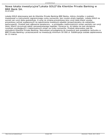 privatebanking.pl Nowa lokata inwestycyjna"Lokata GOLD"dla Klientów Private Banking w BRE Bank SA. 02.03.2006. Lokata GOLD skierowana jest do Klientów Private Banking BRE Banku, którzy chcieliby z zyskiem inwestować w instrumenty zagranicznego rynku surowców, bez ryzyka utraty kapitału. Lokata GOLD na wzrost cen uncji złota gwarantuje, iż wraz ze zmianą procentową ceny uncji złota Klient uzyska procentowy wzrost wypłaconych na zakończenie inwestycji odsetek (proporcjonalny do wskaźnika partycypacji). Produkt jest całkowicie bezpieczny - w przypadku niekorzystnych zmian wartości cen uncji złota, klienci otrzymują całość zainwestowanego kapitału. Oznacza to, że lokata nie jest obciążona ryzykiem wynikającym z niekorzystnych zmian na rynku surowców. Produkt skierowany jest do wszystkich Klientów Private Banking. Warunkiem przystąpienia do inwestycji jest posiadanie rachunku w BRE Private Banking i przeznaczenie na inwestycję minimum 50 000 zł. Subskrypcja została zaplanowana do 13 marca. http://www.privatebanking.pl Kreator PDF Utworzono 7 March, 2017, 08:20
