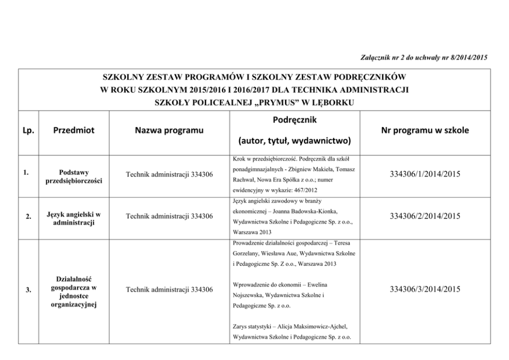 Załącznik nr 2 do uchwały nr 8/2014/2015 SZKOLNY ZESTAW PROGRAMÓW I SZKOLNY ZESTAW PODRĘCZNIKÓW W ROKU SZKOLNYM 2015/2016 I 2016/2017 DLA TECHNIKA ADMINISTRACJI SZKOŁY POLICEALNEJ „PRYMUS” W LĘBORKU Podręcznik Lp. Przedmiot Nazwa programu Nr programu w szkole (autor, tytuł, wydawnictwo) Krok w przedsiębiorczość. Podręcznik dla szkół 1. Podstawy przedsiębiorczości Technik administracji 334306 ponadgimnazjalnych - Zbigniew Makieła, Tomasz Rachwał, Nowa Era Spółka z o.o.; numer 334306/1/2014/2015 ewidencyjny w wykazie: 467/2012 Język angielski zawodowy w branży 2. Język angielski w administracji Technik administracji 334306 ekonomicznej – Joanna Badowska-Kionka, Wydawnictwa Szkolne i Pedagogiczne Sp. z o.o., 334306/2/2014/2015 Warszawa 2013 Prowadzenie działalności gospodarczej – Teresa Gorzelany, Wiesława Aue, Wydawnictwa Szkolne i Pedagogiczne Sp. Z o.o., Warszawa 2013 3. Działalność gospodarcza w jednostce organizacyjnej Technik administracji 334306 Wprowadzenie do ekonomii – Ewelina Nojszewska, Wydawnictwa Szkolne i Pedagogiczne Sp. z o.o. Zarys statystyki – Alicja Maksimowicz-Ajchel, Wydawnictwa Szkolne i Pedagogiczne Sp. z o.o. 334306/3/2014/2015 Podstawy prawa pracy i prawa cywilnego. Cześć 2 4. Podstawy prawa cywilnego Technik administracji 334306 Podstawy prawa cywilnego – Joanna Ablewicz, Wydawnictwa Szkolne i Pedagogiczne Sp. z o.o., 334306/4/2014/2015 Warszawa 2013 Podstawy prawa pracy i prawa cywilnego. Część 1 5. Podstawy prawa pracy Technik administracji 334306 Podstawy prawa pracy – Jacek Boratyński, Wydawnictwa Szkolne i Pedagogiczne Sp. z o.o., 334306/5/2014/2015 Warszawa 2013 Podstawy prawa i postępowania administracyjnego – Joanna Ablewicz, Anna 6. Podstawy prawa administracyjnego Technik administracji 334306 Kociołek-Pęksa, Władysław Pęksa, Emilia Rucińska-Sech, Jarosław Wierzbicki, 334306/6/2014/2015 Wydawnictwa Szkolne i Pedagogiczne Sp. z o.o., Warszawa 2013 Podstawy finansów publicznych – Zofia 7. Podstawy finansów publicznych Technik administracji 334306 Mielczarczyk, Wydawnictwa Szkolne i 334306/7/2014/2015 Pedagogiczne Sp. z o.o., Warszawa 2013 Organizacja i technika pracy biurowej - Urszula 8. Wykonywanie pracy biurowej Technik administracji 334306 Łatka, Wydawnictwa Szkolne i Pedagogiczne, 334306/8/2014/2015 Warszawa 2013 Podstawy prawa i postępowania administracyjnego - Joanna Ablewicz, Anna 9. Postepowanie w administracji Technik administracji 334306 Kociołek-Pęksa, Władysław Pęksa, Emilia Rucińska-Sech, Jarosław Wierzbicki, Wydawnictwa Szkolne i Pedagogiczne, Warszawa 2013 334306/9/2014/2015