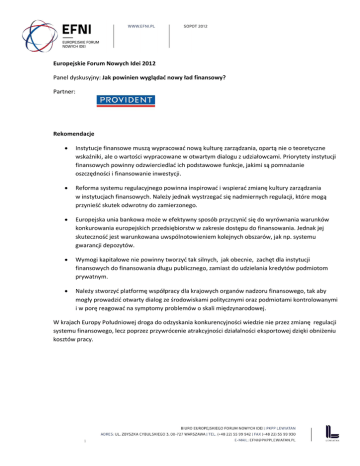 Europejskie Forum Nowych Idei 2012 Panel dyskusyjny: Jak powinien wyglądać nowy ład finansowy? Partner: Rekomendacje  Instytucje finansowe muszą wypracować nową kulturę zarządzania, opartą nie o teoretyczne wskaźniki, ale o wartości wypracowane w otwartym dialogu z udziałowcami. Priorytety instytucji finansowych powinny odzwierciedlać ich podstawowe funkcje, jakimi są pomnażanie oszczędności i finansowanie inwestycji.  Reforma systemu regulacyjnego powinna inspirować i wspierać zmianę kultury zarządzania w instytucjach finansowych. Należy jednak wystrzegać się nadmiernych regulacji, które mogą przynieść skutek odwrotny do zamierzonego.  Europejska unia bankowa może w efektywny sposób przyczynić się do wyrównania warunków konkurowania europejskich przedsiębiorstw w zakresie dostępu do finansowania. Jednak jej skuteczność jest warunkowana uwspólnotowieniem kolejnych obszarów, jak np. systemu gwarancji depozytów.  Wymogi kapitałowe nie powinny tworzyć tak silnych, jak obecnie, zachęt dla instytucji finansowych do finansowania długu publicznego, zamiast do udzielania kredytów podmiotom prywatnym.  Należy stworzyć platformę współpracy dla krajowych organów nadzoru finansowego, tak aby mogły prowadzić otwarty dialog ze środowiskami politycznymi oraz podmiotami kontrolowanymi i w porę reagować na symptomy problemów o skali międzynarodowej. W krajach Europy Południowej droga do odzyskania konkurencyjności wiedzie nie przez zmianę regulacji systemu finansowego, lecz poprzez przywrócenie atrakcyjności działalności eksportowej dzięki obniżeniu kosztów pracy. 1