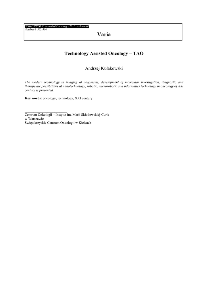 NOWOTWORY Journal of Oncology · 2010 · volume 60 Number 6 ·562-564 Varia Technology Assisted Oncology – TAO Andrzej Kułakowski The modern technology in imaging of neoplasms, development of molecular investigation, diagnostic and therapeutic possibilities of nanotechnology, robotic, microrobotic and informatics technology in oncology of XXI century is presented. Key words: oncology, technology, XXI century ________________________ Centrum Onkologii – Instytut im. Marii Skłodowskiej-Curie w Warszawie Świętokrzyskie Centrum Onkologii w Kielcach