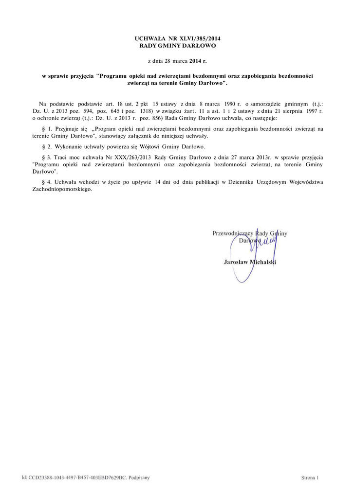UCHWAŁA NR XLVI/385/2014 RADY GMINY DARŁOWO z dnia 28 marca 2014 r. w sprawie przyjęcia "Programu opieki nad zwierzętami bezdomnymi oraz zapobiegania bezdomności zwierząt na terenie Gminy Darłowo". Na podstawie podstawie art. 18 ust. 2 pkt 15 ustawy z dnia 8 marca 1990 r. o samorządzie gminnym (t.j.: Dz. U. z 2013 poz. 594, poz. 645 i poz. 1318) w związku żart. 11 a ust. 1 i 2 ustawy z dnia 21 sierpnia 1997 r. o ochronie zwierząt (t.j.: Dz. U. z 2013 r. poz. 856) Rada Gminy Darłowo uchwala, co następuje: § 1. Przyjmuje się „Program opieki nad zwierzętami bezdomnymi oraz zapobiegania bezdomności zwierząt na terenie Gminy Darłowo", stanowiący załącznik do niniejszej uchwały. § 2. Wykonanie uchwały powierza się Wójtowi Gminy Darłowo. § 3. Traci moc uchwała Nr XXX/263/2013 Rady Gminy Darłowo z dnia 27 marca 2013r. w sprawie przyjęcia "Programu opieki nad zwierzętami bezdomnymi oraz zapobiegania bezdomności zwierząt, na terenie Gminy Darłowo". § 4. Uchwała wchodzi w życie po upływie 14 dni od dnia publikacji w Dzienniku Urzędowym Województwa Zachodniopomorskiego. Załącznik Nr 1 do Uchwały Nr XLVI/385/2014 Rady Gminy Darłowo z dnia 28 marca 2014 r. Program opieki nad zwierzętami bezdomnymi oraz zapobiegania bezdomności zwierząt na terenie Gminy Darłowo Program ma zastosowanie do wszystkich zwierząt domowych, w szczególności psów i kotów, w tym kotów wolno żyjących oraz zwierząt gospodarskich. Podstawowym zadaniem opracowania niniejszego programu jest określenie celów i kierunków działalności Gminy Darłowo zwanej dalej Gminą wobec problemu bezdomności zwierząt domowych. § 1. I. Rada Gminy Darłowo określa następujące cele gminnego programu przeciwdziałania bezdomności zwierząt domowych: 1) zapewnienie opieki zwierzętom bezdomnym z terenu Gminy; 2) zmniejszenie populacji zwierząt bezdomnych; 3) zapewnienie bezpieczeństwa mieszkańcom Gminy; 4) edukację mieszkańców Gminy w zakresie humanitarnego traktowania zwierząt. 2. Wykonawcami programu są: 1) Urząd Gminy Darłowo; 2) Straż Gminna, Policja i Straż Pożarna oraz organizacje pożytku publicznego, stowarzyszenia i fundacje, których statutowym celem działania jest ochrona zwierząt, oraz przeciwdziałanie bezdomności zwierząt w sposób niestwarzający zagrożenia dla zdrowia i życia zwierząt oraz nie zadający im cierpienia; 3) Lecznica Zwierząt, ul. Morska 43 B, 76-150 Darłowo - zapewniająca całodobową opiekę weterynaryjną; 4) Schronisko dla zwierząt, ul. VI Dywizji Piechoty 60, 78-100 Kołobrzeg - zapewniające miejsca dla bezdomnych zwierząt odławianych z terenu Gminy Darłowo oraz obligatoryjną ich sterylizację i kastrację; 5) dzierżawcy obwodów łowieckich na terenie Gminy Darłowo. § 2. Zapewnienie opieki bezdomnym zwierzętom realizowane będzie poprzez: 1) zbieranie z terenu Gminy psów bezdomnych, zagubionych, wałęsających się, pozostających bez opieki właściciela przez Straż Gminną oraz służby weterynaryjne; 2) odławianie bezdomnych zwierząt będzie prowadzone za pomocą specjalistycznego sprzętu, który nie będzie stwarzał zagrożenia dla życia i zdrowia zwierząt, oraz nie będzie zadawał im cierpienia; 3) umożliwienie przekazania pod tymczasową opiekę Gminy zwierząt, które w wyniku wypadków losowych (zgon właściciela, długotrwały pobyt w szpitalu, itp.) utraciły właściciela; 4) zapewnienie opieki lekarsko-weterynaryjnej, schronienia i wyżywienia bezdomnym psom zebranym z terenu Gminy oraz zwierząt, które utraciły właściciela; 5) dokarmianie bezdomnych kotów znajdujących się na terenie Gminy Darłowo poprzez zakup karmy i przekazanie jej sołtysom lub osobom działającym społecznie na rzecz ochrony zwierząt; 6) poszukiwanie nowych właścicieli dla zwierząt bezdomnych przebywających tymczasowo pod opieką Gminy poprzez zamieszczanie na stronie internetowej i tablicach ogłoszeń Urzędu Gminy Darłowo informacji o zwierzętach oczekujących na nowego opiekuna, o osobach, które chcą otoczyć opieką bezdomnego psa lub kota oraz o osobach deklarujących uzasadnioną konieczność oddania zwierząt pod opiekę; jednostkami odpowiedzialnymi za rozpowszechnianie powyższych informacji są: Referat Komunalny i Straż Gminna; 7) gospodarstwem rolnym zapewniającym miejsca zwierzętom gospodarskim jest gospodarstwo rolne znajdujące się w miejscowości Żukowo Morskie 3. 76-156 Darłowo; § 3. Zmniejszenie populacji zwierząt bezdomnych realizowane będzie poprzez: 1) prowadzenie działań edukacyjnych w zakresie opieki nad zwierzętami i humanitarnego traktowania zwierząt; 2) wprowadzenie mechanizmów finansowych zachęcających właścicieli zwierząt do ich sterylizacji i kastracji, polegających na zwolnieniu z opłaty od posiadania psów właścicieli zwierząt wysterylizowanych i wykastrowanych; 3) wprowadzenie mechanizmów finansowych zachęcających mieszkańców Gminy do adopcji zwierząt pozostających pod tymczasową opieką Gminy, polegających na sfinansowaniu pierwszej wizyty u lekarza weterynarii; 4) współpracę ze społecznymi opiekunami kotów wolno żyjących w zakresie ograniczania ich rozrodczości; 5) umożliwienie bezpłatnego usypiania „ślepych miotów" do wyczerpania środków finansowych przeznaczonych na ten cel w danym roku w budżecie Gminy; podmiotami odpowiedzialnymi za usypianie „ślepych miotów" będą: Lecznica Zwierząt, ul. Morska 43 B, 76-150 Darłowo oraz Schronisko dla zwierząt, ul. VI Dywizji Piechoty 60, 78-100 Kołobrzeg; 6) zapewnienie całodobowej opieki weterynaryjnej w przypadkach zdarzeń drogowych z udziałem zwierząt, zgodnie z podpisaną umową na świadczenie usług weterynaryjnych, tj. Lecznicą Zwierząt, ul. Morska 43 B, 76-150 Darłowo. § 4. Edukacja mieszkańców Gminy w zakresie humanitarnego traktowania zwierząt realizowana będzie poprzez: 1) zachęcenie nauczycieli w szkołach z terenu Gminy do włączenia treści pr