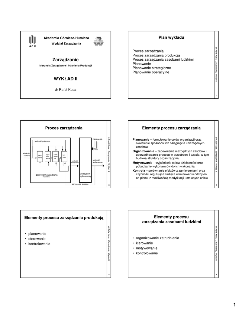 Plan wykładu Akademia Górniczo-Hutnicza Wydział Zarządzania Zarządzanie kierunek: Zarządzanie i Inżynieria Produkcji WYKŁAD II dr Rafał Kusa, Zarządzanie, Wykład II Proces zarządzania Proces zarządzania produkcją Proces zarządzania zasobami ludzkimi Planowanie Planowanie strategiczne Planowanie operacyjne dr Rafał Kusa 2 Proces zarządzania Elementy procesu zarządzania planowanie organizowanie motywowanie kontrola wielkość realizowana wielkość nastawiana podsystem zarządzania (regulator) podsystem wykonawczy sprzężenie zwrotne Planowanie – formułowanie celów organizacji oraz określenie sposobów ich osiągnięcia i niezbędnych zasobów Organizowanie – zapewnienie niezbędnych zasobów i uporządkowanie procesu w przestrzeni i czasie, w tym budowa struktury organizacyjnej Motywowanie – wyjaśnianie celów działalności oraz pobudzanie wykonawców do ich wykonania Kontrola – porównanie efektów z zamierzeniami oraz czynności regulujące służące eliminowaniu odchyleń od planu, z możliwością modyfikacji ustalonych celów 3 4 Elementy procesu zarządzania zasobami ludzkimi Elementy procesu zarządzania produkcją 5 • • • • organizowanie zatrudnienia kierowanie motywowanie kontrolowanie dr Rafał Kusa, Zarządzanie, Wykład II dr Rafał Kusa, Zarządzanie, Wykład II • planowanie • sterowanie • kontrolowanie dr Rafał Kusa, Zarządzanie, Wykład II wielkość zadana dr Rafał Kusa, Zarządzanie, Wykład II zakłócenia wielkość pożądana 6 1 Szczeblowy podział funkcji Proces zarządzania w zmiennym otoczeniu dr Rafał Kusa, Zarządzanie, Wykład II dr Rafał Kusa, Zarządzanie, Wykład II 7 8 Funkcje systemu zarządzania w zmiennym otoczeniu • wiązki celów • projektowane oddziaływania materialnoenergetyczne • niezbędne zasoby osobowe i rzeczowe Planowanie – reakcja na rodzące problemy relacje między przedsiębiorstwem a jego otoczeniem 9 Misja, cele, zadania 10 Strategiczny poziom zarządzania 11 Strategiczny poziom zarządzania – określa ogólną orientację organizacji w otoczeniu, precyzuje jej misję, główne cele, wyroby i rynki oraz rozdziela zasoby między podstawowe obszary działania organizacji dr Rafał Kusa, Zarządzanie, Wykład II dr Rafał Kusa, Zarządzanie, Wykład II Misja – przedmiot aspiracji, czyli trwałych dążeń organizacji, określony zwykle w akcie erekcyjnym lub statucie, jako zakres jej społecznie pożądanej działalności Cel – określony przedmiotowo i podmiotowo, przyszły, pożądany stan lub rezultat działania organizacji, możliwy i przewidziany do osiągnięcia w terminie lub okresie mieszczącym się w przedziale czasu objętym wieloletnim lub krótkookresowym planem działania Zadanie – wyodrębniona przedmiotowo, podmiotowo, przestrzennie, czasowo i na ogół też proceduralnie część celu przewidziana do wykonania w ustalonym okresie lub terminie mieszczącym się w przedziale czasu przewidzianym na osiągnięcie tego celu dr Rafał Kusa, Zarządzanie, Wykład II dr Rafał Kusa, Zarządzanie, Wykład II Selekcja sygnałów z otoczenia – sposób na redukcję złożoności otoczenia; pociąga za sobą ryzyko pominięcia pewnych sygnałów Kompensacja skutków ryzyka – wyznaczenie nowych granic organizacji, zdolnych zapewnić stabilizację pracy systemu Rozwój systemu poprzez wytycznie nowych granic – sposób kompensacji ryzyka Elementy planu 12 2 Operacyjny poziom zarządzania • • • • analiza szans i zagrożeń w otoczeniu organizacji analiza słabych i mocnych stron organizacji budowa opcji strategicznych organizacji przyjęcie założeń strategicznych określających hipotetyczne kierunki przewidywanych zmian w otoczeniu organizacji • ocena opcji strategicznych i wybór wariantu zapewniającego najwyższy stopień osiągnięcia głównych celów organizacji • opracowanie planu implementacji strategii 13 dr Rafał Kusa, Zarządzanie, Wykład II dr Rafał Kusa, Zarządzanie, Wykład II Operacyjny poziom zarządzania – odpowiada za bieżące funkcjonowanie przedsiębiorstwa i zapewnia mu ciągłe warunki bytowania Elementy planowania strategicznego 14 Schemat zarządzania strategicznego Analiza SWOT - Organizacja Mocne strony (Strenghts) Słabe strony (Weaknesses) Otoczenie Szanse (Opportunities) Zagrożenia (Threaths) 15 Decyzje strategiczne w organizacji dr Rafał Kusa, Zarządzanie, Wykład II dr Rafał Kusa, Zarządzanie, Wykład II + 16 Zadania zarządzania operacyjnego dr Rafał Kusa, Zarządzanie, Wykład II dr Rafał Kusa, Zarządzanie, Wykład II 17 • zapewnienie sprawnej realizacji strategii • rozwiązanie szczegółowych problemów nie ujętych w planie strategicznym 18 3 Zadania planu operacyjnego • • dr Rafał Kusa, Zarządzanie, Wykład II • detalizacja planowania strategicznego do konkretnych planów działania w przestrzeni i czasie zabezpieczenie podstawowych warunków bytu organizacji: rentowności i płynności finansowej określenie poziomu produkcji, zbytu, zatrudnienia, zaopatrzenia, urządzeń oraz prac badawczo-rozwojowych (plany procesów rzeczowych) określenie wpływów, kosztów, wyniku kalkulacyjnego (plan procesów finansowych) dr Rafał Kusa, Zarządzanie, Wykład II • System planów operacyjnych 19 20 Plany cząstkowe w planowaniu produkcji Cykl produkcji i obiegu gotówki dr Rafał Kusa, Zarządzanie, Wykład II dr Rafał Kusa, Zarządzanie, Wykład II 21 22 Przykładowy proces planowania Ciągłość i elastyczność planowania dr Rafał Kusa, Zarządzanie, Wykład II Elastyczność planowania – gwarantuje szybką weryfikację planu, jeśli zmiany w otoczeniu i samym przedsiębiorstwie powodują niewydolność obowiązującej strategii dr Rafał Kusa, Zarządzanie, Wykład II Ciągłość planowania – planowanie operatywne musi zabezpieczać realizację obowiązującej strategii 23 24 4 Wykresy Gantta Ścieżka krytyczna dr Rafał Kusa, Zarządzanie, Wykład II dr Rafał Kusa, Zarządzanie, Wyk