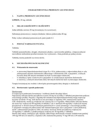 CHARAKTERYSTYKA PRODUKTU LECZNICZEGO 1. NAZWA PRODUKTU LECZNICZEGO LIPROX, 20 mg, tabletki 2. SKŁAD JAKOŚCIOWY I ILOŚCIOWY Jedna tabletka zawiera 20 mg lowastatyny (Lovastatinum). Substancja pomocnicza o znanym działaniu: laktoza jednowodna 40 mg Pełny wykaz substancji pomocniczych, patrz punkt 6.1. 3. POSTAĆ FARMACEUTYCZNA Tabletka Tabletki jasnoniebieskie, okrągłe, obustronnie płaskie, o powierzchni gładkiej, z dopuszczalnymi niewielkimi niebieskimi przebarwieniami, bez wykruszeń, z linią podziału po jednej stronie. Tabletkę można podzielić na równe dawki. 4. SZCZEGÓŁOWE DANE KLINICZNE 4.1. Wskazania do stosowania w pierwotnej hipercholesterolemii (typu II a i II b), jednocześnie z odpowiednią dietą w celu zmniejszenia stężenia cholesterolu całkowitego i cholesterolu LDL u pacjentów, u których leczenie dietą lub innymi metodami nie było wystarczająco skuteczne, w miażdżycy tętnic wieńcowych u pacjentów ze zwiększonym stężeniem cholesterolu w surowicy, u których stosowanie diety lub innych metod nie było wystarczająco skuteczne. Terapia lowastatyną nie zwalnia z obowiązku przestrzegania diety ubogiej w cholesterol. 4.2. Dawkowanie i sposób podawania Dawkowanie O rozpoczęciu podawania lowastatyny i wielkości dawki decyduje lekarz. Najczęściej zalecana dawka początkowa wynosi 20 mg raz na dobę (1 tabletka) przyjmowana podczas wieczornego posiłku. Pacjenci z łagodną lub umiarkowaną hipercholesterolemią mogą rozpocząć leczenie od dawki 10 mg. Jeśli dawka ta nie powoduje co najmniej 20% zmniejszenia stężenia LDL-cholesterolu, można ją zwiększać nie częściej niż co 4 tygodnie. Maksymalna zalecana dawka nie może być większa niż 80 mg/dobę (4 tabletki). Lek w dawkach 40 mg/dobę i większych można przyjmować w dwóch równych dawkach podzielonych w czasie porannego i wieczornego posiłku. U pacjentów stosujących jednocześnie leki immunosupresyjne oraz u pacjentów z niewydolnością nerek i zaburzeniami przepływu żółci, nie należy stosować dawki początkowej większej niż 10 mg/dobę (½ tabletki), a podtrzymującej większej niż 20 mg/dobę (1 tabletka). Dawkę leku należy zmniejszyć gdy stężenie całkowitego cholesterolu zostanie zredukowane poniżej 140 mg/100 ml (3,6 mmol/l), a stężenie LDL-cholesterolu poniżej 75 mg/100 ml (1,94 mmol/l). 1 Dzieci i młodzież Nie określono bezpieczeństwa i skuteczności stosowania lowastatyny u dzieci. Dane obecnie dostępne opisane są w punktach 4.8 i 5.1, ale brak zaleceń dotyczących dawkowania. Sposób podawania Tabletki należy przyjmować doustnie, raz na dobę, podczas wieczornego posiłku. 4.3. Przeciwwskazania Przeciwwskazaniem do stosowania produktu Liprox jest: nadwrażliwość na substancję czynną lub na którąkolwiek substancję pomocniczą wymienioną w punkcie 6.1, ciąża i okres karmienia piersią, czynna choroba wątroby, utrzymywanie się podwyższonego poziomu aminotransferaz (więcej niż trzykrotnie przekraczającego normę), ciężka niewydolność nerek, choroby mięśni szkieletowych (miopatie), utrudniony odpływ żółci (cholestaza), jednoczesne stosowanie silnych inhibitorów enzymu CYP 3A4 (np. itrakonazolu, ketokonazolu, inhibitorów proteazy wirusa HIV, erytromycyny, klarytromycyny, telitromycyny i nefazodonu (patrz punkt 4.5), jednoczesne stosowanie z mibefradilem, antagonistą kanału wapniowego z grupy pochodnych tetralolowych (patrz punkty 4.4 i 4.5). Produktu nie przyjmować równocześnie z alkoholem. Przyjmowanie lowastatyny przez osoby nadużywające alkoholu zwiększa ryzyko alkoholowego uszkodzenia wątroby. Osoby uzależnione od alkoholu nie powinny stosować tego produktu leczniczego. 4.4. Specjalne ostrzeżenia i środki ostrożności dotyczące stosowania Decyzję o zastosowaniu leku powinny poprzedzać próby obniżenia poziomu cholesterolu przez zastosowanie odpowiedniej diety i dążenie do obniżenia masy ciała. Podwyższony poziom aminotransferaz, nawet bez widocznych innych oznak choroby, powinien skłaniać do zachowania szczególnej ostrożności w stosowaniu lowastatyny. Jeśli w badaniach powtarzanych w odstępie 2 tygodni, zarówno przed zastosowaniem leku, jak i podczas jego stosowania, poziom aminotransferaz w surowicy przekracza trzykrotną wartość normy, należy zaniechać podawania lowastatyny. Ostrożność w stosowaniu leku należy zachować u pacjentów zgłaszających przebyte choroby wątroby. Pacjenci z niewydolnością nerek, u których klirens kreatyniny jest mniejszy niż 30 mL/min, nie powinni przyjmować leku w dawce wyższej niż 20 mg/dobę. Leczenie lowastatyną powinno być czasowo przerwane podczas ostrych chorób zakaźnych, przy dużych zabiegach chirurgicznych, znacznych urazach, po wystąpieniu poważnych zaburzeń metabolicznych lub elektrolitowych, w chorobach endokrynologicznych, w niedociśnieniu i w stanach drgawkowych. Miażdżyca jest procesem przewlekłym, w którym przerwanie podawania leków obniżających poziom cholesterolu na pewien czas nie będzie miało wielkiego wpływu na ostateczny wynik leczenia. Zgłoszono bardzo rzadkie przypadki wystąpienia immunozależnej miopatii martwiczej (ang. Immunemediated necrotizing myopathy, IMNM) w trakcie leczenia statynami lub po jego zakończeniu. Cechy kliniczne IMNM to utrzymujące się osłabienie mięśni proksymalnych oraz zwiększona aktywność kinazy kreatynowej w surowicy, utrzymująca się mimo przerwania leczenia statynami. 2 Miopatia/rabdomioliza (rozpad mięśni poprzecznie prążkowanych) Lowastatyna, podobnie jak inne inhibitory reduktazy HMG-CoA, wywołuje niekiedy miopatię objawiającą się bólami mięśni, tkliwością lub osłabieniem, z towarzyszącym zwiększeniem aktywności kinazy kreatynowej (CK) do ponad 10 razy powyżej górnej granicy wartości uznanej za prawidłową. Miopatia czasem przekształca się w rabdomiolizę z lub bez ostrej niewydolności nerek spowodowanej mioglobinurią. Odnoto