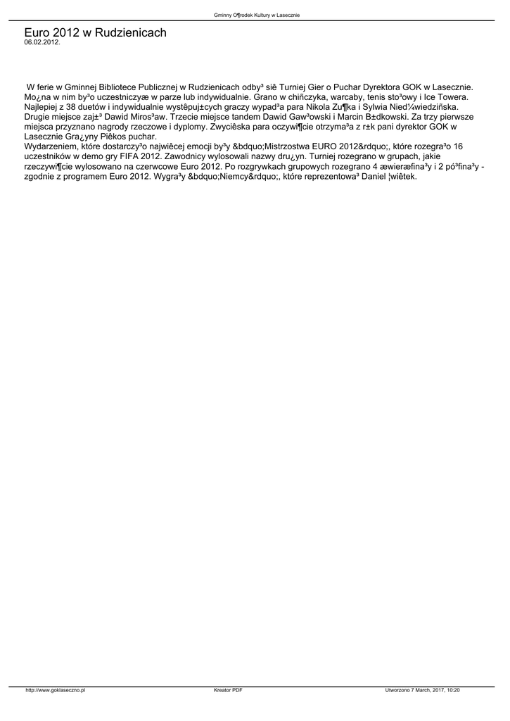 Gminny O¶rodek Kultury w Lasecznie Euro 2012 w Rudzienicach 06.02.2012. W ferie w Gminnej Bibliotece Publicznej w Rudzienicach odby³ siê Turniej Gier o Puchar Dyrektora GOK w Lasecznie. Mo¿na w nim by³o uczestniczyæ w parze lub indywidualnie. Grano w chiñczyka, warcaby, tenis sto³owy i Ice Towera. Najlepiej z 38 duetów i indywidualnie wystêpuj±cych graczy wypad³a para Nikola Zu¶ka i Sylwia Nied¼wiedziñska. Drugie miejsce zaj±³ Dawid Miros³aw. Trzecie miejsce tandem Dawid Gaw³owski i Marcin B±dkowski. Za trzy pierwsze miejsca przyznano nagrody rzeczowe i dyplomy. Zwyciêska para oczywi¶cie otrzyma³a z r±k pani dyrektor GOK w Lasecznie Gra¿yny Piêkos puchar. Wydarzeniem, które dostarczy³o najwiêcej emocji by³y „Mistrzostwa EURO 2012”, które rozegra³o 16 uczestników w demo gry FIFA 2012. Zawodnicy wylosowali nazwy dru¿yn. Turniej rozegrano w grupach, jakie rzeczywi¶cie wylosowano na czerwcowe Euro 2012. Po rozgrywkach grupowych rozegrano 4 æwieræfina³y i 2 pó³fina³y zgodnie z programem Euro 2012. Wygra³y „Niemcy”, które reprezentowa³ Daniel ¦wiêtek. http://www.goklaseczno.pl Kreator PDF Utworzono 7 March, 2017, 10:20