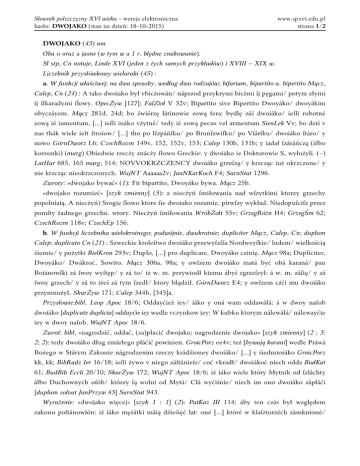 Słownik polszczyzny XVI wieku - wersja elektroniczna hasło: DWOJAKO (stan na dzień: 18-10-2015) www.spxvi.edu.pl strona 1/2 DWOJAKO (45) nm Oba o oraz a jasne (w tym w a 1 r. błędne znakowanie). Sł stp, Cn notuje, Linde XVI (jeden z tych samych przykładów) i XVIII – XIX w. Liczebnik przysłówkowy wieloraki (45) : a. W funkcji właściwej; na dwa sposoby, według dwu rodzajów; bifariam, bipartito a. bipertito Mącz, Calep, Cn (24) : A tako dwoiako był vbicżowán/ náprzod przykrymi bicżmi ij pęgami/ potym złymi ij ſſkaradymi ſlowy. OpecŻyw [127]; FalZioł V 32v; Bipartito sive Bipertito Dwoyáko/ dwoyákim obyczáyem. Mącz 281d, 24d; bo źwiérzę látinowie zową fera: bydlę záś dwoiáko/ ieſli robotné zową ié iumentum, [...] ieſli ináko vżytné/ tedy ié zową pecus vel armentum SienLek Vv; bo dziś v nas thák wiele ieſt ſtroiow/ [...] tho po Iſzpáńſku/ po Brunſzwiſku/ po Vſárſku/ dwoiáko ſtáro/ y nowo GórnDworz L6; CzechRozm 149v, 152, 152v, 153; Calep 130b, 131b; y iadał ſzáráńczą (álbo korzonki) (marg) Obiedwie rzecży znácży ſłowo Greckie: y dwoiáko ie Doktorowie S, wyłożyli. (‒) LatHar 685, 165 marg, 514; NOVVOKRZCZENCY dwoiáko grzeſzą/ y krzcząc iuż okrzczone/ y nie krzcząc nieokrzczonych. WujNT Aaaaaa2v; JanNKarKoch F4; SarnStat 1296. Zwroty: »dwojako bywać« (1): Fit bipartito, Dwoyáko bywa. Mącz 25b. »dwojako rozumieć« [szyk zmienny] (5): a niecżyń ſmiłowania nad wſzytkimi ktorzy grzechy popełniaią. A niecżyń) Srogie ſlowo ktore ſie dwoiako rozumie, pirwſzy wykład. Niedopuſciſz przez pomſty żadnego grzechu. wtory. Niecżyń ſmiłowania WróbŻołt 55v; GrzegRóżn H4; GrzegŚm 62; CzechRozm 118v; CzechEp 156. b. W funkcji liczebnika wielokrotnego; podwójnie, dwukrotnie; dupliciter Mącz, Calep, Cn; duplum Calep; duplicato Cn (21) : Szweckie kroleſtwo dwoiáko przewyſzſſa Nordweyſkie/ ludem/ wielkością źiemie/ y pożytki BielKron 293v; Duplo, [...] pro duplicare, Dwoyáko czinię. Mącz 98a; Dupliciter, Dwoyáko/ Dwákroć, Sowito. Mącz 306a, 98a; y owſzem dwoiáko matá być obá karaná/ pan Boiánowſki zá ſwoy wyſtęp/ y zá to/ iż w. m. przywiodł ktemu ábyś zgrzeſzył: á w. m. záſię/ y zá ſwoy grzech/ y zá to iżeś zá tym ſzedł/ ktory błądził. GórnDworz E4; y owſzem cżći mu dwoiáko przymnożył. SkarŻyw 171; Calep 344b, [345]a. Przysłowie:bibl. Leop Apoc 18/6; Oddayćież iey/ iáko y oná wam oddawáłá: á w dwoy naſob dwoiáko [duplicate duplicia] oddayćie iey wedle vczynkow iey: W kubku ktorym nálewáłá/ nálewayćie iey w dwoy naſob. WujNT Apoc 18/6. Zwrot: bibl. »nagrodzić, oddać, (za)płacić dwojako; nagrodzenie dwojako« [szyk zmienny] (2 : 3: 2; 2): tedy dwoiáko dług zmárłego płáćić powinien. GroicPorz ee4v; też [bywają karani] wedle Práwá Bożego w Stárym Zakonie nágrodzenim rzeczy krádźioney dwoiáko/ [...] y śiedmioráko GroicPorz kk, kk; BibRadz Ier 16/18; ieſli żywo v niego záſtánieſz/ coć vkradł/ dwoiákoć niech odda BiałKat 61; BudBib Eccli 20/10; SkarŻyw 172; WujNT Apoc 18/6; iż iáko wiele który Mytnik od ſzláchty álbo Duchownych oſób/ którzy ſą wolni od Mytá/ Cłá wyćiśnie/ niech im ono dwoiáko zápłáći [duplum solvat JanPrzyw 43] SarnStat 943. Wyrażenie: »dwojako więcej« [szyk 1 : 1] (2): PatKaz III 114; áby ten czás był względem zakonu poſtánowión: iż iáko mężátki máią dźieśięć lat: oné [...] któré w klaſztorzéch zámknioné/ Słownik polszczyzny XVI wieku - wersja elektroniczna hasło: DWOJAKO (stan na dzień: 18-10-2015) www.spxvi.edu.pl strona 2/2 y wychowáné ták rychło o rzeczach ſwych wiádomośći mieć nie mogą/ dwoiáko więcéy [duplum JanStat 214] czás miáły. SarnStat 209. W przen (1) : Wyrażenie: »miecz dwojako zaostrzony« (1): ieſliby kośćioł przećiw nieprzyiaćielom [...] walcżyć miał: tedy nie cżym inſzym/ iedno miecżem duchownym/ oboygá przymierza dwoyáko záoſtrzonym/ [..,] ktorymby wſzytko pobił. CzechEp 98. Synonim: b. dwakroć, dwojcy, dwojnasob, sowito. Cf DWOISTO ZZie
