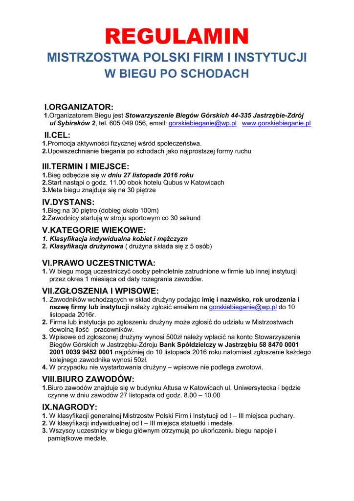 REGULAMIN MISTRZOSTWA POLSKI FIRM I INSTYTUCJI W BIEGU PO SCHODACH I.ORGANIZATOR: 1.Organizatorem Biegu jest Stowarzyszenie Biegów Górskich 44-335 Jastrzębie-Zdrój ul Sybiraków 2, tel. 605 049 056, email: [email protected] www.gorskiebieganie.pl II.CEL: 1.Promocja aktywności fizycznej wśród społeczeństwa. 2.Upowszechnianie biegania po schodach jako najprostszej formy ruchu III.TERMIN I MIEJSCE: 1.Bieg odbędzie się w dniu 27 listopada 2016 roku 2.Start nastąpi o godz. 11.00 obok hotelu Qubus w Katowicach 3.Meta biegu znajduje się na 30 piętrze IV.DYSTANS: 1.Bieg na 30 piętro (dobieg około 100m) 2.Zawodnicy startują w stroju sportowym co 30 sekund V.KATEGORIE WIEKOWE: 1. Klasyfikacja indywidualna kobiet i mężczyzn 2. Klasyfikacja drużynowa ( drużyna składa się z 5 osób) VI.PRAWO UCZESTNICTWA: 1. W biegu mogą uczestniczyć osoby pełnoletnie zatrudnione w firmie lub innej instytucji przez okres 1 miesiąca od daty rozegrania zawodów. VII.ZGŁOSZENIA I WPISOWE: 1. Zawodników wchodzących w skład drużyny podając imię i nazwisko, rok urodzenia i nazwę firmy lub instytucji należy zgłosić emailem na [email protected] do 10 listopada 2016r. 2. Firma lub instytucja po zgłoszeniu drużyny może zgłosić do udziału w Mistrzostwach dowolną ilość pracowników. 3. Wpisowe od zgłoszonej drużyny wynosi 500zł należy wpłacić na konto Stowarzyszenia Biegów Górskich w Jastrzębiu-Zdroju Bank Spółdzielczy w Jastrzębiu 58 8470 0001 2001 0039 9452 0001 najpóźniej do 10 listopada 2016 roku natomiast zgłoszenie każdego kolejnego zawodnika wynosi 50zł. 4. W przypadku nie wystartowania drużyny – wpisowe nie podlega zwrotowi. VIII.BIURO ZAWODÓW: 1.Biuro zawodów znajduje się w budynku Altusa w Katowicach ul. Uniwersytecka i będzie czynne w dniu zawodów 27 listopada od godz. 8.00 – 10.00 IX.NAGRODY: 1. W klasyfikacji generalnej Mistrzostw Polski Firm i Instytucji od I – III miejsca puchary. 2. W klasyfikacji indywidualnej od I – III miejsca statuetki i medale. 3. Wszyscy uczestnicy w biegu głównym otrzymują po ukończeniu biegu napoje i pamiątkowe medale.