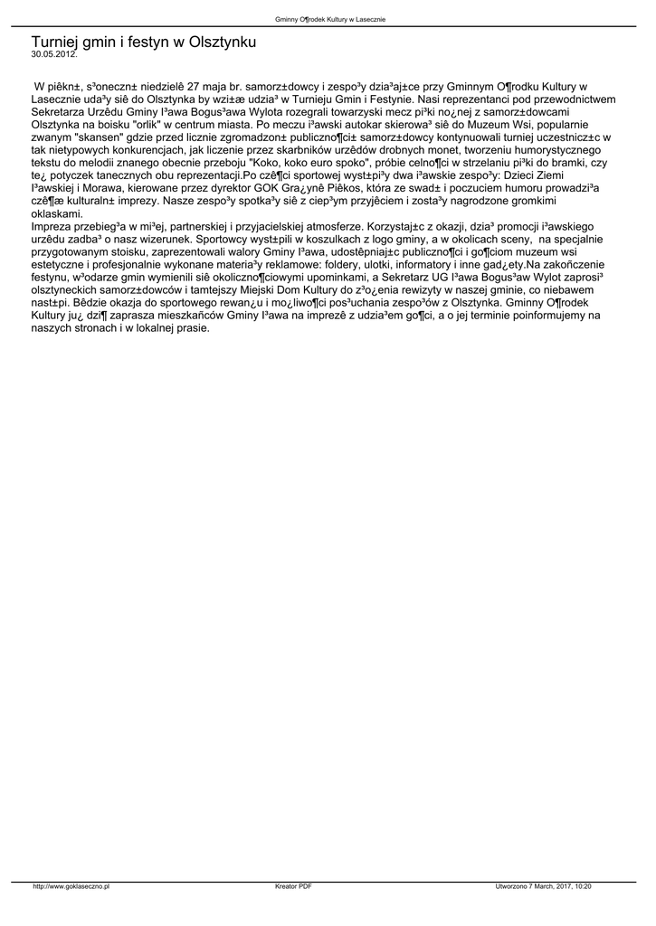 Gminny O¶rodek Kultury w Lasecznie Turniej gmin i festyn w Olsztynku 30.05.2012. W piêkn±, s³oneczn± niedzielê 27 maja br. samorz±dowcy i zespo³y dzia³aj±ce przy Gminnym O¶rodku Kultury w Lasecznie uda³y siê do Olsztynka by wzi±æ udzia³ w Turnieju Gmin i Festynie. Nasi reprezentanci pod przewodnictwem Sekretarza Urzêdu Gminy I³awa Bogus³awa Wylota rozegrali towarzyski mecz pi³ki no¿nej z samorz±dowcami Olsztynka na boisku "orlik" w centrum miasta. Po meczu i³awski autokar skierowa³ siê do Muzeum Wsi, popularnie zwanym "skansen" gdzie przed licznie zgromadzon± publiczno¶ci± samorz±dowcy kontynuowali turniej uczestnicz±c w tak nietypowych konkurencjach, jak liczenie przez skarbników urzêdów drobnych monet, tworzeniu humorystycznego tekstu do melodii znanego obecnie przeboju "Koko, koko euro spoko", próbie celno¶ci w strzelaniu pi³ki do bramki, czy te¿ potyczek tanecznych obu reprezentacji.Po czê¶ci sportowej wyst±pi³y dwa i³awskie zespo³y: Dzieci Ziemi I³awskiej i Morawa, kierowane przez dyrektor GOK Gra¿ynê Piêkos, która ze swad± i poczuciem humoru prowadzi³a czê¶æ kulturaln± imprezy. Nasze zespo³y spotka³y siê z ciep³ym przyjêciem i zosta³y nagrodzone gromkimi oklaskami. Impreza przebieg³a w mi³ej, partnerskiej i przyjacielskiej atmosferze. Korzystaj±c z okazji, dzia³ promocji i³awskiego urzêdu zadba³ o nasz wizerunek. Sportowcy wyst±pili w koszulkach z logo gminy, a w okolicach sceny, na specjalnie przygotowanym stoisku, zaprezentowali walory Gminy I³awa, udostêpniaj±c publiczno¶ci i go¶ciom muzeum wsi estetyczne i profesjonalnie wykonane materia³y reklamowe: foldery, ulotki, informatory i inne gad¿ety.Na zakoñczenie festynu, w³odarze gmin wymienili siê okoliczno¶ciowymi upominkami, a Sekretarz UG I³awa Bogus³aw Wylot zaprosi³ olsztyneckich samorz±dowców i tamtejszy Miejski Dom Kultury do z³o¿enia rewizyty w naszej gminie, co niebawem nast±pi. Bêdzie okazja do sportowego rewan¿u i mo¿liwo¶ci pos³uchania zespo³ów z Olsztynka. Gminny O¶rodek Kultury ju¿ dzi¶ zaprasza mieszkañców Gminy I³awa na imprezê z udzia³em go¶ci, a o jej terminie poinformujemy na naszych stronach i w lokalnej prasie. http://www.goklaseczno.pl Kreator PDF Utworzono 7 March, 2017, 10:20