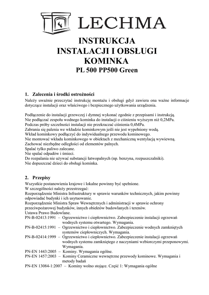 INSTRUKCJA INSTALACJI I OBSŁUGI KOMINKA PL 500 PP500 Green 1. Zalecenia i środki ostrożności Należy uważnie przeczytać instrukcję montażu i obsługi gdyż zawiera ona ważne informacje dotyczące instalacji oraz właściwego i bezpiecznego użytkowania urządzenia. Podłączenie do instalacji grzewczej i dymnej wykonać zgodnie z przepisami i instrukcją. Nie podłączać zespołu wodnego kominka do instalacji o ciśnieniu wyższym niż 0,2MPa. Podczas próby szczelności instalacji nie przekraczać ciśnienia 0,4MPa. Zabrania się palenia we wkładzie kominkowym jeśli nie jest wypełniony wodą. Wkład kominkowy podłączyć do indywidualnego przewodu kominowego. Nie montować wkładu kominkowego w obiektach z mechaniczną wentylacją wywiewną. Zachować niezbędne odległości od elementów palnych. Spalać tylko paliwo zalecane. Nie spalać odpadów i śmieci. Do rozpalania nie używać substancji łatwopalnych (np. benzyna, rozpuszczalniki). Nie dopuszczać dzieci do obsługi kominka. 2. Przepisy Wszystkie postanowienia krajowe i lokalne powinny być spełnione. W szczególności należy przestrzegać: Rozporządzenie Ministra Infrastruktury w sprawie warunków technicznych, jakim powinny odpowiadać budynki i ich usytuowanie. Rozporządzenie Ministra Spraw Wewnętrznych i administracji w sprawie ochrony przeciwpożarowej budynków, innych obiektów budowlanych i terenów. Ustawa Prawo Budowlane. PN-B-02413:1991 – Ogrzewnictwo i ciepłownictwo. Zabezpieczenie instalacji ogrzewań wodnych systemu otwartego. Wymagania. PN-B-02415:1991 – Ogrzewnictwo i ciepłownictwo. Zabezpieczenie wodnych zamkniętych systemów ciepłowniczych. Wymagania. PN-B-02414:1999 – Ogrzewnictwo i ciepłownictwo. Zabezpieczenie instalacji ogrzewań wodnych systemu zamkniętego z naczyniami wzbiorczymi przeponowymi. Wymagania. PN-EN 1443:2005 – Kominy. Wymagania ogólne. PN-EN 1457:2003 – Kominy Ceramiczne wewnętrzne przewody kominowe. Wymagania i metody badań PN-EN 13084-1:2007 – Kominy wolno stojące. Część 1: Wymagania ogólne INSTALACJA 3. Ustawienie wkładu kominkowego Należy wybrać takie miejsce, aby odległość kominka od palnych części budynku i elementów wyposażenia wynosiła nie mniej niż 120cm. Urządzenie powinno być umieszczone na podłożu niepalnym o grubości co najmniej 15cm. Podłoże musi mieć wystarczającą nośność aby przenieść obciążenie wnoszone przez kominek (z wodą) oraz obudowę. Podłoga wokół wkładu kominkowego z materiału łatwo zapalnego powinna być zabezpieczona pasem materiału niepalnego o szerokości co najmniej 50cm poza krawędzie zewnętrzne urządzenia. Wkład kominkowy nie jest przewidziany do wbudowania w istniejącą obudowę (przeróbka istniejącego kominka z otwartym paleniskiem). Jeśli wkład kominkowy instalowany jest we wnęce to jej minimalne wymiary powinny wynosić: szerokość 55cm, głębokości 85cm i wysokości 250cm. Takie wymiary pozwalają na zachowanie wzdłuż wszystkich zewnętrzny ścianek kominka wymaganej przestrzeni do konwekcyjnego opływu powietrza o szerokości nie mniejszej niż 5cm oraz ułożenie na ścianach wnęki izolacji termicznej. W przypadku takiej zabudowy należy pamiętać o zapewnieniu dostępu do elementów wymienionych w punkcie Obudowa. Kominek należy wypoziomować. Należy ustawić kominek odpowiednio do projektowanej obudowy, gdyż po jego podłączeniu do instalacji przestawienie kominka będzie niemożliwe (lub poważnie ograniczone). 4. Komin Dla prawidłowej pracy wkładu kominkowego wymagane jest podciśnienie w przewodzie kominowym 12Pa. Przy innej wartości podciśnienia parametry urządzenia deklarowane przez producenta mogą nie być spełnione. Minimalna wartość podciśnienia wymagana dla bezpiecznej pracy wkładu kominowego to 6Pa. Podciśnienie powyżej 15Pa spowoduje szybsze spalanie, zwiększenie straty kominowej i spadek sprawności urządzenia. Wkład kominkowy musi być podłączony do indywidualnego przewodu kominowego. Pole przekroju wewnętrznego przewodu kominowego nie może być mniejsze do przekroju czopucha wkładu kominkowego. Łącznik odprowadzający spaliny z czopucha wkładu kominkowego powinien byś wprowadzony do komina pod kątem 45°. Połączenia elementów przewodu spalinowego powinny być wykonane w sposób umożliwiający spływanie wykroplonego kondensatu po wewnętrznych ścianach do paleniska. Komin musi zapewnić bezpieczeństwo przy maksymalnej temperaturze spalin. Na przewodzie odprowadzającym spaliny nie należy montować przepustnicy. 5. Doprowadzenie powietrza Podczas spalania kominek zużywa ok. 50m3 powietrza na godzinę. Jest ono pobierane jest jednym z dwóch otworów w tylnej części cokołu wkładu kominkowego. Takie rozwiązanie umożliwia czerpanie powietrza do spalania z zewnątrz budynku, szczególnie przydatne w nowych, dobrze izolowanych budynkach, w których wyeliminowano wszelkie nieszczelności. Jeden z tych otworów należy zamknąć maskownicą, a do drugiego przykręcić króciec i połączyć go z okrągłym kanałem (giętkim). Wlot do tego kanału należy zabezpieczyć kratką przed owadami, ptakami i gryzoniami. Na wylocie można zainstalować żaluzję, zabezpieczoną przed niekontrolowanym zamknięciem, zamykaną w czasie przerw w pracy kominka. 6. Podłączenie do instalacji grzewczej Opis króćcy 1 zasilanie / powrót 3 zawór bezpieczeństwa 4 chłodnica 5 kapilara zaworu termicznego 6 czujnik temperatury 7 zawór spustowy Podłączenie wkładu kominkowego do instalacji w układzie otwartym Podłączenie wkładu kominkowego w układzie otwartym do instalacji w układzie zamkniętym Podłączenie wkładu kominkowego do instalacji w układzie zamkniętym Niezależnie od rodzaju instalacji grzewczej zawór bezpieczeństwa musi być zamontowany bezpośrednio na króćcu wkładu kominkowego. Ciśnienie zadziałania zaworu bezpieczeństwa powinno być dobrane do wymagań całej instalacji lecz nie wyższ