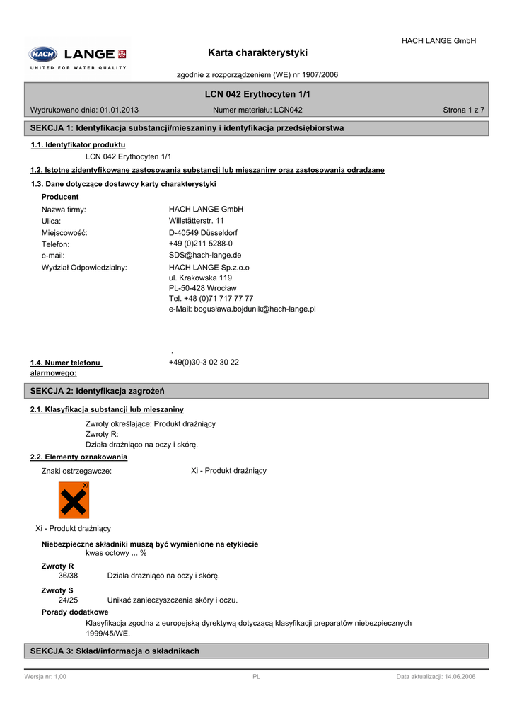 HACH LANGE GmbH Karta charakterystyki zgodnie z rozporządzeniem (WE) nr 1907/2006 LCN 042 Erythocyten 1/1 Wydrukowano dnia: 01.01.2013 Strona 1 z 7 Numer materiału: LCN042 SEKCJA 1: Identyfikacja substancji/mieszaniny i identyfikacja przedsiębiorstwa 1.1. Identyfikator produktu LCN 042 Erythocyten 1/1 1.2. Istotne zidentyfikowane zastosowania substancji lub mieszaniny oraz zastosowania odradzane 1.3. Dane dotyczące dostawcy karty charakterystyki Producent Nazwa firmy: Ulica: Miejscowość: Telefon: e-mail: HACH LANGE GmbH Willstätterstr. 11 Wydział Odpowiedzialny: HACH LANGE Sp.z.o.o ul. Krakowska 119 PL-50-428 Wrocław Tel. +48 (0)71 717 77 77 e-Mail: bogusł[email protected] D-40549 Düsseldorf +49 (0)211 5288-0 [email protected] , +49(0)30-3 02 30 22 1.4. Numer telefonu alarmowego: SEKCJA 2: Identyfikacja zagrożeń 2.1. Klasyfikacja substancji lub mieszaniny Zwroty określające: Produkt drażniący Zwroty R: Działa drażniąco na oczy i skórę. 2.2. Elementy oznakowania Znaki ostrzegawcze: Xi - Produkt drażniący Xi - Produkt drażniący Niebezpieczne składniki muszą być wymienione na etykiecie kwas octowy ... % Zwroty R 36/38 Działa drażniąco na oczy i skórę. Zwroty S 24/25 Unikać zanieczyszczenia skóry i oczu. Porady dodatkowe Klasyfikacja zgodna z europejską dyrektywą dotyczącą klasyfikacji preparatów niebezpiecznych 1999/45/WE. SEKCJA 3: Skład/informacja o składnikach Wersja nr: 1,00 PL Data aktualizacji: 14.06.2006 HACH LANGE GmbH Karta charakterystyki zgodnie z rozporządzeniem (WE) nr 1907/2006 LCN 042 Erythocyten 1/1 Wydrukowano dnia: 01.01.2013 Strona 2 z 7 Numer materiału: LCN042 3.2. Mieszaniny Składniki niebezpieczne Nr WE Nr CAS Nr Index Nr REACH Ilość Nazwa chemiczna Klasyfikacja Klasyfikacja GHS Woda >80 % 200-580-7 kwas octowy ... % <17 % 64-19-7 C - Produkt żrący R10-35 607-002-00-6 Flam. Liq. 3, Skin Corr. 1A; H226 H314 231-820-9 Siarczan sodowy 231-791-2 7732-18-5 <3 % 7757-82-6 Dosłowne brzmienie zwrotów R i H: patrz sekcja 16. SEKCJA 4: Środki pierwszej pomocy 4.1. Opis środków pierwszej pomocy Wskazówki ogólne Natychmiast zdjąć skażone ubranie. W przypadku wdychania Przenieść na świeże powietrze. W przypadku kontaktu ze skórą Natychmiast zmyć dużą ilością wody. Jeśli utrzymują się podrażnienia skóry, wezwać lekarza. W przypadku kontaktu z oczami Przemywać dokładnie dużą ilością wody przynajmniej przez 15 minut i skonsultować się z lekarzem. W przypadku połknięcia Przemyć usta wodą i następnie wypić dużą ilość wody. Zasięgnąć porady medycznej. 4.3. Wskazania dotyczące wszelkiej natychmiastowej pomocy lekarskiej i szczególnego postępowania z poszkodowanym Leczenie objawowe. SEKCJA 5: Postępowanie w przypadku pożaru 5.1. Środki gaśnicze Odpowiednie środki gaśnicze Użycie środków gaśniczych odpowiednich dla lokalnych warunków i dla środowiska. Produkt niepalny. 5.2. Szczególne zagrożenia związane z substancją lub mieszaniną W przypadku spalania, mozliwe wydzielanie niebezpiecznych gazów. 5.3. Informacje dla straży pożarnej W razie pożaru, założyć aparat oddechowy z zamkniętym obiegiem powietrza. Użyć środków ochrony osobistej. Informacja uzupełniająca Pozostałości po pożarze i zanieczyszczona woda gaśnicza muszą być usunięte zgodnie z lokalnymi przepisami. Wersja nr: 1,00 PL Data aktualizacji: 14.06.2006 HACH LANGE GmbH Karta charakterystyki zgodnie z rozporządzeniem (WE) nr 1907/2006 LCN 042 Erythocyten 1/1 Wydrukowano dnia: 01.01.2013 Strona 3 z 7 Numer materiału: LCN042 SEKCJA 6: Postępowanie w przypadku niezamierzonego uwolnienia do środowiska 6.1. Indywidualne środki ostrożności, wyposażenie ochronne i procedury w sytuacjach awaryjnych Użyć środków ochrony osobistej. 6.2. Środki ostrożności w zakresie ochrony środowiska Nie wylewać do wód powierzchniowych i kanalizacji. 6.3. Metody i materiały zapobiegające rozprzestrzenianiu się skażenia i służące do usuwania skażenia Wchłonąć w obojętny materiał sorpcyjny (np. piasek, żel krzemionkowy, pochłaniacz kwasów, pochłaniacz uniwersalny, trociny). SEKCJA 7: Postępowanie z substancjami i mieszaninami oraz ich magazynowanie 7.1. Środki ostrożności dotyczące bezpiecznego postępowania Wskazówki odnośnie bezpiecznego obchodzenia się z substancją Używaj tylko w miejscach dobrze wentylowanych. 7.2. Warunki bezpiecznego magazynowania, łącznie z informacjami dotyczącymi wszelkich wzajemnych niezgodności Wymagania względem pomieszczeń i pojemników magazynowych Przechowywać w suchym i chłodnym miejscu. SEKCJA 8: Kontrola narażenia/środki ochrony indywidualnej 8.1. Parametry dotyczące kontroli Parametry kontrolne Nr CAS Nazwa chemiczna mg/m³ 64-19-7 Kwas octowy wł./cm3 Kategorii 15 NDS (8 h) 30 NDSCh (15 min) 8.2. Kontrola narażenia Środki higieny Rodzaj wyposażenia ochronnego musi być dobrany odpowiednio do stężenia i ilości niebezpiecznej substancji w konkretnym środowisku pracy. Ochrona dróg oddechowych Aparat oddechowy tylko w przypadku tworzenia się aerozolu lub pyłu. Ochrona rąk Smarowac skóre kremem z filtrem ochronnym. Myc rece przed przerwami i po pracy. Chemicznie odporne rekawice ochronne Uzyte rekawice ochronne musza spelniac specyfikacje dyrektywy UE 89/686/EEC i/lub normy EN374. Ochronę oczu lub twarzy Okulary ochronne z osłonami bocznymi Ochrona skóry Zdjąć i uprać skażoną odzież przed ponownym użyciem. SEKCJA 9: Właściwości fizyczne i chemiczne 9.1. Informacje na temat podstawowych właściwości fizycznych i chemicznych Postać: Kolor: Wersja nr: 1,00 ciecz bezbarwny PL Data aktualizacji: 14.06.2006 HACH LANGE GmbH Karta charakterystyki zgodnie z rozporządzeniem (WE) nr 1907/2006 LCN 042 Erythocyten 1/1 Wydrukowano dnia: 01.01.2013 Strona 4 z 7 Numer materiału: LCN042 octowy Zapach: Metoda testu 1 pH (przy 20 °C): Zmiana stanu nie dotyczy nie dotyczy Granice wybuchowości - dolna: Granice wybuchowości - 