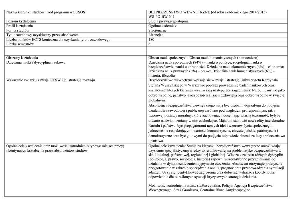 Nazwa kierunku studiów i kod programu wg USOS Poziom kształcenia Profil kształcenia Forma studiów Tytuł zawodowy uzyskiwany przez absolwenta Liczba punktów ECTS konieczna dla uzyskania tytułu zawodowego Liczba semestrów Obszar/y kształcenia Dziedzina nauki i dyscyplina naukowa Wskazanie zwiazku z misją UKSW i jej strategią rozwoju Ogólne cele kształcenia oraz możliwości zatrudnienia(typowe miejsca pracy) i kontynuacji kształcenia przez absolwentów studiów BEZPIECZEŃSTWO WEWNĘTRZNE (od roku akademickiego 2014/2015) WS-PO-BW-N-1 Studia pierwszego stopnia Ogólnoakademicki Stacjonarne Licencjat 180 6 Obszar nauk społecznych; Obszar nauk humanistycznych (pomocniczo) Dziedzina nauk społecznych (84%) – nauki o polityce, socjologia, nauki o bezpieczeństwie, nauki o obronności; Dziedzina nauk ekonomicznych (4%) – ekonomia; Dziedzina nauk prawnych (6%) – prawo; Dziedzina nauk humanistycznych (6%) – historia, filozofia Bezpieczeństwo wewnętrzne wpisuje się w misję i strategię Uniwersytetu Kardynała Stefana Wyszyńskiego w Warszawie poprzez prowadzenie badań naukowych oraz kształcenie, których kierunek wyznaczają następujące zagadnienia: Naród i państwo jako dobro wspólne, państwo jako sposób realizacji Człowieka oraz dobro wspólne w świecie globalnym. Absolwenci bezpieczeństwa wewnętrznego mają być osobami dojrzałymi do podjęcia działalności zawodowej i publicznej zarówno pod względem profesjonalnym, jak i wzorowej postawy moralnej, które zachowując i doceniając własną tożsamość, byłyby otwarte na świat i zmiany w nim zachodzące. Mają oni stanowić nowe elity intelektualne Narodu i państwa, być propagatorami nowych idei i wzorców życia społecznego, jednocześnie respektującymi wartości humanistyczne, chrześcijańskie, patriotyczne i demokratyczne oraz być gotowymi do podjęcia odpowiedzialności za losy społeczeństwa i państwa. Ogólne cele kształcenia: Studia na kierunku bezpieczeństwo wewnętrzne umożliwiają uzyskanie specjalistycznej wiedzy ukierunkowanej na problematykę bezpieczeństwa w skali lokalnej, państwowej, regionalnej i globalnej. Wiedza z zakresu różnych dyscyplin (politologia, prawo, socjologia, historia) zapewni wszechstronne przygotowanie do działania w dynamicznie zmieniającym się otoczeniu. Absolwent otrzymuje praktyczne przygotowanie w zakresie sporządzania analiz, prognoz oraz przeprowadzania symulacji zdarzeń. Uczy się identyfikować zagrożenia oraz dobierać, wdrażać i koordynować odpowiednie dla określonych sytuacji kryzysowych strategie działania. Możliwości zatrudnienia m.in.: służba cywilna, Policja, Agencja Bezpieczeństwa Wewnętrznego, Straż Graniczna, Centralne Biuro Antykorupcyjne Wymagania wstępne(oczekiwane kompetencje kandydata) – zwłaszcza w przypadku studiów drugiego stopnia Zasady rekrutacji Warunki realizacji programu studiów Na podstawie zasad określonych w uchwale Senatu Uniwersytetu Kardynała Stefana Wyszyńskiego w Warszawie Minimum kadrowe z przyporządkowaniem Zgodnie z oświadczeniami o przekazaniu uprawnień do prowadzenia kierunku poszczególnych osób do dyscyplin naukowych Proporcja liczby nauczycieli akademickich 1:69 stanowiących minimum kadrowe do liczby studiujących Opis działalności badawczej w odpowiednim Nie dotyczy obszarze wiedzy – w przypadku studiów prowadzących do uzyskania dyplomu magisterskiego 120 godz. (regulamin ogólnouczelniany, koordynacja na poziomie jednostki) Wymiar, zasady i forma odbywania praktyk Sumaryczne wskazniki (punkty ECTS) charakteryzujace program studiów Opis planu studiów Nazwa przedmiotu/modułu kształcenia Możliwości kontynuacji kształcenia przez absolwentów kierunku: Politologia – studia drugiego stopnia stacjonarne lub niestacjonarne - Liczba punktów ECTS jaką student musi uzyskać na zajęciach wymagających bezpośredniego udziału nauczycieli akademickich Liczba punktów ECTS jaką student musi uzyskać w ramach zajeć z zakresu nauk podstawowych W tym liczba punktów ECTS za zajęcia do wyboru przez studenta Liczba punktów ECTS jaką student musi uzyskać w ramach zajeć o charakterze praktycznym, w tym zajeć laboratoryjnych i projektowych Liczba punktów ECTS jaką student musi uzyskać realizując moduły kształcenia oferowane w formie zajeć ogólnouczelnianych lub na innym kierunku studiów Symbol efektu kształcenia (należy wymienić wszystkie EK, jakie student uzyska po zaliczeniu przedmiotu) Nr Liczba semestru ECTS Nauka o prawie (P) BWL_W07, BWL_U07, BWL_K01 I Nauka o państwie i polityce (P) BWL_W03, BWL_W05, BWL_U01, BWL_U06 I BWL_W02, BWL_W10, BWL_U05, BWL_U06 I BWL_W01, BWL_W03, BWL_U01 BWL_W01, BWL_W03, BWL_U04 I I Bezpieczeństwo państwa (P) Psychologia społeczna (P) Współczesne konflikty społeczne (P) 2 Liczba godzin Forma zajeć Forma zaliczenia Sposób sprawdzenia efektów kształcenia Por. karta przedmiotu 180 144,5 56 77 12 Obowiązkowy 30 KW ZO 30 W E jw. 3 3 30 Ć Z jw. 30 W E jw. + 3 2 2 30 Ć 30 W 30 KW Z ZO ZO jw. jw. jw. + + 3 + + Do wyboru I I 1,5 2 30 Ć 30 W ZO ZO jw. jw. + + I 3 30 W E jw. + I 1,5 15 Ć ZO* jw. + I 2,5 30 W E jw. + I 1,5 30 30 Ć 360 ZO jw. II 3 30 W E jw. + II II 2 2 15 Ć 30 W ZO ZO jw. jw. + + II 1,5 15 KW ZO jw. + BWL_W03, BWL_W04, BWL_W10 II 3 30 W E jw. + Najnowsza historia polityczna Polski (P) BWL_W03, BWL_U01 II Komunikowanie społeczne (P) Geopolityka (P) Statystyka (P) BWL_W08, BWL_U09, BWL_K07 BWL_W03, BWL_W06, BWL_U01 BWL_W01, BWL_U01 II II II 3 2 2 3 2 30 15 30 30 15 E Z ZO ZO ZO jw. jw. jw. jw. jw. Zajęcia ogólnouczelniane lub na innym kierunku studiów II 3 Zajęcia do wyboru 1 z 2 Lektorat języka obcego (P) II II III III 2 1,5 30 3 3 III 3 III III Technologie informacyjne Historia najnowsza (P) Wprowadzenie do ekonomii (P) Zasady kompozycji prac naukowych (P) Patologie społeczne w polityce wewnętrznej państwa (P) Lektorat języka obcego (P) Wprowadzenie do socjologii (P) Logika (P) Bezpieczeń