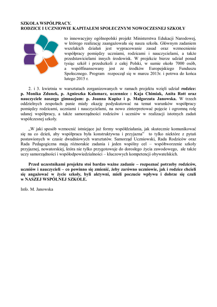 SZKOŁA WSPÓŁPRACY. RODZICE I UCZNIOWIE KAPITAŁEM SPOŁECZNYM NOWOCZESNEJ SZKOŁY to innowacyjny ogólnopolski projekt Ministerstwa Edukacji Narodowej, w którego realizację zaangażowała się nasza szkoła. Głównym zadaniem wszelakich działań jest wypracowanie zasad oraz wzmocnienie współpracy pomiędzy uczniami, rodzicami i nauczycielami, a także przedstawicielami innych środowisk. W projekcie bierze udział ponad tysiąc szkół i przedszkoli z całej Polski, w sumie około 7000 osób, a współfinansowany jest ze środków Europejskiego Funduszu Społecznego. Program rozpoczął się w marcu 2013r. i potrwa do końca lutego 2015 r. 2. i 3. kwietnia w warsztatach zorganizowanych w ramach projektu wzięli udział rodzice: p. Monika Zdunek, p. Agnieszka Kalamarz, uczennice : Kaja Chimiak, Anita Rott oraz nauczyciele naszego gimnazjum: p. Joanna Kupisz i p. Małgorzata Janowska. W trzech oddzielnych zespołach panie miały okazję podyskutować na temat warunków współpracy pomiędzy rodzicami, uczniami i nauczycielami, na nowo zinterpretować pojęcie i ogromną rolę udanej współpracy, a także samorządności rodziców i uczniów w realizacji istotnych zadań współczesnej szkoły. „W jaki sposób wzmocnić istniejące już formy współdziałania, jak skutecznie komunikować się na co dzień, aby współpraca była konstruktywna i przyjazna” to tylko niektóre z pytań postawionych w czasie dwudniowych warsztatów. Samorząd Uczniowski, Rada Rodziców oraz Rada Pedagogiczna mają różnorakie zadania i jeden wspólny cel – współtworzenie szkoły przyjaznej, nowatorskiej, która nie tylko przygotowuje do dorosłego życia zawodowego, ale także uczy samorządności i współodpowiedzialności – kluczowych kompetencji obywatelskich. Przed uczestnikami projektu stoi bardzo ważne zadanie – rozpoznać potrzeby rodziców, uczniów i nauczycieli – co powinno się zmienić, żeby zarówno uczniowie, jak i rodzice chcieli się angażować w życie szkoły, byli aktywni, mieli poczucie wpływu i dobrze się czuli w NASZEJ WSPÓLNEJ SZKOLE. Info. M. Janowska