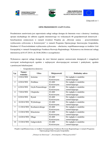 Załącznik nr 1 OPIS PRZEDMIOTU ZAPYTANIA Przedmiotem zamówienia jest zapewnienie usługi stałego dostępu do Internetu wraz z dostawą i instalacją sprzętu niezbędnego do odbioru sygnału internetowego we wskazanych 40 gospodarstwach domowych beneficjentom ostatecznym w ramach trwałości Projektu pn. „Równ@ szansa – przeciwdziałanie wykluczeniu cyfrowemu w Kościerzynie” w ramach Programu Operacyjnego Innowacyjna Gospodarka, Działanie 8.3 Przeciwdziałanie wykluczeniu cyfrowemu – eInclusion, współfinansowanego ze środków Unii Europejskiej w ramach Europejskiego Funduszu Rozwoju Regionalnego. Wykonawca ma dostarczać usługę internetową od 01.07.2015r. do 30.06.2020r.w szczególności: Wykonawca zapewni usługę dostępu do sieci Internet poprzez zastosowanie dostępnych i osiągalnych rozwiązań technologicznych zgodnie z najlepszymi obowiązującymi normami i praktykami, zgodnie z poniższymi lokalizacjami: Gospodarstwa domowe: 1 Numer wniosku 2/2014/WR Jeziorna 2 4/2014/WR Źródlana 3 6/2014/WR Gryfa Pomorskiego 4 7/2014/WR Chojnicka 5 8/2014/WR Rynek 6 10/2014/WR Wybickiego 7 11/2014/WR Kochanowskiego 8 13/2014/WR Klasztorna 9 14/2014/WR Długa 10 15/2014/WR Gulgowskich Lp. Ulica Miejscowość 83-400 Kościerzyna 83-400 Kościerzyna 83-400 Kościerzyna 83-400 Kościerzyna 83-400 Kościerzyna 83-400 Kościerzyna 83-400 Kościerzyna 83-400 Kościerzyna 83-400 Kościerzyna 83-400 Kościerzyna Dokładny adres Do wglądu w siedzibie zamawiającego Do wglądu w siedzibie zamawiającego Do wglądu w siedzibie zamawiającego Do wglądu w siedzibie zamawiającego Do wglądu w siedzibie zamawiającego Do wglądu w siedzibie zamawiającego Do wglądu w siedzibie zamawiającego Do wglądu w siedzibie zamawiającego Do wglądu w siedzibie zamawiającego Do wglądu w siedzibie zamawiającego Projekt współfinansowany ze środków Europejskiego Funduszu Rozwoju Regionalnego w ramach Programu Operacyjnego Innowacyjna Gospodarka „Dotacje na Innowacje” „Inwestujemy w Waszą przyszłość” 11 17/2014/WR Matejki 12 18/2014/WR 8 Marca 13 19/2014/WR Księżycowa 14 21/2014/WR Tysiąclecia 15 22/2014/WR Gdańska 16 24/2014/WR Wodna 17 25/2014/WR Mała Dworcowa 18 26/2014/WR Skłodowskiej 19 27/2014/WR Osiedle za lasem 20 28/2014/WR Klasztorna 21 30/2014/WR Chojnicka 22 31/2014/WR Chojnicka 23 32/2014/WR Chojnicka 24 33/2014/WR Piechowskiego 25 34/2014/WR Towarowa 26 35/2014/WR Gdańska 27 37/2014/WR Staszica 28 39/2014/WR Zofii Nałkowskiej 29 41/2014/WR Towarowa 30 44/2014/WR K.Dunikowskiego 31 46/2014/WR Rynek 83-400 Kościerzyna 83-400 Kościerzyna 83-400 Kościerzyna 83-400 Kościerzyna 83-400 Kościerzyna 83-400 Kościerzyna 83-400 Kościerzyna 83-400 Kościerzyna 83-400 Kościerzyna 83-400 Kościerzyna 83-400 Kościerzyna 83-400 Kościerzyna 83-400 Kościerzyna 83-400 Kościerzyna 83-400 Kościerzyna 83-400 Kościerzyna 83-400 Kościerzyna 83-400 Kościerzyna 83-400 Kościerzyna 83-400 Kościerzyna 83-400 Kościerzyna Do wglądu w siedzibie zamawiającego Do wglądu w siedzibie zamawiającego Do wglądu w siedzibie zamawiającego Do wglądu w siedzibie zamawiającego Do wglądu w siedzibie zamawiającego Do wglądu w siedzibie zamawiającego Do wglądu w siedzibie zamawiającego Do wglądu w siedzibie zamawiającego Do wglądu w siedzibie zamawiającego Do wglądu w siedzibie zamawiającego Do wglądu w siedzibie zamawiającego Do wglądu w siedzibie zamawiającego Do wglądu w siedzibie zamawiającego Do wglądu w siedzibie zamawiającego Do wglądu w siedzibie zamawiającego Do wglądu w siedzibie zamawiającego Do wglądu w siedzibie zamawiającego Do wglądu w siedzibie zamawiającego Do wglądu w siedzibie zamawiającego Do wglądu w siedzibie zamawiającego Do wglądu w siedzibie zamawiającego Projekt współfinansowany ze środków Europejskiego Funduszu Rozwoju Regionalnego w ramach Programu Operacyjnego Innowacyjna Gospodarka „Dotacje na Innowacje” „Inwestujemy w Waszą przyszłość” 32 47/2014/WR Księżycowa 33 49/2014/WR Kartuska 34 51/2014/WR M.C.Skłodowskiej 35 54/2014/WR M.C.Skłodowskiej 36 56/2014/WR Wyspiańskiego 37 61/2014/WR Mała Dworcowa 38 62/2014/WR Osiedle za lasem 39 64/2014/WR Jeziorna 40 66/2014/WR Stolarska 83-400 Kościerzyna 83-400 Kościerzyna 83-400 Kościerzyna 83-400 Kościerzyna 83-400 Kościerzyna 83-400 Kościerzyna 83-400 Kościerzyna 83-400 Kościerzyna 83-400 Kościerzyna Do wglądu w siedzibie zamawiającego Do wglądu w siedzibie zamawiającego Do wglądu w siedzibie zamawiającego Do wglądu w siedzibie zamawiającego Do wglądu w siedzibie zamawiającego Do wglądu w siedzibie zamawiającego Do wglądu w siedzibie zamawiającego Do wglądu w siedzibie zamawiającego Do wglądu w siedzibie zamawiającego Stały dostęp do sieci Internet (24 godziny na dobę, 7 dni w tygodniu). Transfer dla 40 gospodarstw domowych: do komputera (down) minimum – 4 Mb/s od komputera (up) minimum –0,5 Mb/s. Nielimitowany transfer danych (pobierania i wysyłania). Dostępność usługi na poziomie 99%. Dostęp do Internetu z punktu widzenia Zamawiającego musi działać bezobsługowo, co oznacza, że po odłączeniu zasilania i ponownym jego odłączeniu musi być gotowy do pracy i umożliwić realizację usługi korzystania z Internetu. Wykonawca po dokonaniu instalacji i aktywacji dostępu do sieci szerokopasmowego Internetu zobowiązany jest przeprowadzić test przepustowości, który potwierdzi spełnienie parametrów określonych przez Zamawiającego. Wydruk z testu stanowić będzie załącznik do protokołu potwierdzającego uruchomienie dostępu do Internetu. Wykonawca dostarczy, podłączy i skonfiguruje urządzenia niezbędne do świadczenia usługi dostępu do szerokopasmowego Internetu u Beneficjentów Ostatecznych projektu – gospodarstw domowych. Wykonawca przygotuje dla Zamawiającego Indywidualne Protokoły Odbioru uruchomienia usługi dostępu do Internetu w danej lokalizacji. Projekt współfinansowany ze śro