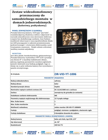 Zestaw wideodomofonowy przeznaczony do samodzielnego montażu w domach jednorodzinnych. (kolorowy, podtynkowy) PANEL ZEWNĘTRZNY Z KAMERĄ: Posiada kolorową kamerę CCD typu "pin-hole", wandaloodporną obudowę z żeliwa i odporność na warunki atmosferyczne oraz sterowanie elektrozaczepem bez dodatkowego zasilania. Inne funkcje: możliwość obserwacji w nocy (podświetlenie diodami LED pracującymi w zakresie promieniowania podczerwonego) i otwieranie elektrozamka z podtrzymaniem czasowym . Dzięki osłonie ochronnej możliwy montaż natynkowy. MONITOR: Jest ultra płaski, bezsłuchawkowy, głośnomówiący. Posiada kolorowy wyświetlacz TFT-LCD o przekątnej ekranu 8" o wysokiej rozdzielczości obrazu , płynną regulację parametrów monitora (głośność, jasność, kontrast) oraz funkcję podglądu tego co dzieje się w polu widzenia kamery bez wywołania z panela zewnętrznego. OR-VID-YT-1006 Nr Artykułu PARAMETRY URZĄDZENIA Rodzaj wideodomofonu cyfrowy Rodzaj obrazu kolor Standard przesyłu obrazu Duplex Nominalne napięcie zasilania zestawu [V] DC 13,5V/1000 mA z zasilacza Zasilacz zewnętrzny do gniazdka (w zestawie) Dodatkowe zasilanie elektrozamka NIE Parametry napięcia wyjściowego dla elektrozaczepu 12 V prądu stałego Max. liczba kamer 1 Max. liczba monitorów 2 Możliwość rozbudowy wideo monitor OR-VID-YT-1006MV Funkcje podgląd, rozmowa z podglądem, otwieranie rygla Funkcje dodatkowe 8 dzwięków dzwonka do wyboru PARAMETRY PANELU ZEWNĘTRZNEGO z KAMERĄ Rodzaj kamery kolor, pin-hole, typ CCD, 1/3" Kąt obserwacji ok. 92° Rozdzielczość 420 linii TV Czułość 0,1 lux Sposób oświetlenia nocnego 6 diod LED (podczerwień) Sposób montażu podtynkowy lub natynkowy Stopień ochrony IP44 Warunki pracy w zakresie temperatur od-25°C do +55°C Waga ok. 0,37 kg Wymiary zewnętrzne modułu(szer. x wys. x głęb.) 70 x 160 x 27mm Wymiary do montażu podtynkowego(szer. x wys. x głęb.) 44 x 124 x 27 mm PARAMETRY MODUŁU WEWNĘTRZNEGO - MONITORA Rodzaj monitora TFT-LCD, kolor, bezsłuchawkowy, głośnomówiący, 8" Rozdzielczość 480 x 234 Wewnętrzna pamięć obrazów brak Sygnał gongu generowany elektronicznie z możliwością regulacji poziomu głośności i wyborem 8 dźwięków dzwonka Zakres temperatur pracy Od -10°C do +45°C Waga ok. 1,03 kg Wymiary zewnętrzne modułu(szer. x wys. x głęb.) 210 x 250 x 35mm RODZAJ PRZEWODU ŁĄCZĄCEGO ELEMENTY ZESTAWU (element wyposażenia dodatkowego) Przewód łączący kamerę z monitorem - rodzaj zależny od do 50 m przewód czterożyłowy o przekroju 0.75 mm² warunków eksploatacji (ziemny czy napowietrzny) Przewód łączący kamerę z elektrozaczepem Schemat podłączenia: dwużyłowy o przekroju 1 mm²
