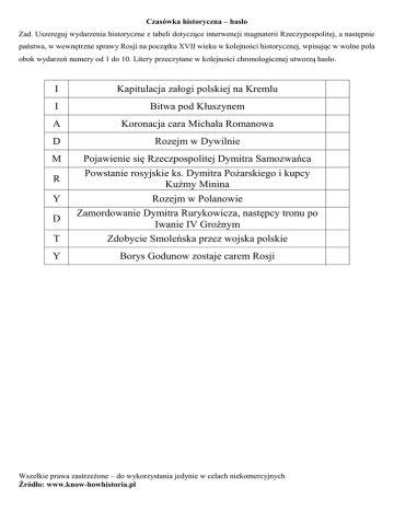Czasówka historyczna – hasło Zad. Uszereguj wydarzenia historyczne z tabeli dotyczące interwencji magnaterii Rzeczypospolitej, a następnie państwa, w wewnętrzne sprawy Rosji na początku XVII wieku w kolejności historycznej, wpisując w wolne pola obok wydarzeń numery od 1 do 10. Litery przeczytane w kolejności chronologicznej utworzą hasło. I Kapitulacja załogi polskiej na Kremlu I Bitwa pod Kłuszynem A Koronacja cara Michała Romanowa D Rozejm w Dywilnie M T Pojawienie się Rzeczpospolitej Dymitra Samozwańca Powstanie rosyjskie ks. Dymitra Pożarskiego i kupcy Kuźmy Minina Rozejm w Polanowie Zamordowanie Dymitra Rurykowicza, następcy tronu po Iwanie IV Groźnym Zdobycie Smoleńska przez wojska polskie Y Borys Godunow zostaje carem Rosji R Y D Wszelkie prawa zastrzeżone – do wykorzystania jedynie w celach niekomercyjnych Źródło: www.know-howhistoria.pl