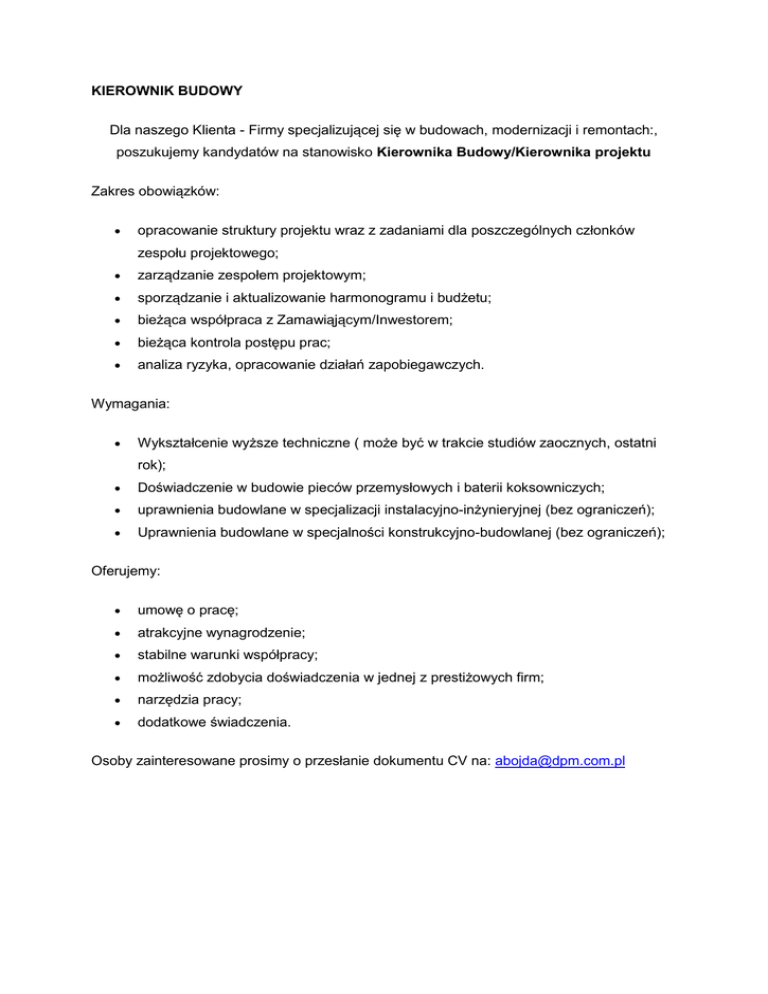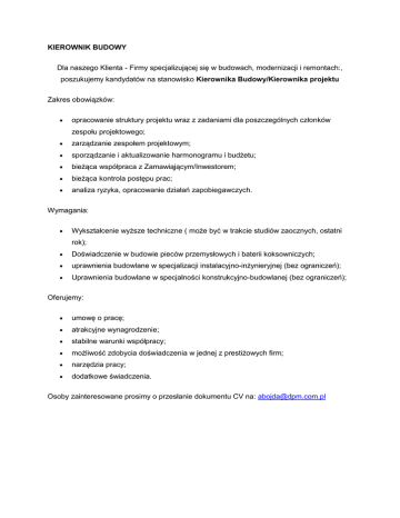 KIEROWNIK BUDOWY Dla naszego Klienta - Firmy specjalizującej się w budowach, modernizacji i remontach:, poszukujemy kandydatów na stanowisko Kierownika Budowy/Kierownika projektu Zakres obowiązków: opracowanie struktury projektu wraz z zadaniami dla poszczególnych członków zespołu projektowego; zarządzanie zespołem projektowym; sporządzanie i aktualizowanie harmonogramu i budżetu; bieżąca współpraca z Zamawiąjącym/Inwestorem; bieżąca kontrola postępu prac; analiza ryzyka, opracowanie działań zapobiegawczych. Wymagania: Wykształcenie wyższe techniczne ( może być w trakcie studiów zaocznych, ostatni rok); Doświadczenie w budowie pieców przemysłowych i baterii koksowniczych; uprawnienia budowlane w specjalizacji instalacyjno-inżynieryjnej (bez ograniczeń); Uprawnienia budowlane w specjalności konstrukcyjno-budowlanej (bez ograniczeń); Oferujemy: umowę o pracę; atrakcyjne wynagrodzenie; stabilne warunki współpracy; możliwość zdobycia doświadczenia w jednej z prestiżowych firm; narzędzia pracy; dodatkowe świadczenia. Osoby zainteresowane prosimy o przesłanie dokumentu CV na: [email protected]