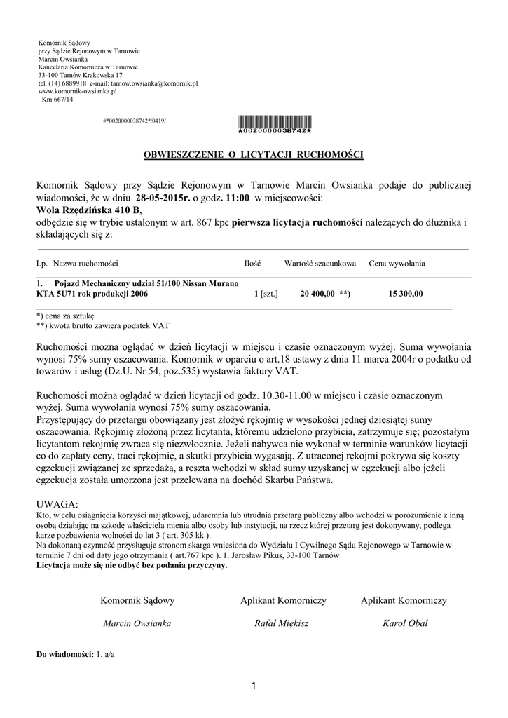 Komornik Sądowy przy Sądzie Rejonowym w Tarnowie Marcin Owsianka Kancelaria Komornicza w Tarnowie 33-100 Tarnów Krakowska 17 tel. (14) 6889918 e-mail: [email protected] www.komornik-owsianka.pl Km 667/14 #*0020000038742*/0419/ *0020000038742* OBWIESZCZENIE O LICYTACJI RUCHOMOŚCI Komornik Sądowy przy Sądzie Rejonowym w Tarnowie Marcin Owsianka podaje do publicznej wiadomości, że w dniu 28-05-2015r. o godz. 11:00 w miejscowości: Wola Rzędzińska 410 B, odbędzie się w trybie ustalonym w art. 867 kpc pierwsza licytacja ruchomości należących do dłużnika i składających się z: ____________________________________________________________________________________________________ Lp. Nazwa ruchomości Ilość Wartość szacunkowa Cena wywołania _____________________________________________________________________________________________________ 1. Pojazd Mechaniczny udział 51/100 Nissan Murano KTA 5U71 rok produkcji 2006 1 [szt.] 20 400,00 **) 15 300,00 _______________________________________________________________________________________________________________________ *) cena za sztukę **) kwota brutto zawiera podatek VAT Ruchomości można oglądać w dzień licytacji w miejscu i czasie oznaczonym wyżej. Suma wywołania wynosi 75% sumy oszacowania. Komornik w oparciu o art.18 ustawy z dnia 11 marca 2004r o podatku od towarów i usług (Dz.U. Nr 54, poz.535) wystawia faktury VAT. Ruchomości można oglądać w dzień licytacji od godz. 10.30-11.00 w miejscu i czasie oznaczonym wyżej. Suma wywołania wynosi 75% sumy oszacowania. Przystępujący do przetargu obowiązany jest złożyć rękojmię w wysokości jednej dziesiątej sumy oszacowania. Rękojmię złożoną przez licytanta, któremu udzielono przybicia, zatrzymuje się; pozostałym licytantom rękojmię zwraca się niezwłocznie. Jeżeli nabywca nie wykonał w terminie warunków licytacji co do zapłaty ceny, traci rękojmię, a skutki przybicia wygasają. Z utraconej rękojmi pokrywa się koszty egzekucji związanej ze sprzedażą, a reszta wchodzi w skład sumy uzyskanej w egzekucji albo jeżeli egzekucja została umorzona jest przelewana na dochód Skarbu Państwa. UWAGA: Kto, w celu osiągnięcia korzyści majątkowej, udaremnia lub utrudnia przetarg publiczny albo wchodzi w porozumienie z inną osobą działając na szkodę właściciela mienia albo osoby lub instytucji, na rzecz której przetarg jest dokonywany, podlega karze pozbawienia wolności do lat 3 ( art. 305 kk ). Na dokonaną czynność przysługuje stronom skarga wniesiona do Wydziału I Cywilnego Sądu Rejonowego w Tarnowie w terminie 7 dni od daty jego otrzymania ( art.767 kpc ). 1. Jarosław Pikus, 33-100 Tarnów Licytacja może się nie odbyć bez podania przyczyny. Komornik Sądowy Aplikant Komorniczy Aplikant Komorniczy Marcin Owsianka Rafał Miękisz Karol Obal Do wiadomości: 1. a/a 1