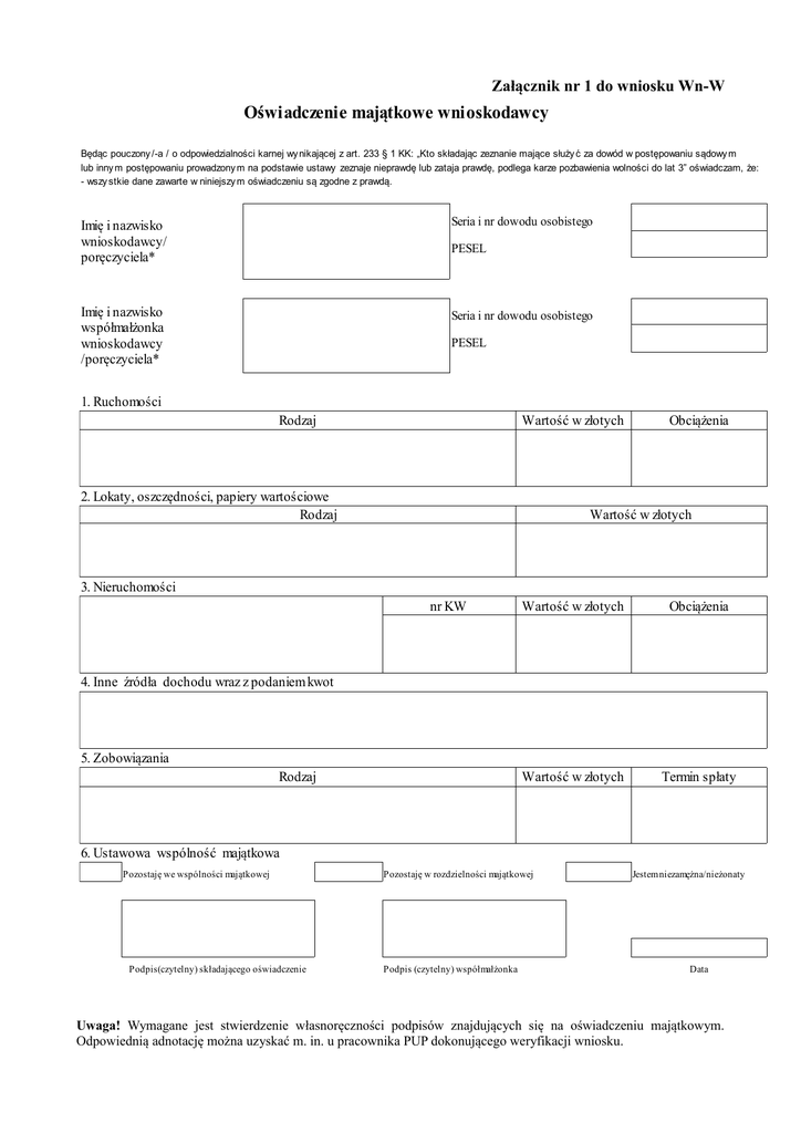 Załącznik nr 1 do wniosku Wn-W Oświadczenie majątkowe wnioskodawcy Będąc pouczony /-a / o odpowiedzialności karnej wy nikającej z art. 233 § 1 KK: „Kto składając zeznanie mające służy ć za dowód w postępowaniu sądowy m lub inny m postępowaniu prowadzony m na podstawie ustawy zeznaje nieprawdę lub zataja prawdę, podlega karze pozbawienia wolności do lat 3” oświadczam, że: - wszy stkie dane zawarte w niniejszy m oświadczeniu są zgodne z prawdą. Imię i nazwisko wnioskodawcy/ poręczyciela* Seria i nr dowodu osobistego Imię i nazwisko współmałżonka wnioskodawcy /poręczyciela* Seria i nr dowodu osobistego PESEL PESEL 1. Ruchomości Rodzaj Wartość w złotych 2. Lokaty, oszczędności, papiery wartościowe Rodzaj Obciążenia Wartość w złotych 3. Nieruchomości nr KW Wartość w złotych Obciążenia Wartość w złotych Termin spłaty 4. Inne źródła dochodu wraz z podaniem kwot 5. Zobowiązania Rodzaj 6. Ustawowa wspólność majątkowa Pozostaję we wspólności majątkowej Podpis(czytelny) składającego oświadczenie Pozostaję w rozdzielności majątkowej Podpis (czytelny) współmałżonka Jestem niezamężna/nieżonaty Data Uwaga! Wymagane jest stwierdzenie własnoręczności podpisów znajdujących się na oświadczeniu majątkowym. Odpowiednią adnotację można uzyskać m. in. u pracownika PUP dokonującego weryfikacji wniosku. Załącznik nr 2 do wniosku Wn-W ............................................. ............................................. ............................................. nazwisko, imię, adres Oświadczenie współmałżonka wnioskodawcy Ja niżej podpisany/a legitymujący/a się dowodem osobistym seria .................... numer ......................................... wydanym w dniu ................................... przez ….................................................................................................. PESEL ................................................. świadomy/a odpowiedzialności karnej wynikającej z art. 233 § 1 kodeksu karnego oświadczam, że wyrażam zgodę na pobranie przez mojego współmałżonka środków PFRON na wyposażenie stanowiska pracy osoby niepełnosprawnej w kwocie …....................................zł (kwota słownie: …..................................................................................). Oświadczam, że: 1. Jestem / nie jestem* zadłużony/a w bankach ani w innych instytucjach finansowych. Posiadane zadłużenie (proszę podać gdzie, na jaką kwotę, jaki jest termin spłaty pożyczki lub kredytu): .............................................................................................................................. .................................................................................................................................................... .................................................................................................................................................... .................................................................................................................................................... ........................................ 2. Posiadam / nie posiadam* zaległości w Zakładzie Ubezpieczeń Społecznych i w Urzędzie Skarbowym. Data .................................. ............................................................................. /czytelny podpis współmałżonka Wnioskodawcy/ * niepotrzebne skreślić Uwaga! Wymagane jest stwierdzenie własnoręczności podpisu znajdującego się na niniejszym oświadczeniu. Odpowiednią adnotację można uzyskać m. in. u pracownika PUP dokonującego weryfikacji wniosku. Załącznik nr 3 do wniosku Wn-W nazwisko, imię, adres OŚWIADCZENIE O POMOCY DE MINIMIS otrzymanej w okresie 3 kolejnych lat budżetowych1 przed złożeniem wniosku oraz pomocy państwa dotyczącej tych samych kosztów kwalifikowalnych w ramach zasady de minimis w rozumieniu rozporządzenia Komisji (UE) nr 1407/2013 z dnia 18 grudnia 2013 r. w sprawie stosowania art. 107 i 108 Traktatu o funkcjonowaniu Unii Europejskiej do pomocy de minimis (Dz. Urz. UE L 352 z 24.12.2013, str. 1); tzn. jeżeli łączna wartość otrzymanej pomocy publicznej w ciągu ostatnich 3 lat budżetowych przed złożeniem wniosku nie przekroczyła 200 000 EUR, a w sektorze transportu drogowego 100 000 EUR. Oświadczam, że otrzymałem(-am ) / nie otrzymałem(-am ) 2 w okresie 3 od 01.01.20.......... r. do ………………....…..r. następującą pomoc publiczną : L.p. Organ udzielający pomocy Podstawa prawna otrzymanej pomocy Dzień udzielenia Forma pomocy pomocy Wartość pomocy w złotych 1. 2. 3. 4. RAZEM Data .............................................. 1 2 3 ............................................................ /Podpis/ Należy brać pod uwagę bieżący rok budżetowy oraz dwa poprzedzające go lata budżetowe. Niepotrzebne skreślić. W przypadku otrzymania pomocy publicznej należy dołączyć wszystkie zaświadczenia o uzyskaniu pomocy de minimis. Załącznik nr 4 do wniosku Wn-W Formularz informacji przedstawianych przy ubieganiu się o pomoc de minimis A. Informacje dotyczące wnioskodawcy 1. Imię i nazwisko albo nazwa ................................................................................................................................................................ ................................................................................................................................................................ 2. Adres miejsca zamieszkania albo adres siedziby ................................................................................................................................................................ ................................................................................................................................................................ 3. Identyfikator gminy, w której wnioskod
