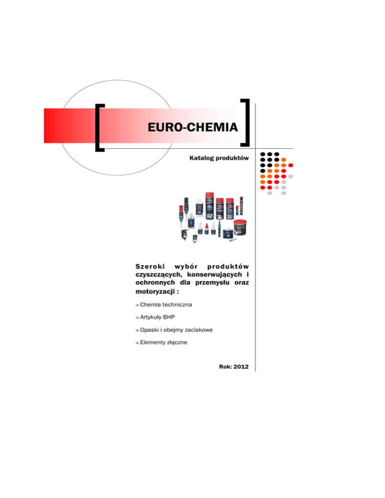 EURO-CHEMIA Katalog produktów Szeroki wybór produktów czyszczących, konserwujących i ochronnych dla przemysłu oraz motoryzacji : • Chemia techniczna • Artykuły BHP • Opaski i obejmy zaciskowe • Elementy złączne Rok: 2012 www.euro-chemia.pl Str. 2 www.euro-chemia.pl Spis treści Strona Wstęp 4 Środki zabezpieczające , smary 6 Środki czyszczące i pielęgnujące 14 Kleje i uszczelniacze 15 Szczeliwa beztlenowe i cyjanoakrylany 17 Artykuły BHP 18 Opaski i obejmy zaciskowe 22 Elementy złączne 22 Str. 3 www.euro-chemia.pl Firma EURO-CHEMIA zajmuje sie sprzedażą niemieckiej chemii technicznej EURO-LOCK , narzędzi, elektronarzędzi ( GEDORE, KS TOOLS itp.) oraz artykułów BHP. Od 2011 r. oferujemy chemię budowlaną szwajcarskiej firmy SIKA . Produkty EURO-LOCK zabezpieczają przed korozją i zapewniają pewne połączenia odporne na wibracje i uderzenia. Produkty EURO-LOCK są stale testowane i ulepszane przez co do Państwa rąk trafiają produkty o najwyższej jakości. Nasze produkty mają różnorodne zastosowania, przez co różnią się: twardością, czasem schnięcia, giętkością i odpornością na temperatury. Zastosowanie produktów EURO-LOCK: - budowa maszyn - produkcja narzędzi - produkcja pomp i silników - produkcja skrzyń biegów - hydraulika i pneumatyka - produkcja maszyn taśmowych - produkcja samochodów - budowa samolotów, statków - w elektryce i elektronice - w maszynach precyzyjnych - a także w codziennych naprawach domowych Str. 4 www.euro-chemia.pl Akcja klimatyzacja Pojemność 400ml Spray do czyszczenia klimatyzacji Właściwości: specjalny bakterio i grzybobójczy zmywacz do układów wlotów powietrza klimatyzacji w pojazdach i budynkach w postaci piany. Usuwa nieprzyjemny zapach od powstających podczas pracy urządzeń klimatyzacyjnych, osadów bakterii i grzybów. Zapobiega na dłuższy czas ich ponownemu wystąpieniu. Str. 5 www.euro-chemia.pl Zmywacz do hamulców 500ml , 600ml - usuwa ścier okładzin, smary, oleje, płyn hamulcowy itp. - do czyszczenia metali, szkła, ceramiki itp. Przed klejeniem i uszczelnianiem - zapobiega wzbijaniu szkodliwych dla zdrowia pyłów ścieru - zastosowanie: zwilżać daną część aż do zmycia zanieczyszczeń lub wytrzeć czystą ściereczką - uwaga: w przypadku gumy i tworzyw sztucznych należy w zasłoniętym normalnie miejscu przeprowadzić próbę ich odporności na środek. Istnieje możliwość uszkodzenia lakieru LOS 1000 LOS 1000BA (bez acetonu) Smar do łożysk w sprayu 400ml - wysokiej jakości smar ochronny do łożysk - zapewnia doskonałe smarowanie i długotrwałą żywotność wszelkiego rodzaju łożysk - zapobiega zapiekaniu, zgrzytom i zatarciu, chroni przed korozją - odporność termiczna: od -30C do +200C LOS 103 Smar do łańcuchów 400ml - specjalny smar do mocno obciążonych łańcuchów i szybko pracujących części maszyn - posiada doskonałą przyczepność - zapewnia elastyczny film ochronny przed wodą i brudem - odporność termiczna: -30C do +200C LOS 105 Odrdzewiacz 400ml - rozpuszcza silnie przerdzewiałe i trwale osadzone połączenia - posiada doskonałe działanie penetrujące i dobre właściwości smarne - zatrzymuje rdze, uniemożliwia korozje i chroni wszystkie metale - pomaga w demontażu śrub o zapieczonych połączeniach gwintów, luzuje zatarcia, chroni przed korozją cięgna, zamki drzwi itp. - nie zawiera silikonu LOS 120 Str. 6 www.euro-chemia.pl Odrdzewiacz z MoS2 400ml - wysoka ochrona przed korozją i dobrze wypiera wilgoć - błyskawicznie rozpuszcza rdzę - trwale chroni przed korozją - pomaga w demontażu śrub o zapieczonych połączeniach gwintów, luzuje zatarcia, chroni przed korozją cięgna, zamki drzwi itp. LOS 121 Odrdzewiacz zamrażający Rostschock 400ml - dzięki właściwością zamrażającym bardzo szybko odrdzewia mocno skorodowane połączenia śrubowe każdego rodzaju - posiada doskonałe właściwości penetrujące - nie zawiera olejów mineralnych, silikonu, smarów - po zastosowaniu nie pozostawia żadnych skutków ubocznych LOS 123 Wykrywacz nieszczelności 400ml - aktywny fluid przeciwko korozji do szybkiego i niezawodnego sprawdzenia nieszczelności miejsc - dopuszczony przez DVGW - niepylący - nietrujący - stosowany do kontroli układów hamulcowych zaworów, kompresorów, instalacji gazowych, zbiorników ciśnieniowych itp. - nadaje się do użytku w przemyśle spożywczym LOS 130 Silikon spray 400ml - smar beztłuszczowy, antystatyczny - środek ochronno-konserwujący o własnościach izolacyjnych i impregnujących - używany do wszystkich rodzajów tworzyw sztucznych, gumy, metalu i wyrobów tekstylnych - zapobiega i usuwa hałasy powstające podczas tarcia, nadaje powierzchniom, świeży i jedwabisty połysk - uelastycznia elementy gumowe i nadaje się do zabezpieczenia uszczelek gumowy w drzwiach samochodowych przed zamarzaniem LOS 170 Str. 7 www.euro-chemia.pl Zmywacz do mas uszczelniających i resztek klejów 400ml - rozpuszcza szybko i gruntownie resztki materiałów uszczelniających, lakierów, klei, żywic, środków smarnych itp. - można go stosować na powierzchnia metalowych, drewnie, ceramice, szkle polietylenie i polipropylenie - bardzo szybki i wydajny LOS 185 Smar teflonowy PTFE 400ml - wolny od tłuszczu, silnie przylegający środek do użycia przy maszynach przesuwnych, prowadnicach, zawiasach, przenośnikach taśmowych itd. - ma zastosowanie tam gdzie silikon i inne środki smarne nie mogą być użyte - odporność termiczna: od -50C do +260C (krótkotrwale) LOS 210 Spray spawalniczy 400ml - nie zawiera silikonu - bezbarwny - chroni dyszę i elementy spawane przed odpryskami, działa antykorozyjnie - nie wpływa na późniejsze procesy obróbki jak: lakierowanie, galwanizowanie czy chromowanie - stosowany do spawania metali i stali wysokostopowych LOS 230 Olej specjalny do mechanizmów precyzyjnych - czyści, smaruje i konserwuje - zapobiega zacieraniu się wierteł udarowych w uchwy