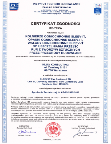 DN tl In tl In T"[-'l lEl!. INSTYTUT TECHNIKI BUDOWLANEJ @ ZAKLAD CERTYFIKA6.,1 ul. FILTROWA't, 00-611 WARSZAWA tel.: (22) 57 96 167, (22\ 57 96 168, fax: (22) 57 96 295 e-mail: ceńyfikacja@itb'pl' www.itb.pl nn CERTYFIKAT ZGODNOSCI In n nn tTB-71g^,tr In Potwierdza się, że: nn KoŁNlERzE oGNlocHRoNNE SLEEV_IT, rn OPASKI OGNIOCHRONNE SLEEV.IT, WKŁADY oGNlocHRoNNE SLEEV_IT Do UszczELNlANlA PRzEJŚc RUR Z TWORZYW SZTUCZNYCH PRZEZ PRZEG RODY BU DOWLAN E In fl nu-l t In przeznaczenie, zakres i warunki stosowania wg pkt. 2 Aprobaty Technicznej ITB nr AT-1S-S9gZl2O12 wprowadzone do obrotu i produkowane płzez| w zakładzie produkcyjnym nn n !n n : Aprobacie Technicznej Nr AT-1 5-5997 nn Producent wdrozył system zakładowej kontroli produkcji w zakładzie produkcyjnym, zgodnie z planem badań. i 120'12 prowadzi badania próbek wyrobu, pobranych Zakład Ceńyfikacji lTB przeprowadził wstępne badania typu oraz wstępny audit zakładu produkcyjnego i zakładowej kontroli produkcji, prowadzi staly nadzór' ocenę i akceptację zakładowej kontroli produkcji. Niniejszy certyfikat jest dokumentem wymaganym W systemie oceny zgodności 1, zgodnie z rozpoządzeniem Ministra lnfrastruktury z dnia 11 sierpnia 2004 r. w sprawie sposobów deklarowania zgodnoŚci wyrobÓw budowlanych oraz sposobu znakowania ich znakiem budowlanym (Dz' U. Nr 198 poz.2041 zpoŹn.zm.)' Ceńyfikat zgodności nr lTB-719^// został wydany po raz pienłszy 23.12.2oo3. (zaktualizowany 14.03'2007, 26.10.2010,19.07.2011,27'07.2012) nLl !n nn In f_-l nn .ln [f Niniejszy ceńyfikat móze być stosowany tylko w odniesieniu do wyrobów spełniających wymagania ww. specyfikacji technicznej i jest wazny do 18.06.2017,o ile specyfikacja techniczna zachowuje swojąważnoścoraz nie uległy istotnym zmianom: typ wyrobu' warunki i miejsce produkcji lub system zakładowej kontroli produkcji. KIEROWNIK Zakładu Ceńyfikacji nn nn nn spełniają wymagania określone w: In t- l nn t*l nn nn tf nn SLEEV-IT Fire Systems LTD Unit 21, Cloverlay Industrial Park Canterbury Lane Rainham, Kent MEB 8GL In nil nn nn KLUG KONSULTING ul. Zamiany 51121 02-786 Warszawa nn nn n il nn n ril r-l nn n nn nn nn nn nn nn DYREKTOR I nstytutu Techniki Budowlanej &a=cbo,łą Barbara Dobosz f Warszawa, 27.07.2012 l/, ',lan Bobrowicz nil rl ff