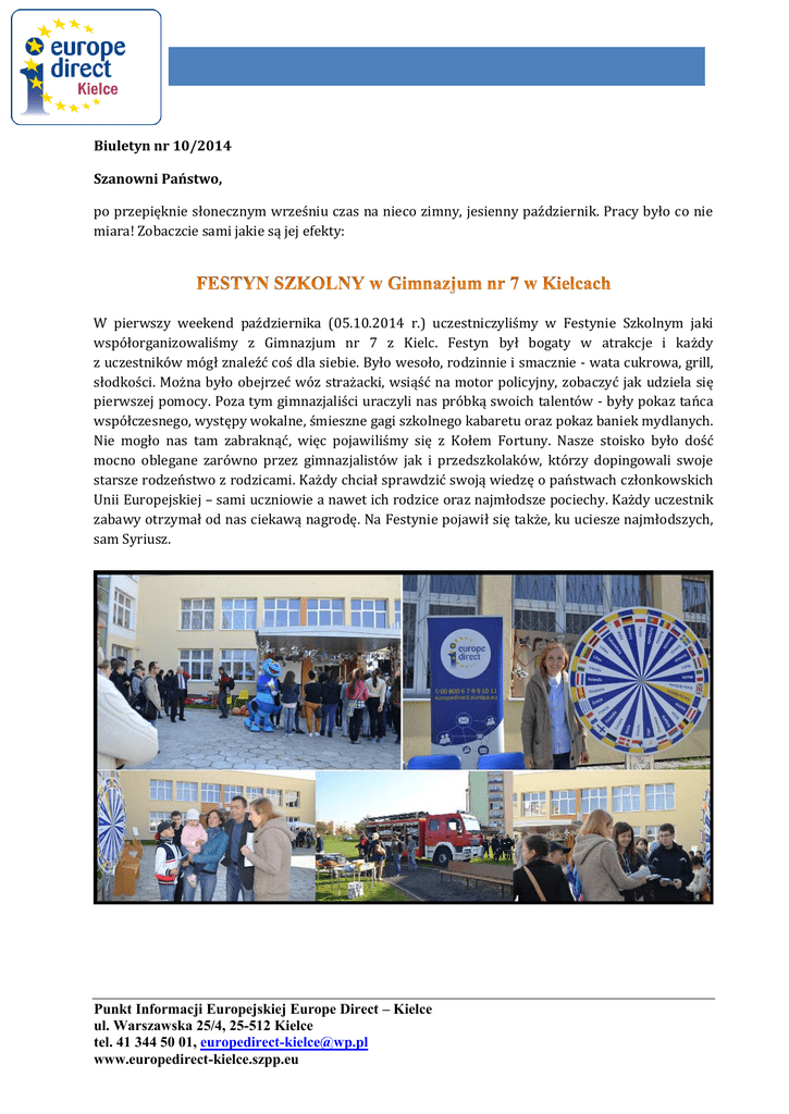Biuletyn nr 10/2014 Szanowni Państwo, po przepięknie słonecznym wrześniu czas na nieco zimny, jesienny październik. Pracy było co nie miara! Zobaczcie sami jakie są jej efekty: W pierwszy weekend października (05.10.2014 r.) uczestniczyliśmy w Festynie Szkolnym jaki współorganizowaliśmy z Gimnazjum nr 7 z Kielc. Festyn był bogaty w atrakcje i każdy z uczestników mógł znaleźć coś dla siebie. Było wesoło, rodzinnie i smacznie - wata cukrowa, grill, słodkości. Można było obejrzeć wóz strażacki, wsiąść na motor policyjny, zobaczyć jak udziela się pierwszej pomocy. Poza tym gimnazjaliści uraczyli nas próbką swoich talentów - były pokaz tańca współczesnego, występy wokalne, śmieszne gagi szkolnego kabaretu oraz pokaz baniek mydlanych. Nie mogło nas tam zabraknąć, więc pojawiliśmy się z Kołem Fortuny. Nasze stoisko było dość mocno oblegane zarówno przez gimnazjalistów jak i przedszkolaków, którzy dopingowali swoje starsze rodzeństwo z rodzicami. Każdy chciał sprawdzić swoją wiedzę o państwach członkowskich Unii Europejskiej – sami uczniowie a nawet ich rodzice oraz najmłodsze pociechy. Każdy uczestnik zabawy otrzymał od nas ciekawą nagrodę. Na Festynie pojawił się także, ku uciesze najmłodszych, sam Syriusz. Punkt Informacji Europejskiej Europe Direct – Kielce ul. Warszawska 25/4, 25-512 Kielce tel. 41 344 50 01, [email protected] www.europedirect-kielce.szpp.eu Klub Młodego Europejczyka ze Szkoły Podstawowej nr 28 z Kielc wraz z opiekunką Klubu Panią Kamilą Biegalską odwiedzili nasze biuro 7 października br. Uczniowie mieli okazję podpatrzeć jak wygląda nasza praca, z zachwytem oglądali bogatą w różnorodne publikacje i materiały półkę jak również stoisko komputerowe dostępne dla każdego, kto zawita w nasze progi. Po zwiedzeniu naszego biura, uczniowie obejrzeli prezentację oraz wzięli udział w quizie przygotowanym przez naszego konsultanta Krzysztofa. Klubowicze bezbłędnie odpowiadali na zadawane pytania dotyczące Unii Europejskiej, za co otrzymali ciekawe upominki. Rozmawialiśmy o państwach członkowskich, kwestiach ekologicznych, obywatelstwie europejskim. Dużo uwagi poświęciliśmy rozwojowi naszemu regionu jaki dokonał się przy udziale funduszy europejskich przez ostatnie 10 lat. Mamy nadzieję, że odwiedziny w naszym Punkcie staną się małą tradycją dlatego już teraz zapraszamy wszystkie Koła Młodego Europejczyka z regionu! Punkt Informacji Europejskiej Europe Direct – Kielce ul. Warszawska 25/4, 25-512 Kielce tel. 41 344 50 01, [email protected] www.europedirect-kielce.szpp.eu Gdzieś, jeszcze we wrześniu pojawiła się w naszym biurze pani, która odbierała kalendarz europejski. Okazało się, że już od jakiegoś czasu śledzi nasze poczynania, które bardzo się jej podobają i dlatego chce nas zaprosić w pewne wyjątkowe miejsce. Tak nawiązaliśmy współpracę z Kołem Związku Młodzieży Wiejskiej w Śladkowie Małym. Nasze pierwsze spotkanie „Eurolekcje dla Euro-obywateli” odbyło się w świetlicy Remizy OSP Śladków Mały w połowie października. Uczestnikami byli uczniowie szkół podstawowych, przedszkolaki jak również ich rodzice oraz osoby korzystające z usług gminnej świetlicy. Nasze spotkanie poświeciliśmy rozmowom na temat praw i obowiązków Euro-obywateli, powstania Unii Europejskiej i jej państwach członkowskich. Publikacje, malowanki, mapy i książeczki rozchodziły się jak świeże bułeczki. Po spotkaniu podpisaliśmy akt powołania Klubu Młodego Europejczyka. A oto nasze świeżutkie Kluby Młodego Europejczyka (KME) powołane w bieżącym miesiącu: KME w świetlicy w Śladkowie Małym, KME w Publicznym Gimnazjum w Kajetanowie, KME w Publicznym Gimnazjum w Tumlinie. Jubileuszowa X Ogólnopolska Olimpiada Wiedzy o Unii Europejskiej Tegoroczna edycja Ogólnopolskiej Olimpiady „Gwiezdny Krąg” skierowana do uczniów szkół ponadgimnazjalnych z całej Polski będzie przebiegać pod hasłem „10 lat Polski w UE – 10 lat Gwiezdnego Kręgu”. Celem Olimpiady jest popularyzowanie wiedzy wśród uczniów polskich szkół ponadgimnazjalnych idei Zjednoczonej Europy, zasad demokratycznego państwa prawa, historii integracji Unii Europejskiej, mechanizmów funkcjonowania instytucji europejskich, systemu prawa unijnego, praw i obowiązków przysługującym obywatelom Unii Europejskiej oraz polityk Unii Europejskiej. Organizatorem Olimpiady jest: Miasto Słupsk, Sieć Punktów Informacji Europejskiej Europe Direct w Polsce oraz Stowarzyszenie "Pomorskie w Unii Europejskiej". Nagrodą główną dla trzech najlepszych finalistów jest staż w Brukseli ufundowany przez Stowarzyszenie "Pomorskie w Unii Europejskiej". Zainteresowani uczniowie mogą rejestrować za pomocą Słupskiej Miejskiej Platformy E-Learningowej: http://szkolenia.slupsk.eu/ do 22 listopada 2014 roku. Więcej informacji: http://gwiezdnykrag.eu/ i https://www.facebook.com/EDSlupsk Punkt Informacji Europejskiej Europe Direct – Kielce ul. Warszawska 25/4, 25-512 Kielce tel. 41 344 50 01, [email protected] www.europedirect-kielce.szpp.eu Mamy nadzieję, że i w tym roku świętokrzyscy uczniowie wezmą udział w Olimpiadzie i za przykładem zeszłorocznego laureata Andrzeja Szulca, ucznia kieleckiego Liceum Ogólnokształcącego im. św. Jadwigi Królowej, znajdą się na podium. TARGI PRACY NA UJK Punkt Informacji Europejskiej Europe Direct-Kielce wystawił się na Targach Pracy organizowanych przez Miejski Urząd Pracy w Kielcach w Uniwersytecie Jana Kochanowskiego. Nasi konsultanci informowali zainteresowanych o możliwościach odbycia stażu w instytucjach Unii Europejskiej, rozpowszechniali materiały promocyjne związane z tematyką rynku pracy. Stoisko PIE ED-Kielce cieszyło się dużą popularnością. Każdy z zainteresowanych mógł dowiedzieć się więcej na temat europejskich instytucji rynku pracy, możliwości podjęcia tam pracy, stażu i studi