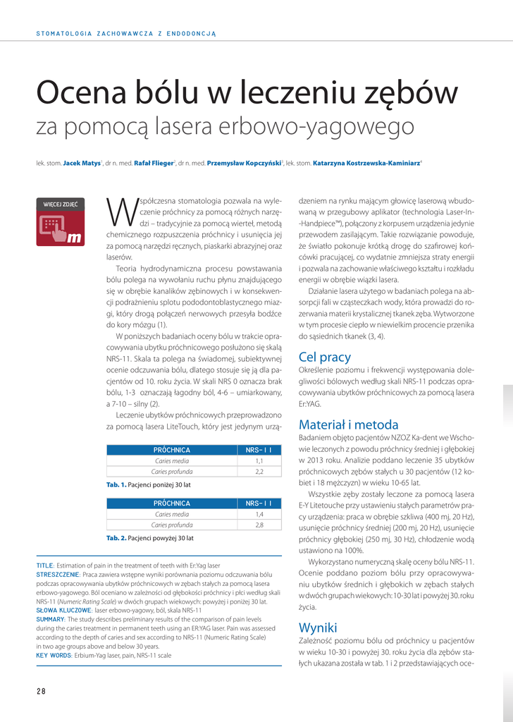 s t o m at o l o g i a z a c h o w a w c z a z e n d o d o n c j ą Ocena bólu w leczeniu zębów za pomocą lasera erbowo-yagowego lek. stom. Jacek Matys1, dr n. med. Rafał Flieger2, dr n. med. Przemysław Kopczyński3, lek. stom. Katarzyna Kostrzewska-Kaminiarz4 WIĘCEJ ZDJĘĆ m W spółczesna stomatologia pozwala na wyleczenie próchnicy za pomocą różnych narzędzi – tradycyjnie za pomocą wierteł, metodą chemicznego rozpuszczenia próchnicy i usunięcia jej za pomocą narzędzi ręcznych, piaskarki abrazyjnej oraz laserów. Teoria hydrodynamiczna procesu powstawania bólu polega na wywołaniu ruchu płynu znajdującego się w obrębie kanalików zębinowych i w konsekwencji podrażnieniu splotu pododontoblastycznego miazgi, który drogą połączeń nerwowych przesyła bodźce do kory mózgu (1). W poniższych badaniach oceny bólu w trakcie opracowywania ubytku próchnicowego posłużono się skalą NRS-11. Skala ta polega na świadomej, subiektywnej ocenie odczuwania bólu, dlatego stosuje się ją dla pacjentów od 10. roku życia. W skali NRS 0 oznacza brak bólu, 1-3 oznaczają łagodny ból, 4-6 – umiarkowany, a 7-10 – silny (2). Leczenie ubytków próchnicowych przeprowadzono za pomocą lasera LiteTouch, który jest jedynym urząPRÓCHNICA NRS-11 Caries media 1,1 Caries profunda 2,2 Tab. 1. Pacjenci poniżej 30 lat PRÓCHNICA NRS-11 Caries media 1,4 Caries profunda 2,8 Tab. 2. Pacjenci powyżej 30 lat TITLE: Estimation of pain in the treatment of teeth with Er:Yag laser STRESZCZENIE: Praca zawiera wstępne wyniki porównania poziomu odczuwania bólu podczas opracowywania ubytków próchnicowych w zębach stałych za pomocą lasera erbowo-yagowego. Ból oceniano w zależności od głębokości próchnicy i płci według skali NRS-11 (Numeric Rating Scale) w dwóch grupach wiekowych: powyżej i poniżej 30 lat. SŁOWA KLUCZOWE: laser erbowo-yagowy, ból, skala NRS-11 SUMMARY: The study describes preliminary results of the comparison of pain levels during the caries treatment in permanent teeth using an ER:YAG laser. Pain was assessed according to the depth of caries and sex according to NRS-11 (Numeric Rating Scale) in two age groups above and below 30 years. KEY WORDS: Erbium-Yag laser, pain, NRS-11 scale 28 dzeniem na rynku mającym głowicę laserową wbudowaną w przegubowy aplikator (technologia Laser-In-Handpiece™), połączony z korpusem urządzenia jedynie przewodem zasilającym. Takie rozwiązanie powoduje, że światło pokonuje krótką drogę do szafirowej końcówki pracującej, co wydatnie zmniejsza straty energii i pozwala na zachowanie właściwego kształtu i rozkładu energii w obrębie wiązki lasera. Działanie lasera użytego w badaniach polega na absorpcji fali w cząsteczkach wody, która prowadzi do rozerwania materii krystalicznej tkanek zęba. Wytworzone w tym procesie ciepło w niewielkim procencie przenika do sąsiednich tkanek (3, 4). Cel pracy Określenie poziomu i frekwencji występowania dolegliwości bólowych według skali NRS-11 podczas opracowywania ubytków próchnicowych za pomocą lasera Er:YAG. Materiał i metoda Badaniem objęto pacjentów NZOZ Ka-dent we Wschowie leczonych z powodu próchnicy średniej i głębokiej w 2013 roku. Analizie poddano leczenie 35 ubytków próchnicowych zębów stałych u 30 pacjentów (12 kobiet i 18 mężczyzn) w wieku 10-65 lat. Wszystkie zęby zostały leczone za pomocą lasera E-Y Litetouche przy ustawieniu stałych parametrów pracy urządzenia: praca w obrębie szkliwa (400 mj, 20 Hz), usunięcie próchnicy średniej (200 mj, 20 Hz), usunięcie próchnicy głębokiej (250 mj, 30 Hz), chłodzenie wodą ustawiono na 100%. Wykorzystano numeryczną skalę oceny bólu NRS-11. Ocenie poddano poziom bólu przy opracowywaniu ubytków średnich i głębokich w zębach stałych w dwóch grupach wiekowych: 10-30 lat i powyżej 30. roku życia. Wyniki Zależność poziomu bólu od próchnicy u pacjentów w wieku 10-30 i powyżej 30. roku życia dla zębów stałych ukazana została w tab. 1 i 2 przedstawiających oce- t w ó j p r z e g l ą d s t o m at o l o g i c z n y s t o m at o l o g i a z a c h o w a w c z a z e n d o d o n c j ą 11/2014 ny bólu w 2 grupach wiekowych w zależności od głębokości ubytku próchnicowego. Średnia wartość odczuwania bólu obu grup wiekowych dla próchnicy średniej wyniosła 1,25, a dla głębokiej – 2,5, i mieści się na poziomie odczuwania bólu łagodnego. Bezbolesne opracowanie ubytków klasy średniej miało miejsce w 58,3% przypadków, a głębokiej – w 28,4%. Wyniki te są zbliżone do innych tego typu badań (5, 6, 7) . Dyskusja Głównymi przyczynami dentofobii u pacjentów leczonych stomatologicznie są strach przed bólem oraz dźwięk turbiny dentystycznej. Technika laserowego opracowania ubytków pozwala wyeliminować bądź wykonać zabieg przy łagodnym odczuwaniu bólu (NRS < 3) dla próchnicy głębokiej w 59,8%, a średniej – w 94,8%. Są to wyniki zadowalające, dzięki którym pacjenci chętniej odwiedzają gabinet stomatologiczny. Pacjenci leczeni za pomocą lasera erbowo-yagowego potwierdzają mniejsze doznania stresowe wynikające z wizyty w gabinecie stomatologicznym, zatem jego używanie może być „lekarstwem” na dentofobię (8). W dalszych badaniach zostanie poddane ocenie odczuwanie bólu w czasie leczenia próchnicy w zależności od klasy Blacka ubytku, płci oraz wieku pacjentów. Piśmiennictwo 1. Romanowicz M.: Mechanizm bólu obwodowego i centralnego w układzie stomatognatycznym. „Medycyna”, 2000, 1996, 7, 20-23. 2. Jensen M.P. i wsp.: The subjective experience of acute pain. An assessment of the utility of 10 indices. „Clin J Pain.”, 2009, 5, 153-159. 3. Szpringeri-Nodzak M. i wsp.: Stomatologia wieku rozwojowego, 2007, 4, 707-708. 4. Miserendino L.J., Levy G., Miserendino C.A.: Laser interaction with biologictissues. Red. L.J. Miserendino, R.M Pick: Lasers in Dentistry. Quintessence Publishing Co., C