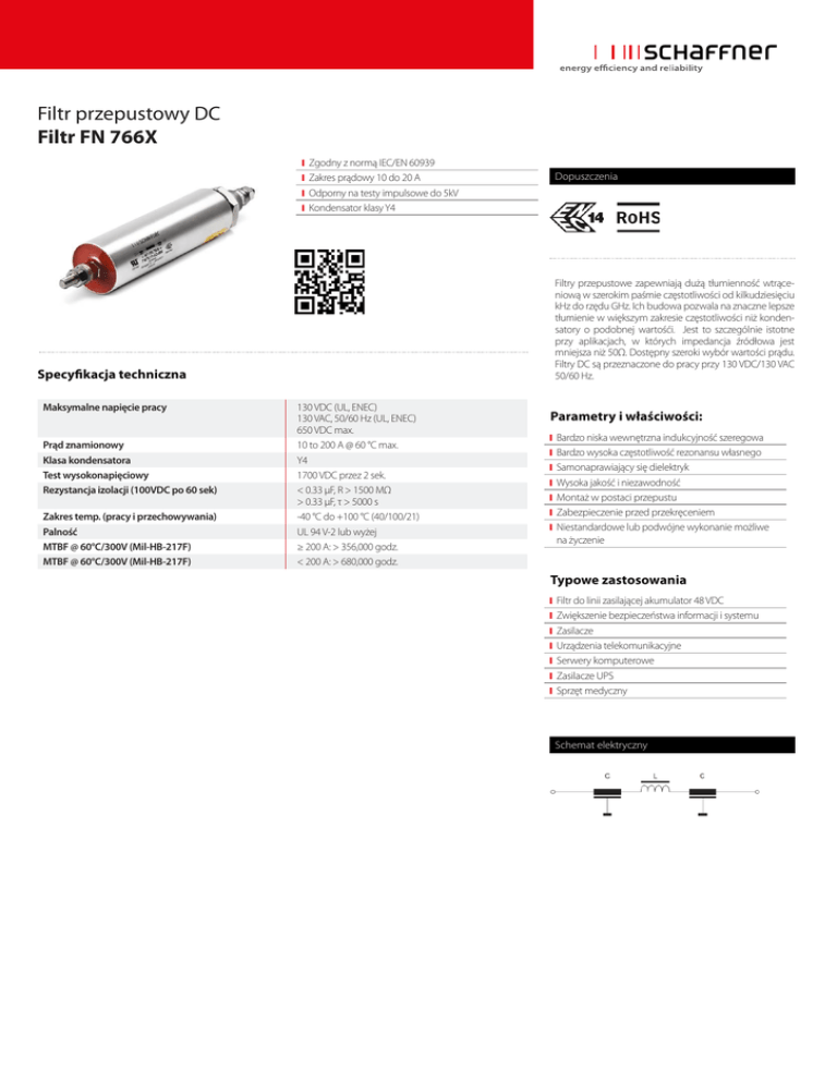 Filtr przepustowy DC Filtr FN 766X ┃ Zgodny z normą IEC/EN 60939 ┃ Zakres prądowy 10 do 20 A Dopuszczenia ┃ Odporny na testy impulsowe do 5kV ┃ Kondensator klasy Y4 Filtry przepustowe zapewniają dużą tłumienność wtrąceniową w szerokim paśmie częstotliwości od kilkudziesięciu kHz do rzędu GHz. Ich budowa pozwala na znaczne lepsze tłumienie w większym zakresie częstotliwości niż kondensatory o podobnej wartośći. Jest to szczególnie istotne przy aplikacjach, w których impedancja źródłowa jest mniejsza niż 50Ω. Dostępny szeroki wybór wartości prądu. Filtry DC są przeznaczone do pracy przy 130 VDC/130 VAC 50/60 Hz. Specyfikacja techniczna Maksymalne napięcie pracy Prąd znamionowy Klasa kondensatora Test wysokonapięciowy Rezystancja izolacji (100VDC po 60 sek) Zakres temp. (pracy i przechowywania) Palność MTBF @ 60°C/300V (Mil-HB-217F) MTBF @ 60°C/300V (Mil-HB-217F) 130 VDC (UL, ENEC) 130 VAC, 50/60 Hz (UL, ENEC) 650 VDC max. 10 to 200 A @ 60 °C max. Y4 1700 VDC przez 2 sek. < 0.33 μF, R > 1500 MΩ > 0.33 μF, τ > 5000 s -40 °C do +100 °C (40/100/21) UL 94 V-2 lub wyżej ≥ 200 A: > 356,000 godz. < 200 A: > 680,000 godz. Parametry i właściwości: ┃ Bardzo niska wewnętrzna indukcyjność szeregowa ┃ Bardzo wysoka częstotliwość rezonansu własnego ┃ Samonaprawiający się dielektryk ┃ Wysoka jakość i niezawodność ┃ Montaż w postaci przepustu ┃ Zabezpieczenie przed przekręceniem ┃ Niestandardowe lub podwójne wykonanie możliwe na życzenie Typowe zastosowania ┃ Filtr do linii zasilającej akumulator 48 VDC ┃ Zwiększenie bezpieczeństwa informacji i systemu ┃ Zasilacze ┃ Urządzenia telekomunikacyjne ┃ Serwery komputerowe ┃ Zasilacze UPS ┃ Sprzęt medyczny Schemat elektryczny 2 Tabela wyboru Feedthrough Model Rated current Prąd znamionowy Leakage Prądcurrent* upływu* Capacitance** Pojemność** Inductance Indukcyjność DC resistance*** Rezystancja DC*** Weight Waga @ 60 °C [A] @ 130 VAC/50 Hz [mA] C [nF] L @ 10 kHz [nH] R @ 25 °C [mΩ] [g] FN 7660-10-M3 10 0.98 10 58 1.06 48 FN 7661-10-M3 10 9.8 100 70 1.2 55 FN 7661-16-M4 16 9.8 100 70 0.7 58 FN 7660-32-M4 32 0.98 10 70 0.65 58 FN 7661-32-M4 32 9.8 100 70 0.7 58 FN 7660-63-M6 63 9.8 100 70 0.42 120 FN 7661-63-M6 63 46 470 186 0.47 250 FN 7660-100-M8 100 46 470 124 0.25 280 FN 7661-100-M8 100 98 1000 186 0.28 320 FN 7660-200-M10 200 46 470 124 0.24 410 FN 7661-200-M10 200 460.7 4700 124 0.24 655 **Tolerancja +20% Tolerance +20% ** ** Tolerancja Tolerance±20% ±20% *** *** Tolerancja Tolerance+15% +15% Tłumienność wtrąceniowa Pełne obciążenie, system 50 Ω typ 10 A typ 16 A typ 100 A typ 200 A typ 32 A typ 63 A 3 Parametry mechaniczne FN 766x Wycięcie panelu Wymiary A B C D E L M N S T FN 7660-10-M3 90 12 20 17 16 49 10.3 Ø12.3 M3 M12x1 FN 7661-10-M3 107 12 20 17 16 66 10.3 Ø12.3 M3 M12x1 FN 7661-16-M4 106 12 20 17 18 61 10.3 Ø12.3 M4 M12x1 FN 7660-32-M4 98 12 20 17 18 53 10.3 Ø12.3 M4 M12x1 FN 7661-32-M4 106 12 20 17 18 61 10.3 Ø12.3 M4 M12x1 FN 7660-63-M6 160 14 25 22 26 94 14.3 Ø16.3 M6 M16x1 FN 7661-63-M6 173 16 32 27 26 105 18.3 Ø20.3 M6 M20x1 FN 7660-100-M8 184 16 32 27 32 104 18.3 Ø20.3 M8 M20x1 FN 7661-100-M8 200 16 32 27 32 120 18.3 Ø20.3 M8 M20x1 FN 7660-200-M10 209 19 38 27 40 112 22.3 Ø24.3 M10 M24x1 FN 7661-200-M10 209 19 54 41 40 112 24.3 Ø27.3 M10 M27x1.5 Tolerancja Tolerances ±2 ±0.2 Wszystkie wymiary w mm1 inch = 25.4 mm All dimensions in mm; Tolerances ISO 2768-m / EN 22768-m Tolerancja wgaccording: ISO 2768-m / EN 22768-m Zalecany moment dokręcenia Terminal thread Gwint zaciskowy Mounting thread Gwint montażowy M3 M4 M6 M8 M10 0.5 Nm 1.2 Nm 2.5 Nm 5 Nm 8 Nm M12x1 M16x1 M20x1 M24x1 M27x1.5 3 Nm 4 Nm 7 Nm 8 Nm 12 Nm