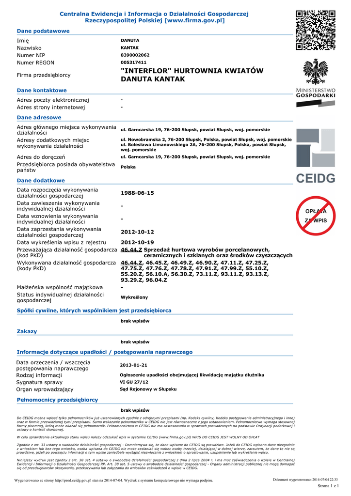 Centralna Ewidencja i Informacja o Działalności Gospodarczej Rzeczypospolitej Polskiej [www.firma.gov.pl] Dane podstawowe Imię Nazwisko Numer NIP Numer REGON Firma przedsiębiorcy DANUTA KANTAK 8390002062 005317411 "INTERFLOR" HURTOWNIA KWIATÓW DANUTA KANTAK Dane kontaktowe Adres poczty elektronicznej Adres strony internetowej Dane adresowe Adres głównego miejsca wykonywania ul. Garncarska 19, 76200 Słupsk, powiat Słupsk, woj. pomorskie działalności ul. Nowobramska 2, 76200 Słupsk, Polska, powiat Słupsk, woj. pomorskie Adresy dodatkowych miejsc ul. Bolesława Limanowskiego 2A, 76200 Słupsk, Polska, powiat Słupsk, wykonywania działalności woj. pomorskie Adres do doręczeń Przedsiębiorca posiada obywatelstwa państw ul. Garncarska 19, 76200 Słupsk, powiat Słupsk, woj. pomorskie Polska Dane dodatkowe Data rozpoczęcia wykonywania działalności gospodarczej Data zawieszenia wykonywania indywidualnej działalności Data wznowienia wykonywania indywidualnej działalności Data zaprzestania wykonywania działalności gospodarczej Data wykreślenia wpisu z rejestru Przeważająca działalność gospodarcza (kod PKD) Wykonywana działalność gospodarcza (kody PKD) Małżeńska wspólność majątkowa Status indywidualnej działalności gospodarczej 19880615 20121012 20121019 46.44.Z Sprzedaż hurtowa wyrobów porcelanowych, ceramicznych i szklanych oraz środków czyszczących 46.44.Z, 46.45.Z, 46.49.Z, 46.90.Z, 47.11.Z, 47.25.Z, 47.75.Z, 47.76.Z, 47.78.Z, 47.91.Z, 47.99.Z, 55.10.Z, 55.20.Z, 56.10.A, 56.30.Z, 73.11.Z, 93.11.Z, 93.13.Z, 93.29.Z, 96.04.Z Wykreślony Spółki cywilne, których wspólnikiem jest przedsiębiorca brak wpisów Zakazy brak wpisów Informacje dotyczące upadłości / postępowania naprawczego Data orzeczenia / wszczęcia postępowania naprawczego Rodzaj informacji Sygnatura sprawy Organ wprowadzający 20130121 Ogłoszenie upadłości obejmującej likwidację majątku dłużnika VI GU 27/12 Sąd Rejonowy w Słupsku Pełnomocnicy przedsiębiorcy brak wpisów Do CEIDG można wpisać tylko pełnomocników już ustanowionych zgodnie z odrębnymi przepisami (np. Kodeks cywilny, Kodeks postępowania administracyjnego i inne) oraz w formie przewidzianej tymi przepisami. Samo wskazanie pełnomocnika w CEIDG nie jest równoznaczne z jego ustanowieniem. Pełnomocnictwo wymaga stosownej formy pisemnej, którą może okazać się pełnomocnik. Pełnomocnictwo w CEIDG nie ma zastosowania w sprawach prowadzonych na podstawie Ordynacji podatkowej i ustawy o kontroli skarbowej. W celu sprawdzenia aktualnego stanu wpisu należy odszukać wpis w systemie CEIDG (www.firma.gov.pl) WPIS DO CEIDG JEST WOLNY OD OPŁAT Zgodnie z art. 33 ustawy o swobodzie działalności gospodarczej Domniemywa się, że dane wpisane do CEIDG są prawdziwe. Jeżeli do CEIDG wpisano dane niezgodnie z wnioskiem lub bez tego wniosku, osoba wpisana do CEIDG nie może zasłaniać się wobec osoby trzeciej, działającej w dobrej wierze, zarzutem, że dane te nie są prawdziwe, jeżeli po powzięciu informacji o tym wpisie zaniedbała wystąpić niezwłocznie z wnioskiem o sprostowanie, uzupełnienie lub wykreślenie wpisu. Niniejszy wydruk jest zgodny z art. 38 ust. 4 ustawy o swobodzie działalności gospodarczej z dnia 2 lipca 2004 r. i ma moc zaświadczenia o wpisie w Centralnej Ewidencji i Informacji o Działalności Gospodarczej RP. Art. 38 ust. 5 ustawy o swobodzie działalności gospodarczej Organy administracji publicznej nie mogą domagać się od przedsiębiorców okazywania, przekazywania lub załączania do wniosków zaświadczeń o wpisie w CEIDG. Wygenerowano ze strony http://prod.ceidg.gov.pl stan na 20140704. Wydruk z systemu komputerowego nie wymaga podpisu. Dokument wygenerowano: 20140704 22:33 Strona 1 z 1