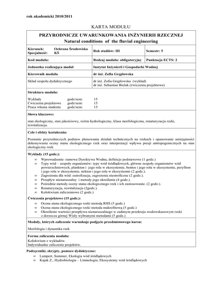 rok akademicki 2010/2011 KARTA MODUŁU PRZYRODNICZE UWARUNKOWANIA INśYNIERII RZECZNEJ Natural conditions of the fluvial engineering Kierunek: Specjalność: Ochrona Środowiska KŚ Rok studiów: III Semestr: 5 Kod modułu: Rodzaj modułu: obligatoryjny Punktacja ECTS: 2 Jednostka realizująca moduł Instytut InŜynierii i Gospodarki Wodnej Kierownik modułu dr inŜ. Zofia Gręplowska Skład zespołu dydaktycznego dr inŜ. Zofia Gręplowska (wykład) dr inŜ. Sebastian Bielak (ćwiczenia projektowe) Struktura modułu: Wykłady Ćwiczenia projektowe Praca własna studenta godz/sem: godz/sem: godz/sem: 15 15 15 Słowa kluczowe: stan ekologiczny, stan jakościowy, reŜim hydrologiczny, klasa morfologiczna, renaturyzacja rzeki, rewitalizacja. Cele i efekty kształcenia: Poznanie przyrodniczych podstaw planowania działań technicznych na rzekach i opanowanie umiejętności dokonywania oceny stanu ekologicznego rzek oraz interpretacji wpływu presji antropogenicznych na stan ekologiczny rzek. Wykłady (15 godz.): • • • • • • • Wprowadzenie: ramowa Dyrektywa Wodna, definicje podstawowe (1 godz.) Typy wód – zespoły organizmów: typy wód śródlądowych, główne zespoły organizmów wód powierzchniowych, plankton i jego rola w ekosystemie, bentos i jego rola w ekosystemie, peryfiton i jego rola w ekosystemie, nekton i jego rola w ekosystemie (2 godz.). ZagroŜenia dla wód: eutrofizacja, zagroŜenia niestroficzne (2 godz.). Przepływ nienaruszalny i metody jego określania (4 godz.). Pośrednie metody oceny stanu ekologicznego rzek i ich zastosowanie. (2 godz.). Renaturyzacja, rewitalizacja (2godz.). Kolokwium zaliczeniowe (2 godz.) Ćwiczenia projektowe (15 godz.): • • • Ocena stanu ekologicznego rzeki metodą RHS (5 godz.) Ocena stanu ekologicznego rzeki metoda makrofitową (5 godz.) Określenie wartości przepływu nienaruszalnego w zadanym przekroju wodowskazowym rzeki z dorzecza górnej Wisły wybranymi metodami (5 godz.) Moduły, których zaliczenie warunkuje podjęcie przedmiotowego kursu: Morfologia i dynamika rzek Forma zaliczenia modułu: Kolokwium z wykładów. Indywidualne zaliczenie projektów. Podręczniki, skrypty, pomoce dydaktyczne: • • Lampert, Sommer, Ekologia wód śródlądowych Kajak Z., Hydrobiologia – Limnologia; Ekosystemy wód śródlądowych • • • • śelazo J., Popek Z., Podstawy renaturyzacji rzek, SGGW, W-wa, 2002 Schiechtl H. M., Stern R., Naturnaher Wasserbau; Einleitung für ingenieurbiologische Bauweisen, Ernst u. Sohn, 2001 Nachlik E. (red.), Identyfikacja i ocena oddziaływań antropogenicznych na zasoby wodne dla wskazania części wód zagroŜonych nieosiągnięciem celów środowiskowych, Wyd. PK, Kraków, 2004 Z. Gręplowska, Pomoce dydaktyczne na stronie: www.iigw.pl