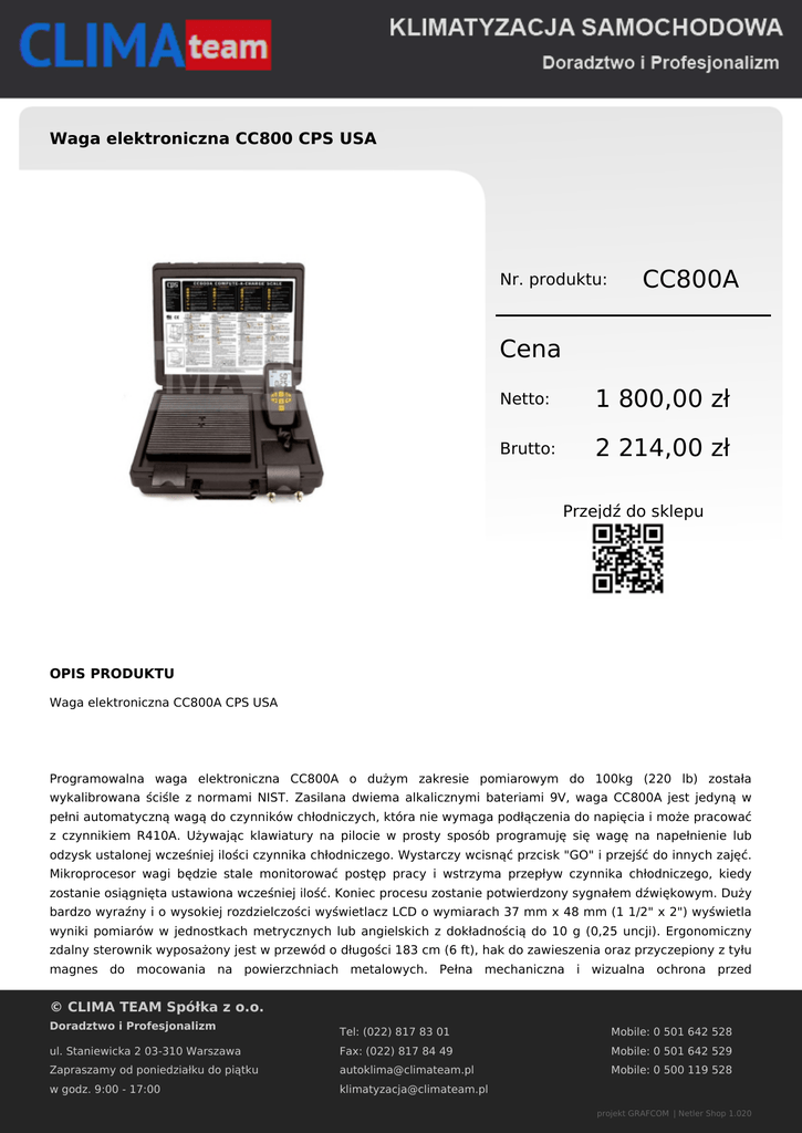 Waga elektroniczna CC800 CPS USA Nr. produktu: CC800A Cena Netto: 1 800,00 zł Brutto: 2 214,00 zł Przejdź do sklepu OPIS PRODUKTU Waga elektroniczna CC800A CPS USA Programowalna waga elektroniczna CC800A o dużym zakresie pomiarowym do 100kg (220 lb) została wykalibrowana ściśle z normami NIST. Zasilana dwiema alkalicznymi bateriami 9V, waga CC800A jest jedyną w pełni automatyczną wagą do czynników chłodniczych, która nie wymaga podłączenia do napięcia i może pracować z czynnikiem R410A. Używając klawiatury na pilocie w prosty sposób programuję się wagę na napełnienie lub odzysk ustalonej wcześniej ilości czynnika chłodniczego. Wystarczy wcisnąć przcisk "GO" i przejść do innych zajęć. Mikroprocesor wagi będzie stale monitorować postęp pracy i wstrzyma przepływ czynnika chłodniczego, kiedy zostanie osiągnięta ustawiona wcześniej ilość. Koniec procesu zostanie potwierdzony sygnałem dźwiękowym. Duży bardzo wyraźny i o wysokiej rozdzielczości wyświetlacz LCD o wymiarach 37 mm x 48 mm (1 1/2" x 2") wyświetla wyniki pomiarów w jednostkach metrycznych lub angielskich z dokładnością do 10 g (0,25 uncji). Ergonomiczny zdalny sterownik wyposażony jest w przewód o długości 183 cm (6 ft), hak do zawieszenia oraz przyczepiony z tyłu magnes do mocowania na powierzchniach metalowych. Pełna mechaniczna i wizualna ochrona przed © CLIMA TEAM Spółka z o.o. Doradztwo i Profesjonalizm Tel: (022) 817 83 01 Mobile: 0 501 642 528 ul. Staniewicka 2 03-310 Warszawa Fax: (022) 817 84 49 Mobile: 0 501 642 529 Zapraszamy od poniedziałku do piątku [email protected] Mobile: 0 500 119 528 w godz. 9:00 - 17:00 [email protected] projekt GRAFCOM | Netler Shop 1.020 przciążeniem. Zasilana bateryjnie (dwie baterie 9 V) waga pozwala na 60 godzin ciągłej pracy. Waga posiada funkcję automatycznego wyłączenia. © CLIMA TEAM Spółka z o.o. Doradztwo i Profesjonalizm Tel: (022) 817 83 01 Mobile: 0 501 642 528 ul. Staniewicka 2 03-310 Warszawa Fax: (022) 817 84 49 Mobile: 0 501 642 529 Zapraszamy od poniedziałku do piątku [email protected] Mobile: 0 500 119 528 w godz. 9:00 - 17:00 [email protected] projekt GRAFCOM | Netler Shop 1.020