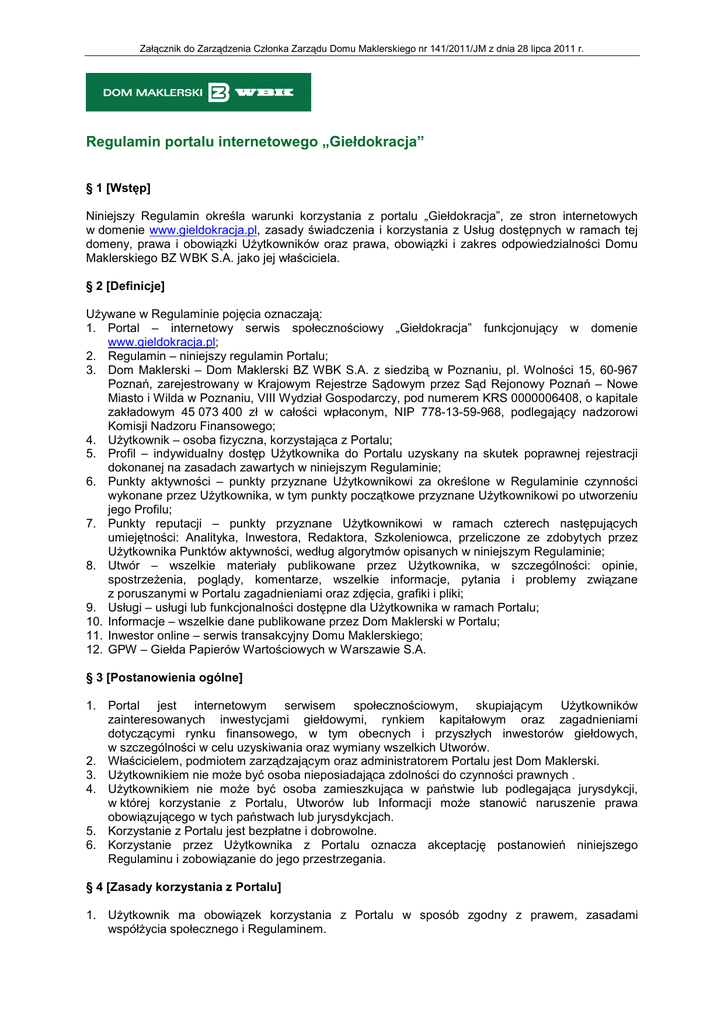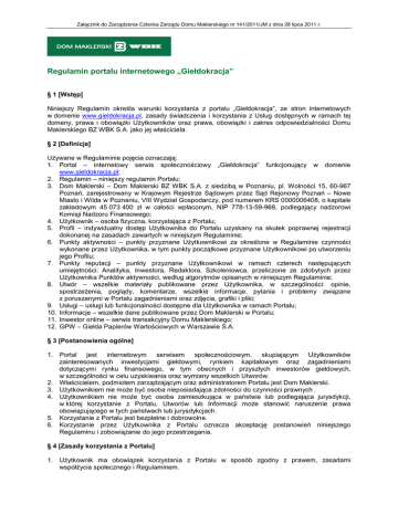 Załącznik do Zarządzenia Członka Zarządu Domu Maklerskiego nr 141/2011/JM z dnia 28 lipca 2011 r. Regulamin portalu internetowego „Giełdokracja” § 1 [Wstęp] Niniejszy Regulamin określa warunki korzystania z portalu „Giełdokracja”, ze stron internetowych w domenie www.gieldokracja.pl, zasady świadczenia i korzystania z Usług dostępnych w ramach tej domeny, prawa i obowiązki UŜytkowników oraz prawa, obowiązki i zakres odpowiedzialności Domu Maklerskiego BZ WBK S.A. jako jej właściciela. § 2 [Definicje] UŜywane w Regulaminie pojęcia oznaczają: 1. Portal – internetowy serwis społecznościowy „Giełdokracja” funkcjonujący w domenie www.gieldokracja.pl; 2. Regulamin – niniejszy regulamin Portalu; 3. Dom Maklerski – Dom Maklerski BZ WBK S.A. z siedzibą w Poznaniu, pl. Wolności 15, 60-967 Poznań, zarejestrowany w Krajowym Rejestrze Sądowym przez Sąd Rejonowy Poznań – Nowe Miasto i Wilda w Poznaniu, VIII Wydział Gospodarczy, pod numerem KRS 0000006408, o kapitale zakładowym 45 073 400 zł w całości wpłaconym, NIP 778-13-59-968, podlegający nadzorowi Komisji Nadzoru Finansowego; 4. UŜytkownik – osoba fizyczna, korzystająca z Portalu; 5. Profil – indywidualny dostęp UŜytkownika do Portalu uzyskany na skutek poprawnej rejestracji dokonanej na zasadach zawartych w niniejszym Regulaminie; 6. Punkty aktywności – punkty przyznane UŜytkownikowi za określone w Regulaminie czynności wykonane przez UŜytkownika, w tym punkty początkowe przyznane UŜytkownikowi po utworzeniu jego Profilu; 7. Punkty reputacji – punkty przyznane UŜytkownikowi w ramach czterech następujących umiejętności: Analityka, Inwestora, Redaktora, Szkoleniowca, przeliczone ze zdobytych przez UŜytkownika Punktów aktywności, według algorytmów opisanych w niniejszym Regulaminie; 8. Utwór – wszelkie materiały publikowane przez UŜytkownika, w szczególności: opinie, spostrzeŜenia, poglądy, komentarze, wszelkie informacje, pytania i problemy związane z poruszanymi w Portalu zagadnieniami oraz zdjęcia, grafiki i pliki; 9. Usługi – usługi lub funkcjonalności dostępne dla UŜytkownika w ramach Portalu; 10. Informacje – wszelkie dane publikowane przez Dom Maklerski w Portalu; 11. Inwestor online – serwis transakcyjny Domu Maklerskiego; 12. GPW – Giełda Papierów Wartościowych w Warszawie S.A. § 3 [Postanowienia ogólne] 1. Portal jest internetowym serwisem społecznościowym, skupiającym UŜytkowników zainteresowanych inwestycjami giełdowymi, rynkiem kapitałowym oraz zagadnieniami dotyczącymi rynku finansowego, w tym obecnych i przyszłych inwestorów giełdowych, w szczególności w celu uzyskiwania oraz wymiany wszelkich Utworów. 2. Właścicielem, podmiotem zarządzającym oraz administratorem Portalu jest Dom Maklerski. 3. UŜytkownikiem nie moŜe być osoba nieposiadająca zdolności do czynności prawnych . 4. UŜytkownikiem nie moŜe być osoba zamieszkująca w państwie lub podlegająca jurysdykcji, w której korzystanie z Portalu, Utworów lub Informacji moŜe stanowić naruszenie prawa obowiązującego w tych państwach lub jurysdykcjach. 5. Korzystanie z Portalu jest bezpłatne i dobrowolne. 6. Korzystanie przez UŜytkownika z Portalu oznacza akceptację postanowień niniejszego Regulaminu i zobowiązanie do jego przestrzegania. § 4 [Zasady korzystania z Portalu] 1. UŜytkownik ma obowiązek korzystania z Portalu w sposób zgodny z prawem, zasadami współŜycia społecznego i Regulaminem. Załącznik do Zarządzenia Członka Zarządu Domu Maklerskiego nr 141/2011/JM z dnia 28 lipca 2011 r. 2. Wszelka wymiana Utworów powinna odbywać się w duchu Ŝyczliwości i rzeczowej polemiki związanej z poruszanymi tematami. 3. Zakazane jest zamieszczanie w Portalu Utworów naruszających w jakikolwiek sposób obowiązujące prawo oraz mogących godzić w dobre obyczaje lub zasady współŜycia społecznego. Zabrania się w szczególności umieszczania wulgaryzmów lub treści powszechnie uznawanych za wulgarne i obraźliwe, treści wzywających do nienawiści rasowej, etnicznej, wyznaniowej, materiałów zawierających treści pornograficzne, nagość, erotykę oraz treści obsceniczne, pochwalających faszyzm, nazizm, komunizm, propagujących przemoc, pornografię lub dyskryminację w szczególności ze względu na płeć, wiek, niepełnosprawność, rasę, religię, narodowość, przekonania polityczne, pochodzenie etniczne, wyznanie, orientację seksualną, a takŜe treści obraŜających inne osoby, jak równieŜ uczucia religijne, czy naruszających prawa i dobra osobiste innych osób, w tym zawierające materiały chronione prawem autorskim bez zgody autora, prawo do prywatności oraz treści reklamowych. 4. Zabronione jest zamieszczanie przez UŜytkownika w Portalu niepotwierdzonych lub nieprawdziwych informacji dotyczących rynku kapitałowego oraz informacji, które mogą mieć znamiona porady inwestycyjnej lub rekomendacji, a takŜe informacji poufnych w rozumieniu ustawy z dnia 29 lipca 2005 r. o obrocie instrumentami finansowymi (t.j. Dz. U. z 2010 r., Nr 211, poz. 1384). 5. Zakazane jest stosowanie technik i urządzeń zakłócających funkcjonowanie Portalu oraz umieszczanie w Portalu materiałów zawierających programy i kody komputerowe mogące zakłócać jego funkcjonowanie, a takŜe wszelkie inne działania mogące wywołać taki skutek. Zakazane jest równieŜ umieszczania w Portalu wszelkich programów, które nie są udostępniane na zasadach licencji wolnego oprogramowania oraz linków do stron zawierających programy, które nie są udostępniane na zasadach licencji wolnego oprogramowania. 6. Usługi i Informacje udostępniane w ramach Portalu nie stanowią oferty, ani nie mają na celu nakłaniania do nabycia lub zbycia jakichkolwiek instrumentów finansowych, innych praw majątkowych, towarów lub skorzystania albo zaprzestania korzystania z usług Domu Maklerskiego. Usługi i Informacje nie są usług