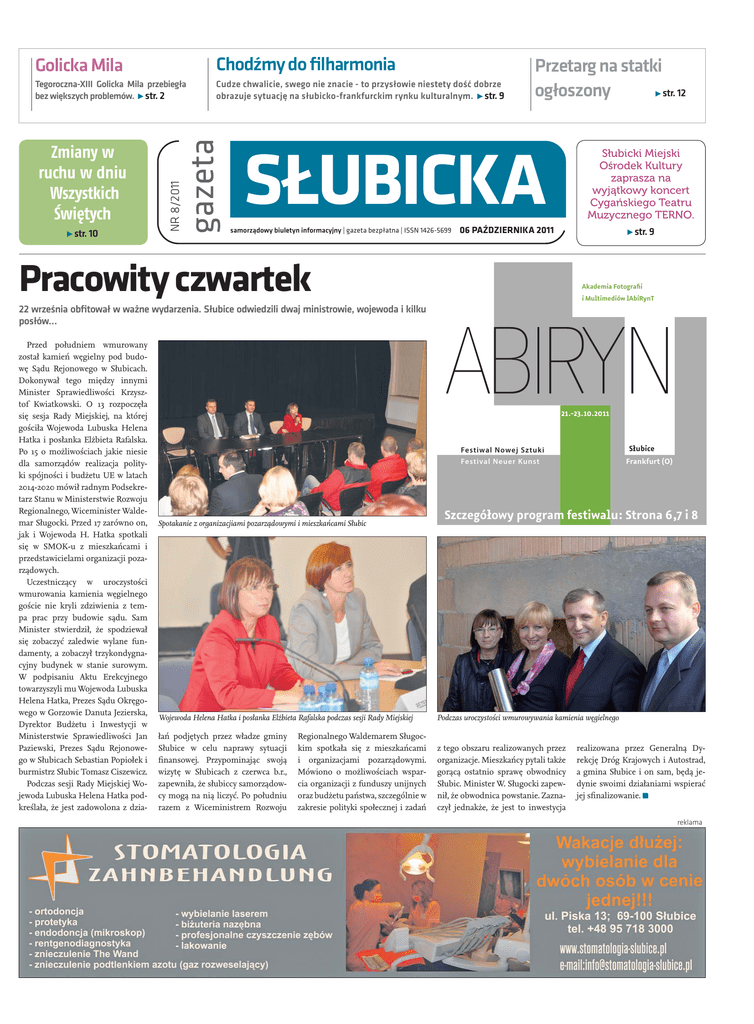 Chodźmy do filharmonia Tegoroczna-XIII Golicka Mila przebiegła bez większych problemów. str. 2 Cudze chwalicie, swego nie znacie - to przysłowie niestety dość dobrze obrazuje sytuację na słubicko-frankfurckim rynku kulturalnym. str. 9 Zmiany w ruchu w dniu Wszystkich Świętych str. 10 NR 8/2011 Golicka Mila samorządowy biuletyn informacyjny | gazeta bezpłatna | ISSN 1426-5699 Przetarg na statki str. 12 ogłoszony Słubicki Miejski Ośrodek Kultury zaprasza na wyjątkowy koncert Cygańskiego Teatru Muzycznego TERNO. str. 9 06 PAŹDZIERNIKA 2011 Pracowity czwartek Akademia Fotografii i Multimediów lAbiRynT 22 września obfitował w ważne wydarzenia. Słubice odwiedzili dwaj ministrowie, wojewoda i kilku posłów… Przed południem wmurowany został kamień węgielny pod budowę Sądu Rejonowego w Słubicach. Dokonywał tego między innymi Minister Sprawiedliwości Krzysztof Kwiatkowski. O 13 rozpoczęła się sesja Rady Miejskiej, na której gościła Wojewoda Lubuska Helena Hatka i posłanka Elżbieta Rafalska. Po 15 o możliwościach jakie niesie dla samorządów realizacja polityki spójności i budżetu UE w latach 2014-2020 mówił radnym Podsekretarz Stanu w Ministerstwie Rozwoju Regionalnego, Wiceminister Waldemar Sługocki. Przed 17 zarówno on, jak i Wojewoda H. Hatka spotkali się w SMOK-u z mieszkańcami i przedstawicielami organizacji pozarządowych. Uczestniczący w uroczystości wmurowania kamienia węgielnego goście nie kryli zdziwienia z tempa prac przy budowie sądu. Sam Minister stwierdził, że spodziewał się zobaczyć zaledwie wylane fundamenty, a zobaczył trzykondygnacyjny budynek w stanie surowym. W podpisaniu Aktu Erekcyjnego towarzyszyli mu Wojewoda Lubuska Helena Hatka, Prezes Sądu Okręgowego w Gorzowie Danuta Jezierska, Dyrektor Budżetu i Inwestycji w Ministerstwie Sprawiedliwości Jan Paziewski, Prezes Sądu Rejonowego w Słubicach Sebastian Popiołek i burmistrz Słubic Tomasz Ciszewicz. Podczas sesji Rady Miejskiej Wojewoda Lubuska Helena Hatka podkreślała, że jest zadowolona z dzia- 21.-23.10.2011 Słubice Festiwal Nowej Sztuki Frankfurt (O) Festival Neuer Kunst Spotakanie z organizacjiami pozarządowymi i mieszkańcami Słubic Szczegółowy program festiwalu: Strona 6,7 i 8 Wojewoda Helena Hatka i posłanka Elżbieta Rafalska podczas sesji Rady Miejskiej Podczas uroczystości wmurowywania kamienia węgielnego łań podjętych przez władze gminy Słubice w celu naprawy sytuacji finansowej. Przypominając swoją wizytę w Słubicach z czerwca b.r., zapewniła, że słubiccy samorządowcy mogą na nią liczyć. Po południu razem z Wiceministrem Rozwoju z tego obszaru realizowanych przez organizacje. Mieszkańcy pytali także gorącą ostatnio sprawę obwodnicy Słubic. Minister W. Sługocki zapewnił, że obwodnica powstanie. Zaznaczył jednakże, że jest to inwestycja Regionalnego Waldemarem Sługockim spotkała się z mieszkańcami i organizacjami pozarządowymi. Mówiono o możliwościach wsparcia organizacji z funduszy unijnych oraz budżetu państwa, szczególnie w zakresie polityki społecznej i zadań realizowana przez Generalną Dyrekcję Dróg Krajowych i Autostrad, a gmina Słubice i on sam, będą jedynie swoimi działaniami wspierać jej sfinalizowanie. reklama gazeta SŁUBICKA 2 Wszyscy górą ! - XIII Golicka Mila Organizowana od 2000 roku Golicka Mila, stała się wizytówką Szkoły Podstawowej w Golicach. Począwszy od przedszkolaka, ucznia szkoły podstawowej, gimnazjum aż do ucznia szkoły ponadgimnazjalnej, każdy chętny może przyjechać na biegi do Golic. I każdy, kto choć raz poczuł atmosferę imprezy, przyjeżdża by jeszcze raz stanąć do rywalizacji o najwyższe podium. Są też tacy, którym nie udaje się być w czołówce, ale przyjeżdżają na milę, aby spotkać swoich kolegów, czy koleżanki z innej szkoły, pokibicować im, opowiedzieć o swoich wrażeniach lub nawet zjeść pyszną grochówkę. - Nie możemy nikogo z tych osób zawieść, dlatego w następnym roku wszystkie te osoby będą miały możliwość spotkać się na Golickiej Mili nr XIV. Dla nas-organizatorów jest to duże wyzwanie, jednak chcielibyśmy mu sprostać mając nadzieję, że nie popadniemy w rutynę. – stwierdza Teresa Wieczorek, dyrektor SP w Golicach. Tegoroczna-XIII Golicka Mila przebiegła bez większych problemów. 664 uczestników spędziło czas przy pięknej pogodzie, w miłej i serdecznej atmosferze. Wszyscy dali z siebie wszystko podczas biegu przełajowego na różne dystanse - w zależności od reklama 8/2011 6 PAŹDZIERNIKA Dyżury radnych Rady Miejskiej Radni Rady Miejskiej w Słubicach pełnią dyżury, na które zapraszają mieszkańców gminy. Dyżury odbywają się w czwartki w godz. od 14.00 do 16.00, w biurze Rady Miejskiej w Urzędzie Miejskim w Słubicach (pok. 101, tel. 95 737 2003). wieku. Oprócz miejsca na podium, bardzo ważny był sam udział w zawodach. – W imieniu własnym i UKS Golice, pragniemy serdecznie podziękować współorganizatorom i sponso- rom tegorocznych nagród. – dodaje dyrektor Teresa Wieczorek. Zdjęcia z Mili znajdziecie Państwo także w galerii na stronie: https://picasaweb.google.com/11595 7986385401383682/23Wrzesnia2011M ilaGolicka?authuser=0&authkey=G v1sRgCJjJzJ_Ah67ivAE&feat=directlink red Przewodniczący Rady Miejskiej Piotr Kiedrowicz lub Zastępca Przewodniczącego Krystyna Baczyńska pełnią dyżury w poniedziałki w godz. 14.30 – 16.00. Zastępca Przewodniczącego Rady ds. wsi Mariusz Olejniczak oraz radny Andrzej Woźniak pełnią dyżury w czwartki, w godz.17-19 na terenach wiejskich wg odrębnego grafiku ustalonego z sołtysami. W najbliższym czasie dyżury pełnią: 13 października Zbigniew Kubik, 20 października Jakub Piosik, 3 listopada Ryszard Potorski, 10 listopada Jarosław Sadowski, 17 listopada Maria Skalniak. Najbliższa sesja Rady Miejskiej odbędzie się 27 października. gazeta SŁUBICKA 8/2011 6 PAŹDZIERNIKA 3 Trójka z nowym pomy