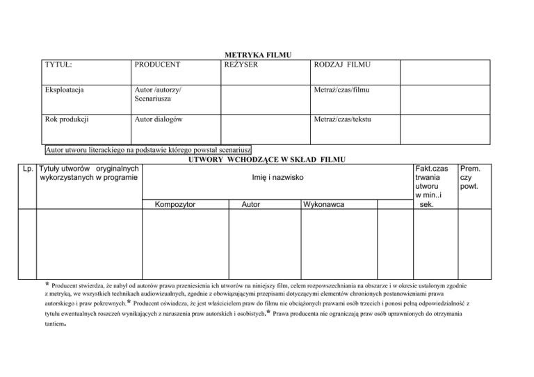 METRYKA FILMU REŻYSER TYTUŁ: PRODUCENT Eksploatacja Autor /autorzy/ Scenariusza Metraż/czas/filmu Rok produkcji Autor dialogów Metraż/czas/tekstu RODZAJ FILMU Autor utworu literackiego na podstawie którego powstał scenariusz UTWORY WCHODZĄCE W SKŁAD FILMU Lp. Tytuły utworów oryginalnych wykorzystanych w programie Imię i nazwisko Kompozytor Autor Wykonawca Fakt.czas trwania utworu w min..i sek. Prem. czy powt. * Producent stwierdza, że nabył od autorów prawa przeniesienia ich utworów na niniejszy film, celem rozpowszechniania na obszarze i w okresie ustalonym zgodnie z metryką, we wszystkich technikach audiowizualnych, zgodnie z obowiązującymi przepisami dotyczącymi elementów chronionych postanowieniami prawa autorskiego i praw pokrewnych.* Producent oświadcza, że jest właścicielem praw do filmu nie obciążonych prawami osób trzecich i ponosi pełną odpowiedzialność z tytułu ewentualnych roszczeń wynikających z naruszenia praw autorskich i osobistych.* Prawa producenta nie ograniczają praw osób uprawnionych do otrzymania tantiem.