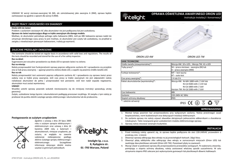 UWAGA! W wersji sieciowo-awaryjnej SA (M), ale zainstalowanej jako awaryjna A (NM), oprawa będzie zachowywać się zgodnie z opisem dla wersji A (NM). OPRAWA OŚWIETLENIA AWARYJNEGO ORION LED Instrukcja instalacji i konserwacji BŁĘDY PRACY I MOŻLIWOŚCI ICH DIAGNOZY Dioda LED nie świeci Problem z zasilaniem sieciowym AC albo akumulator nie jest podłączony lub jest uszkodzony. Oprawa nie świeci wystarczająco długo w trybie awaryjnym dla danego modelu Możliwe, że akumulator potrzebuje pełnego cyklu ładowania (48h). Jeśli po 48h ładowania oprawa nadal nie utrzymuje określonego czasu pracy to jest możliwe, że akumulator jest zużyty lub uszkodzony, na przykład w związku z niewłaściwym pierwszym ładowaniem, i należy go wymienić. ZALECANE PRZEGLĄDY OKRESOWE The luminaire should be tested on regular basis in accordance with valid laws and regulations. The results of the tests should be recorded and stored for the use of a fire safety inspector. Raz na dzień Sugerowane jest wizualne sprawdzenie czy dioda LED w oprawie świeci na zielono. Raz na miesiąc Należy przeprowadzić test funkcjonalności oprawy poprzez odłączenie zasilania AC i sprawdzenia czy przejdzie ona w tryb pracy awaryjnej – zgasnąć powinna zielona dioda LED, a zapalić się powinno źródło światła LED. Raz na rok Należy przeprowadzić test autonomii poprzez odłączenie zasilania AC i sprawdzenia czy oprawa świeci przez zadany czas w trybie pracy awaryjnej. Jeśli czas pracy w trybie awaryjnym nie jest odpowiedni należy naładować akumulator do pełna i przeprowadzić test ponownie. Jeśli test nadal wypada negatywnie, akumulator musi zostać wymieniony. UWAGI! Wszelkie usterki oprawy powstałe wskutek niestosowania się do niniejszej instrukcji spowodują utratę gwarancji. Zużyte, uszkodzone lampy łącznie z akumulatorami podlegają procesowi recyklingu. W związku z tym należy je przekazać do punktu zbiórki zużytego sprzętu elektrycznego i akumulatorów lub do producenta. ORION LED 4W ORION LED 7W OV DANE TECHNICZNE: Źródło światła (niewymienialne) *: Tryby pracy*: Funkcje testowania*: Czas pracy awaryjnej*: Pakiet akumulatorów (wymienialny)*: Czas ładowania: Zasilanie: Stopień ochrony obudowy: *- zależnie od wersji Wersja 4W: 10 x LED ; Wersja 7W: 41 x LED SA – praca sieciowo - awaryjna (M) lub A – praca awaryjna (NM) MT – test ręczny AT – auto test 1 h lub 3 h Wersja 4W: Ni-MH 1800 mAh / 3.6V lub Ni-Cd 4500 mAh / 2.4V lub Ni-Cd 1800 mAh / 3.6V Version 7W: Ni-Cd 1500 mAh / 3.6V 48h 220-240V AC 50Hz IP65 WPROWADZENIE 1. Postępowanie ze zużytym urządzeniem Zgodnie z ustawą z dnia 29 lipca 2005 roku o zużytym sprzęcie elektrycznym i elektronicznym oraz ustawą z dnia 24 kwietnia 2009 roku o bateriach i akumulatorach, niniejsze urządzenie, po zużyciu, ze względu na zawarte substancje niebezpieczne podlega zbiórce zużytego sprzętu elektrycznego i elektronicznego. Szczegółowe informacje dotyczące zbiórki można uzyskać w gminnych jednostkach. KTM 97144 - Instrukcja ORION LED, PL, ver.20160916 2. 3. Montaż lampy powinien być przeprowadzony przy wyłączonym zasilaniu. Należy przestrzegać zasad bezpieczeństwa, norm budowlanych oraz dotyczących instalacji elektrycznych. Do zasilania oprawy nie należy używać obwodów obciążonych jednocześnie odbiornikami o charakterze indukcyjnym. Takie rozwiązanie grozi uszkodzeniem modułu elektronicznego oprawy. Oprawę należy stosować wewnątrz budynków. INSTALACJA 1. Intelight Sp. z o.o. 8, Rydygiera str. 01 -793 Warsaw, Poland 2. 3. 4. Przed instalacją należy upewnić się, że oprawa będzie podłączana do sieci 220-240VAC przewodem o przekroju min. 1,5mm2. Otworzyć oprawę odkręcając dwa wkręty na jej przeciwległych końcach. Zdjąć klosz. Otworzyć płytę odbłyśnika albo odkręcając dwa wkręty w zaznaczonych miejscach (Orion LED) lub zwalniając dwa plastikowe zatrzaski (Orion LED 7W). Pozostawić płytę na zawiasach. Wyciąć otwór w podstawie oprawy dla przeprowadzenia przewodów zasilających. Po wykonaniu otworów, pamiętając o stopniu ochrony obudowy, należy zastosować właściwy sposób uszczelnienia. W celu utrzymania stopnia IP65 zalecane jest wykorzystanie gumowych lub plastikowych dławnic kablowych. 5. 6. 7. 8. 9. 10. 11. 12. 13. 14. 15. Zamontować podstawę oprawy do ściany lub sufitu tak, aby naklejka informacyjna była widoczna dla osób testujących oprawę w przyszłości. Przygotować kabel zasilający i podłączyć wszystkie przewody do odpowiadających im zacisków złączki zasilającej. Opis zacisków oprawy: L – przewód fazy stałej – kolor izolacji brązowy lub czarny; zasilanie, z którego ładowany jest akumulator; obecność sygnalizowana świeceniem diody LED na zielono N – przewód neutralny – kolor izolacji niebieski PE – przewód ochronny – kolor izolacji żółto-zielony PRACA AWARYJNA. Aby oprawa pracowała w trybie awaryjnym, zasilanie sieciowe AC należy podłączyć do odpowiednich zacisków: L (faza) and N (neutralny). Należy zawsze pamiętać o podłączeniu przewodu ochronnego (PE). Oprawa powinna być zasilona w sposób ciągły – zanik napięcia powoduje jej przejście w tryb awaryjny. PRACA SIECIOWO-AWARYJNA. Jeśli chcemy, aby oprawa pracowała w trybie sieciowo-awaryjnym, zasilanie sieciowe AC należy podłączyć do odpowiednich zacisków: L (faza) and N (neutralny). Należy zawsze pamiętać o podłączeniu przewodu ochronnego (PE). Dodatkowo należy wykonać zworę pomiędzy zaciskami ZW1 oraz ZW2 (dla wersji 4W) lub pomiędzy zaciskami L i L1 (dla wersji 7W i niektórych 4W) lub pomiędzy zaciskami L i ZW1 (dla niektórych wersji 4W). Zanik fazy L powoduje automatyczne przejście oprawy w tryb awaryjny. Zastąpienie zwory łącznikiem światła umożliwia równoległe wykorzystanie oprawy także do oświetlenia podstawowego. Należy pamiętać o wpisaniu daty instalacji na naklejce znajdującej się na bateri